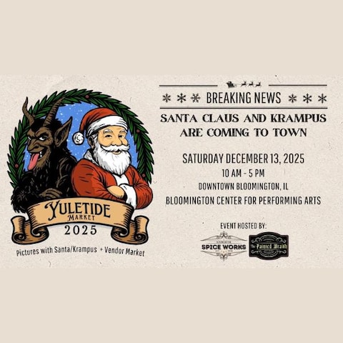 Since 2022, The Painted Wraith has hosted the Krampus Market in Downtown Bloomington, IL. In 2024, the Mistletoe Market was created and held on the same day in Downtown Bloomington. This year, they are combining both events under one roof, more vendors, a picture with Santa or Krampus (or both), and a new name...Yuletide Market! They will have the ballroom at the BCPA split in half with curtains...Santa & vendors on one side, Krampus & more vendors on the other. Join us for this Yuletide fun!