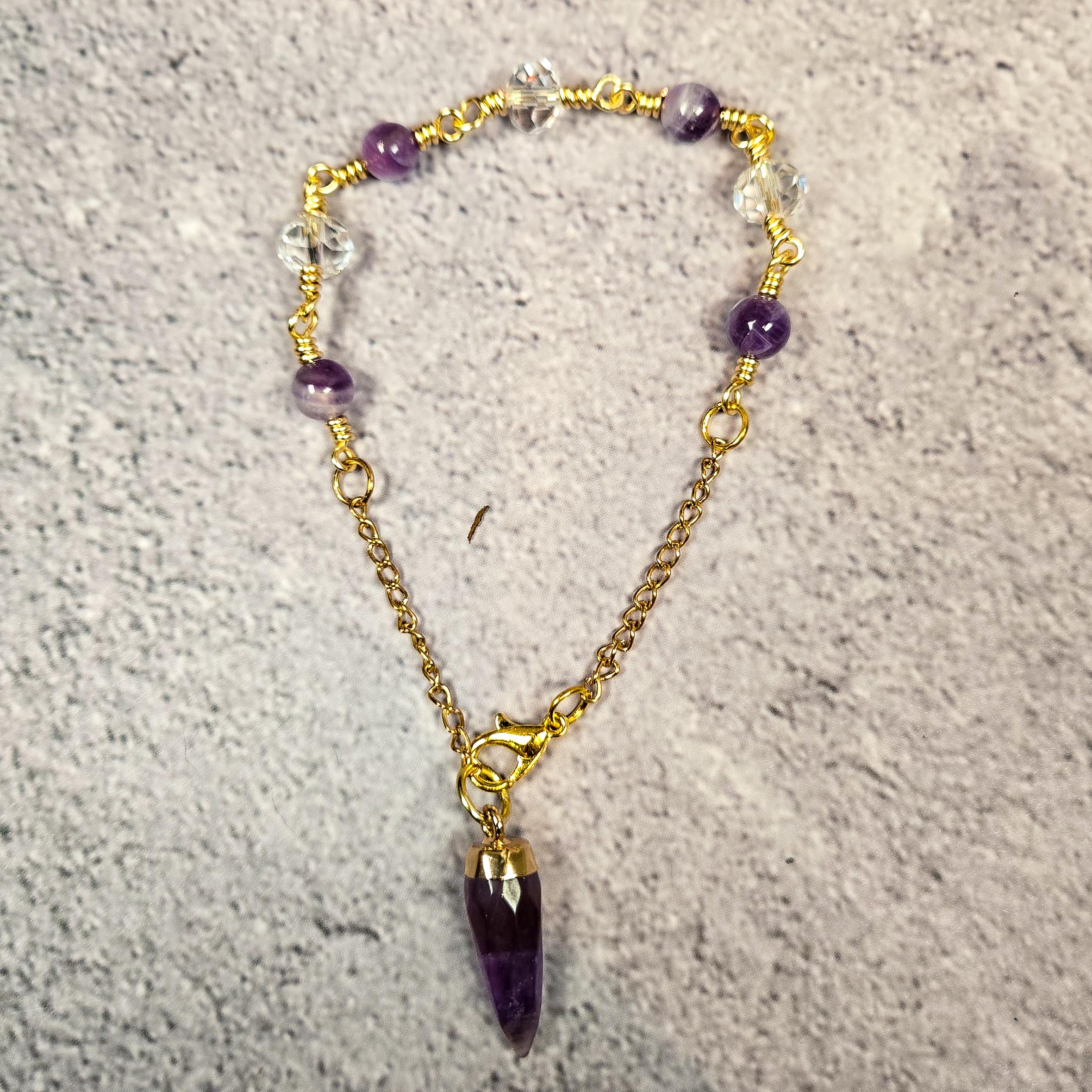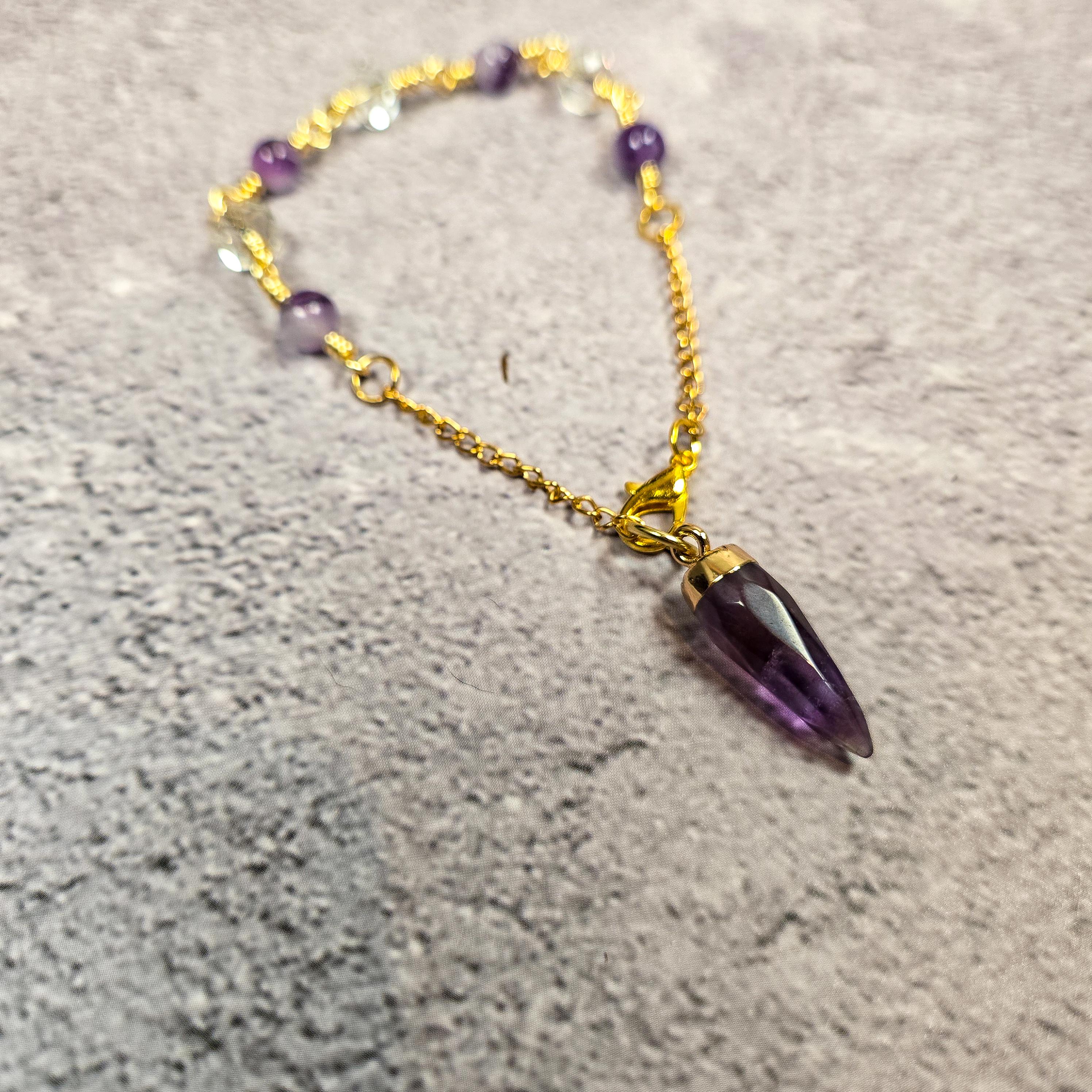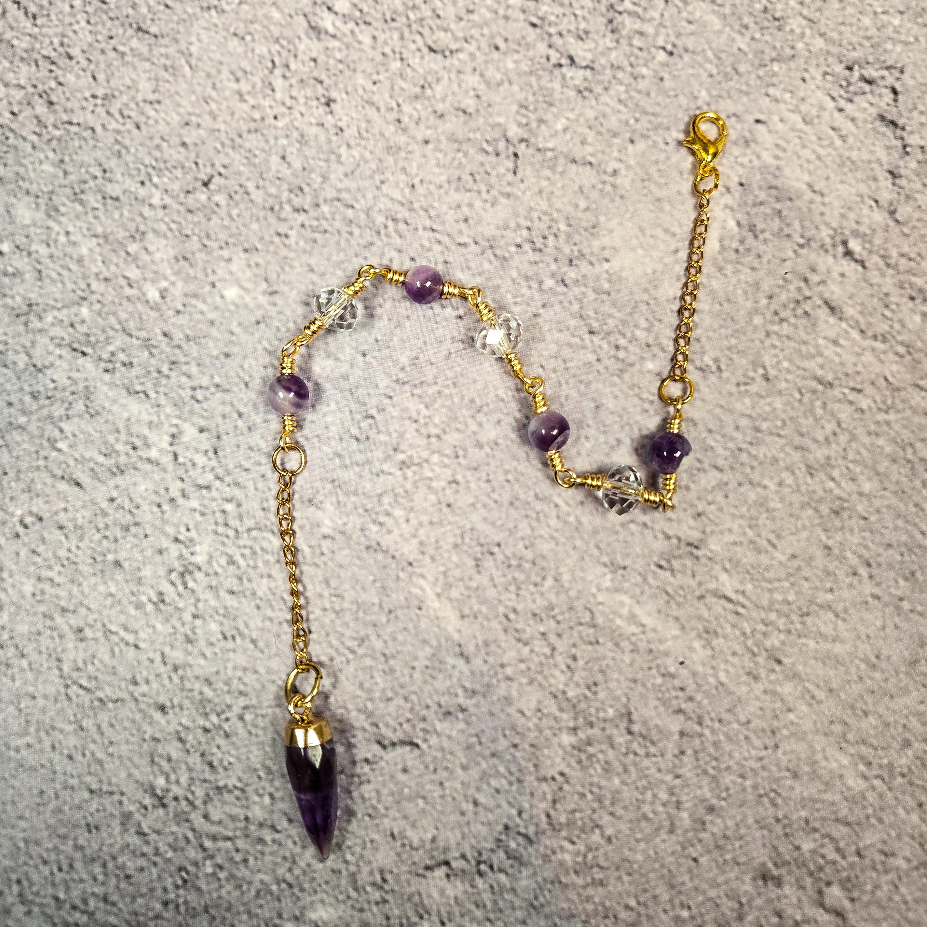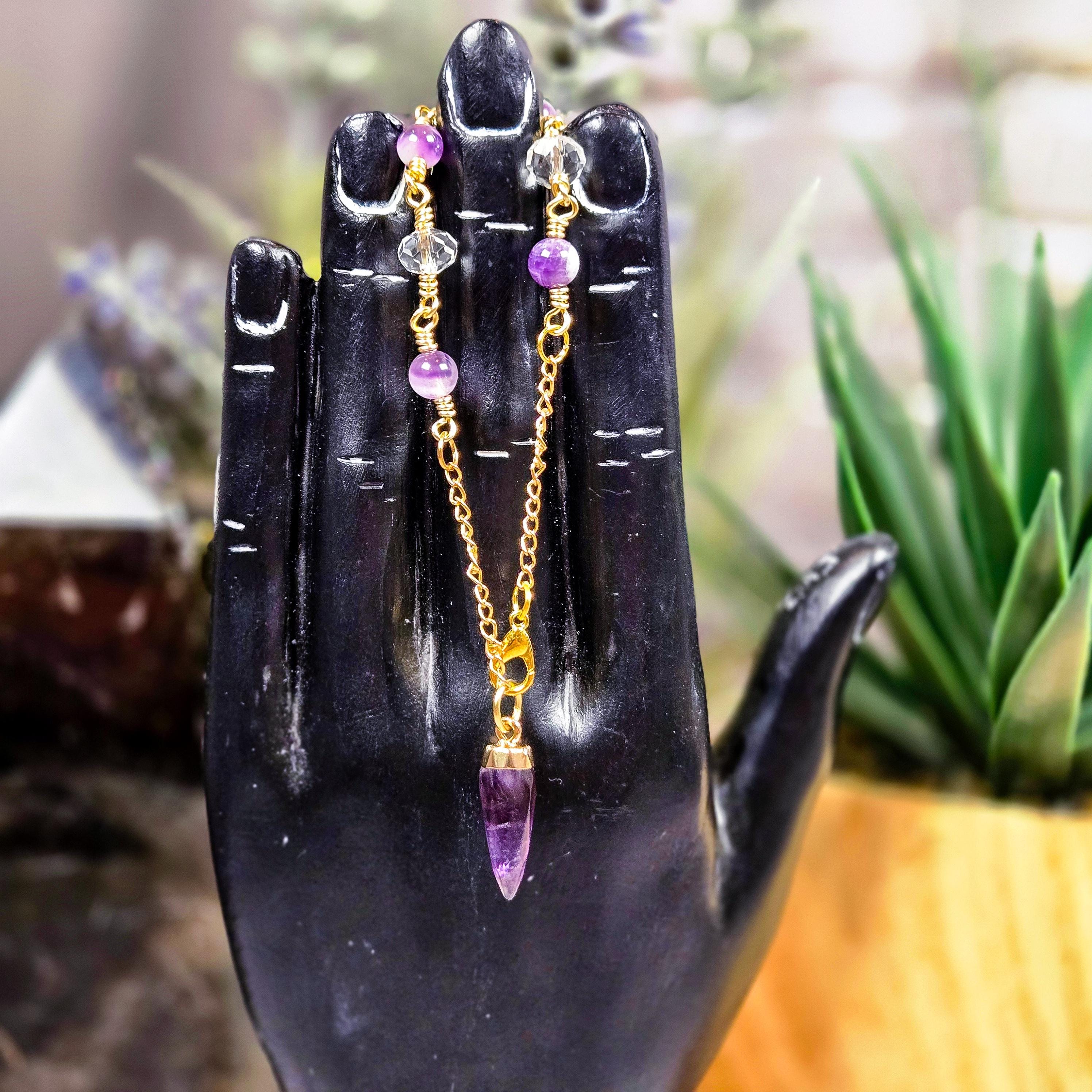 This handcrafted pendulum bracelet combines elegance and spiritual utility. Featuring an amethyst pendulum point with matching amethyst beads on a gold-tone chain, it is both a beautiful piece of jewelry and a functional divination tool.