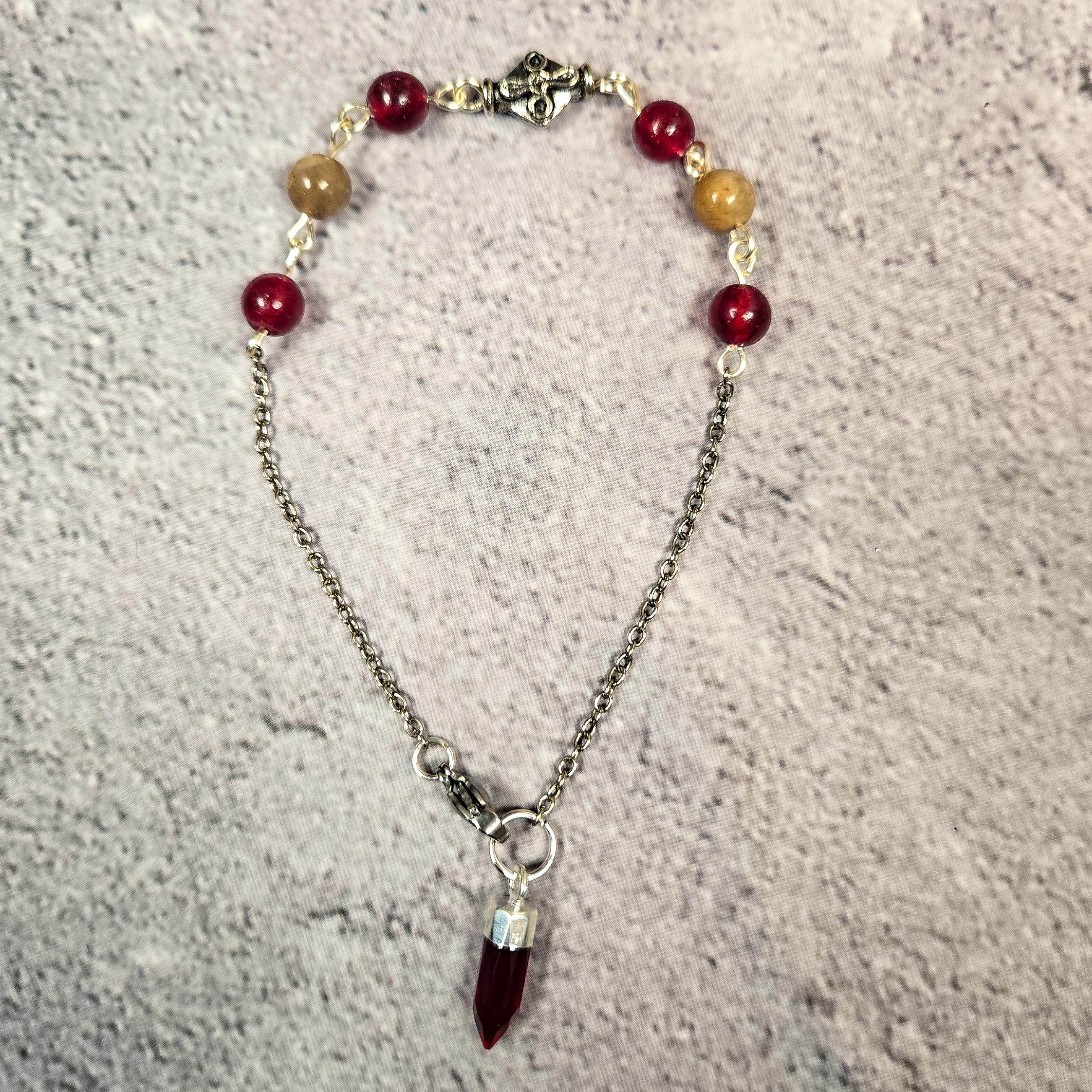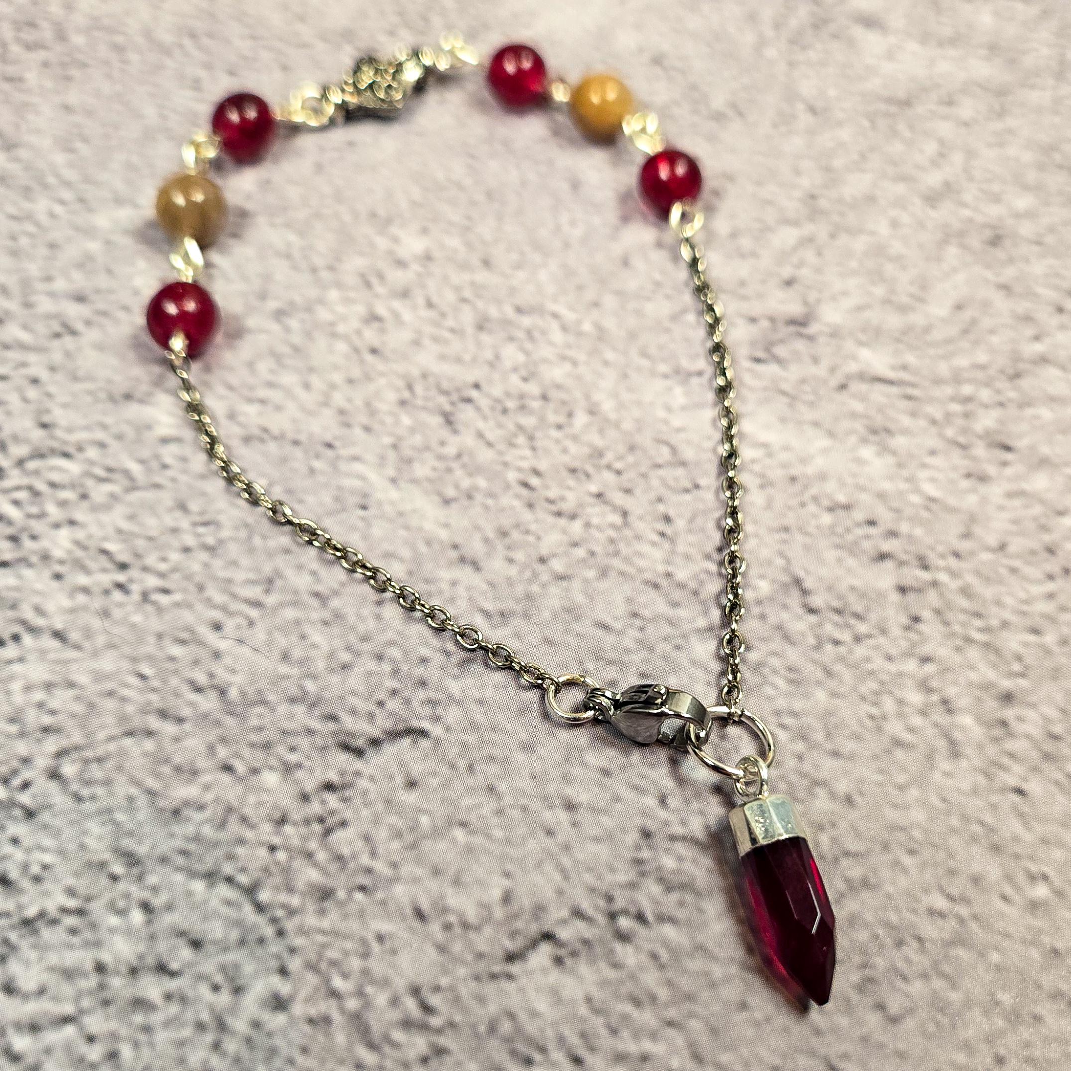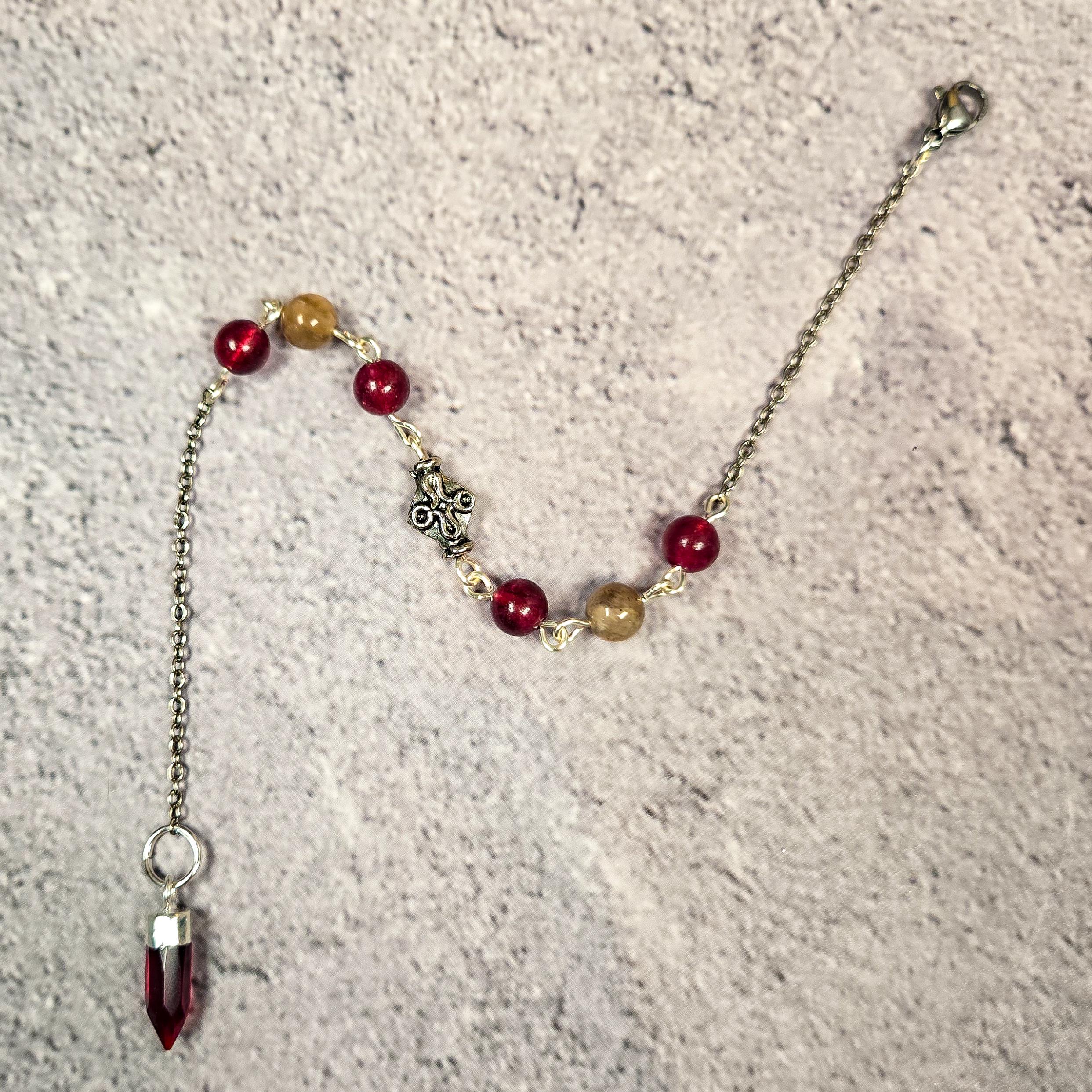 Harness potent intuition and passionate energy on the go with this unique Garnet & Black Moonstone Pendulum Bracelet! This captivating piece seamlessly blends the elegance of a bracelet with the insightful guidance of a pendulum. Deep red Garnet beads, known for their ability to energize, revitalize, and promote courage and passion, are paired with mesmerizing Black Moonstone beads, revered for their connection to the divine feminine, inner knowing, and intuitive development. At the end, a gracefully dangling Garnet point acts as your pendulum, ready to swing and offer answers whenever you seek them. Simply hold the bracelet gently and allow the pendulum to move. When not in use for divination, this enchanting bracelet can be comfortably worn around your wrist as a reminder of your inner wisdom and fiery spirit, a truly stylish and energetically powerful accessory. Embrace both beauty and intuition with this wearable divination tool!