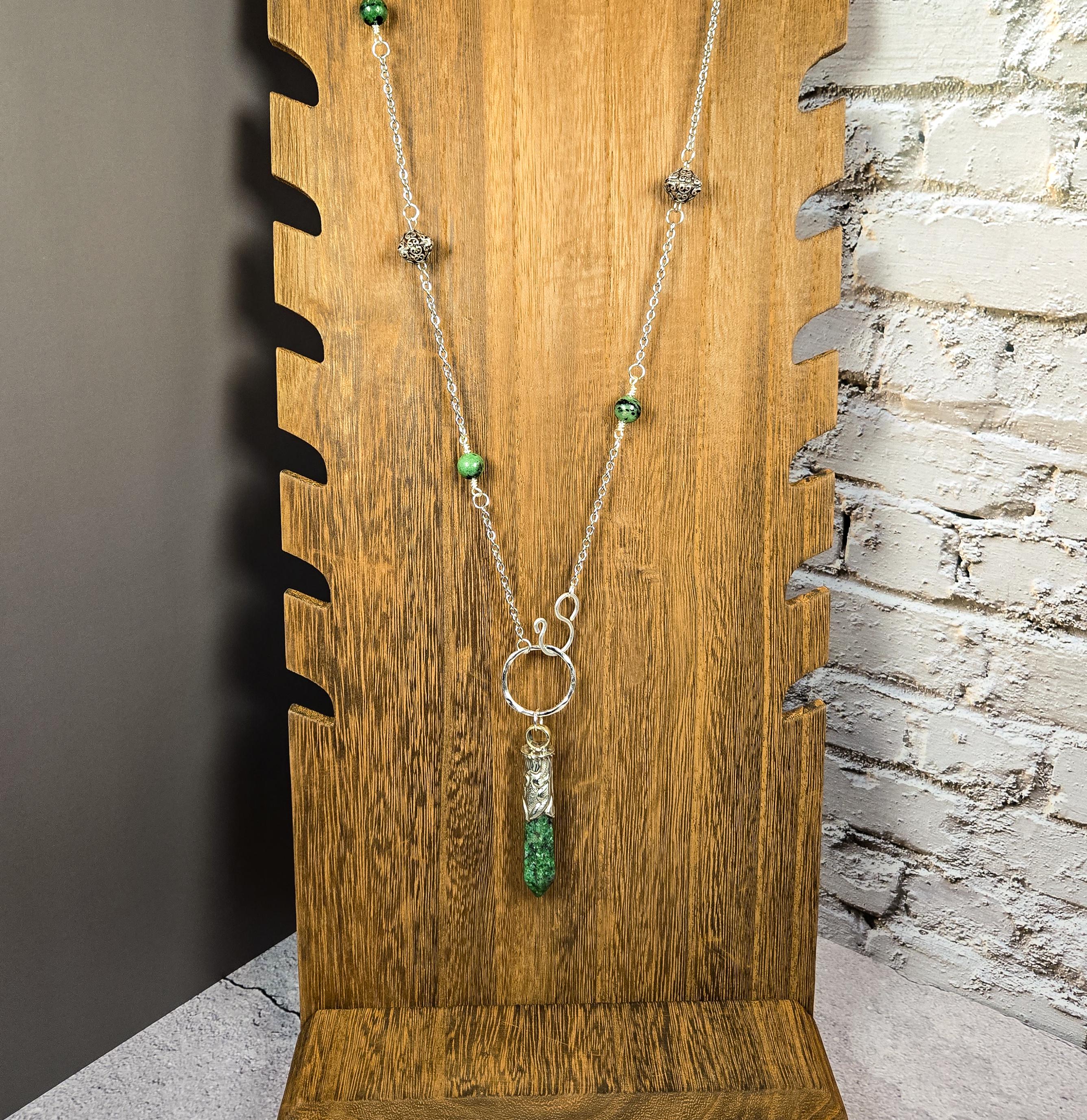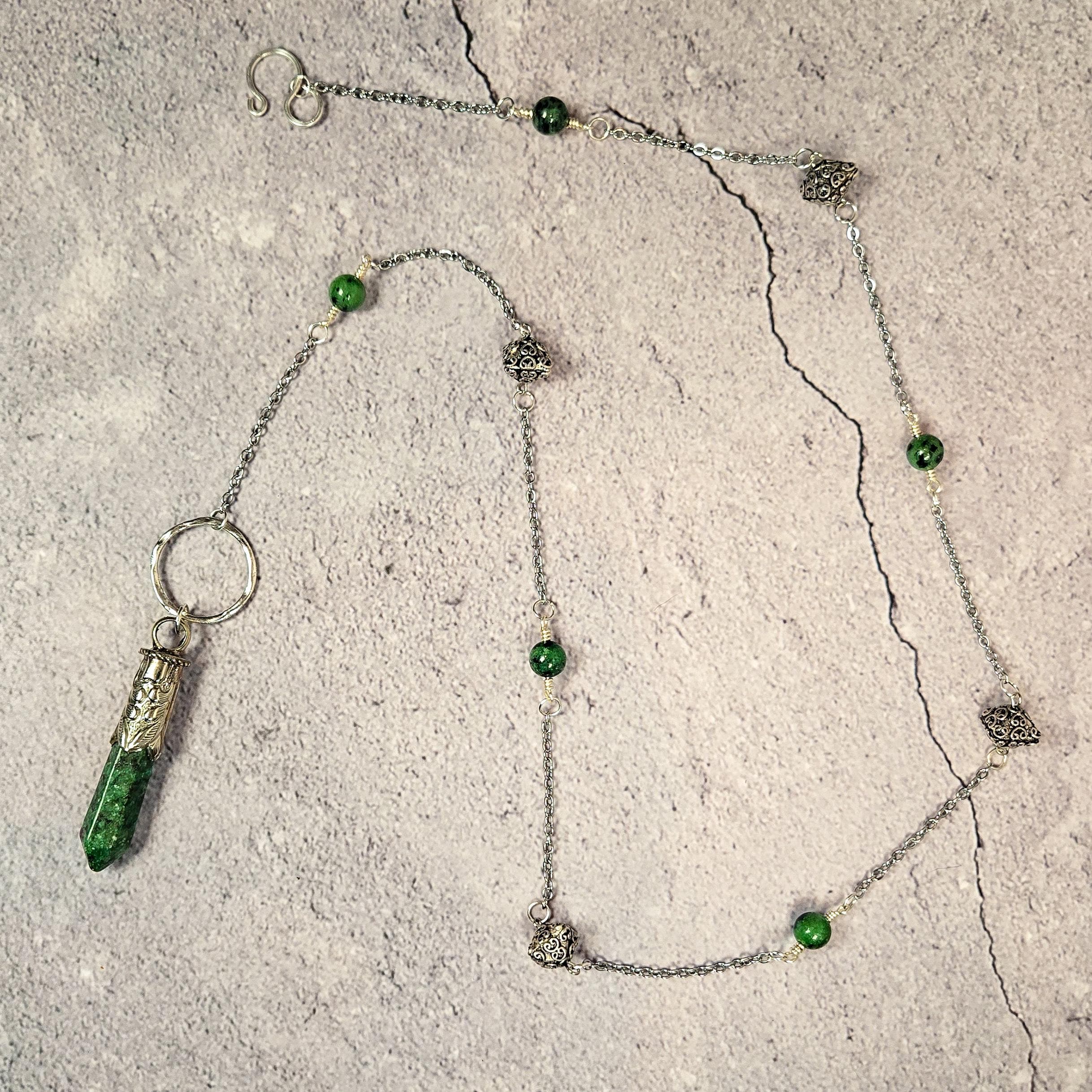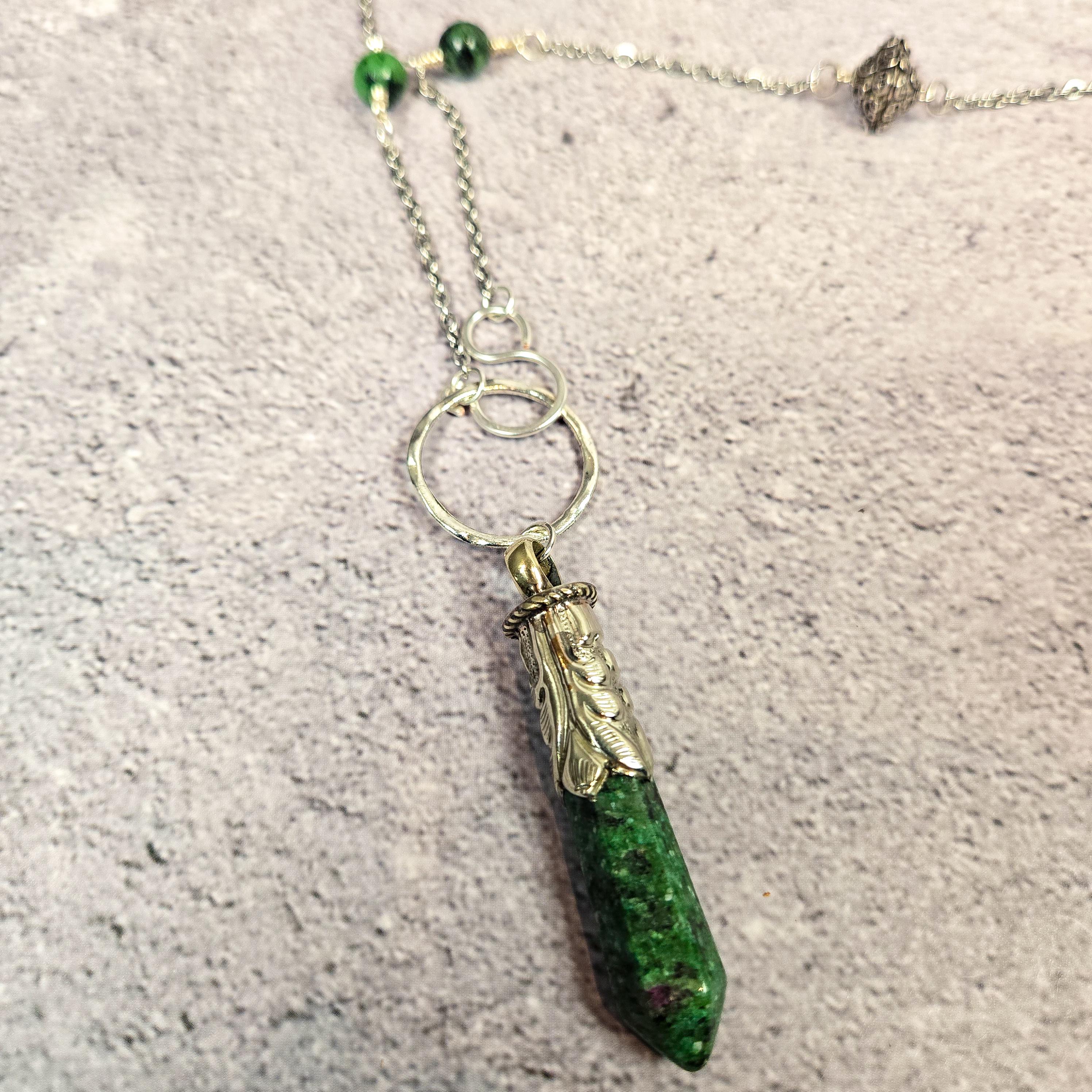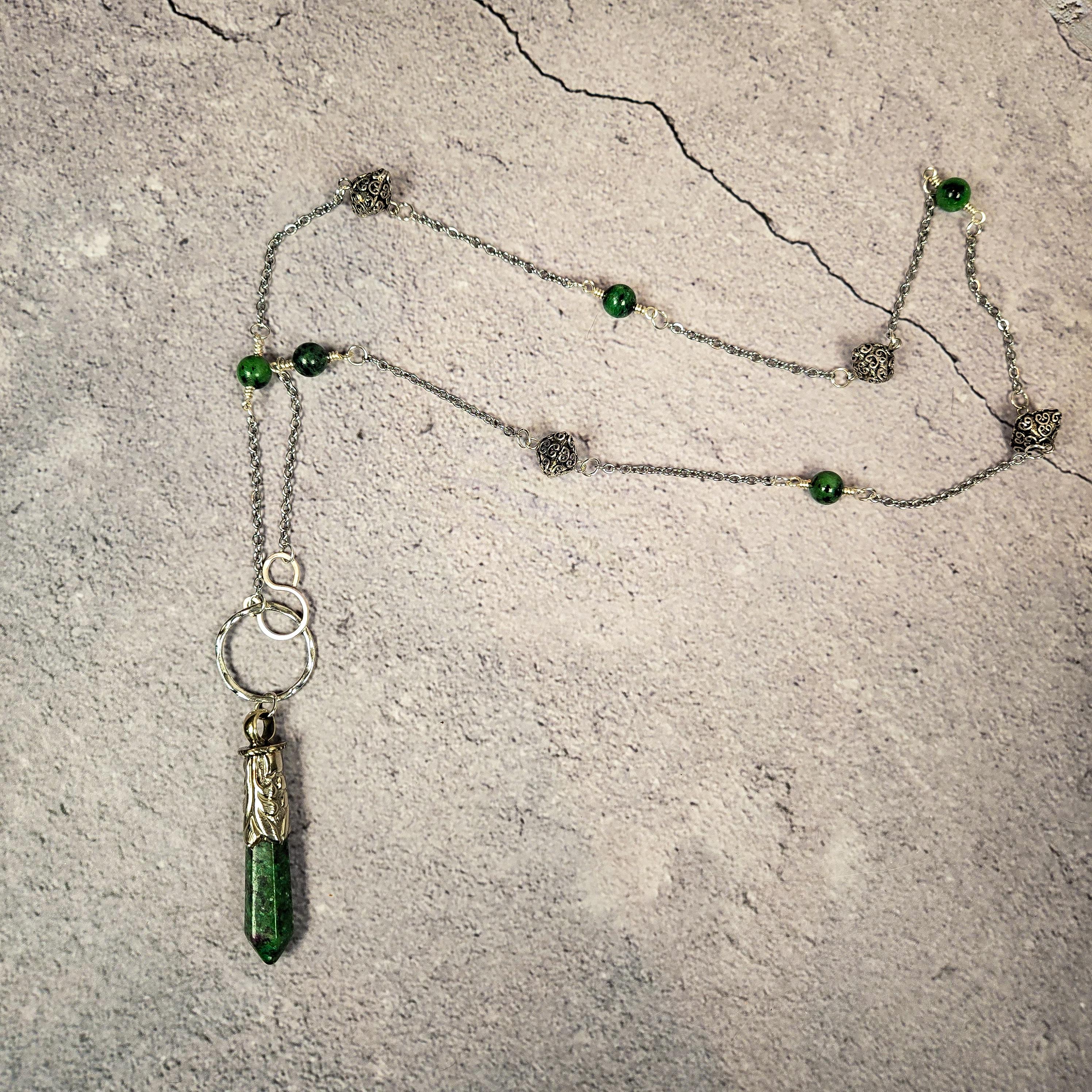 Channel vitality, passion, and purpose with this striking Ruby Zoisite Pendulum Necklace. Crafted to inspire transformation and heart-led action, this unique piece features rich ruby zoisite beads along the chain and a matching ruby zoisite pendulum point, making it a powerful talisman for both everyday wear and spiritual work.