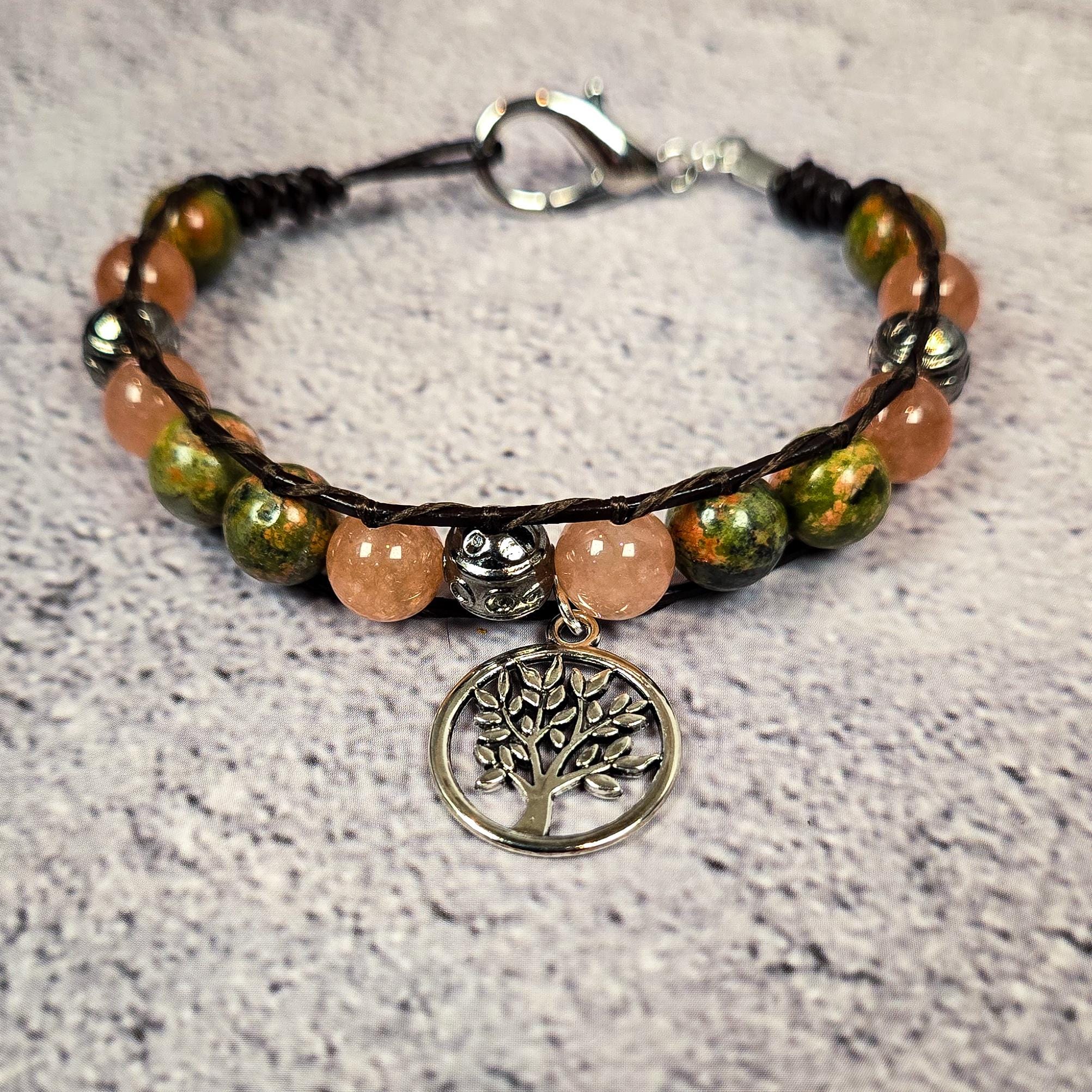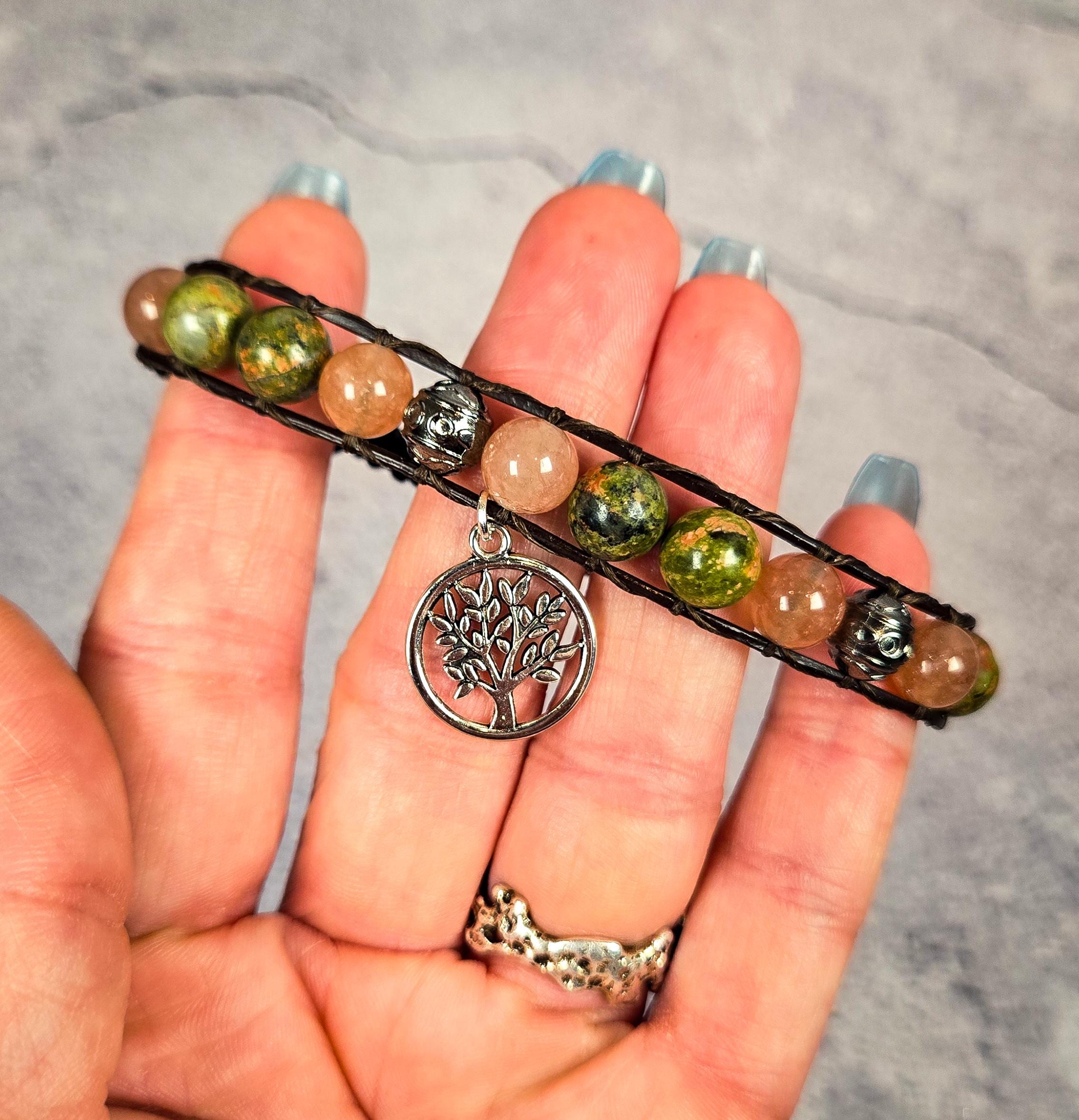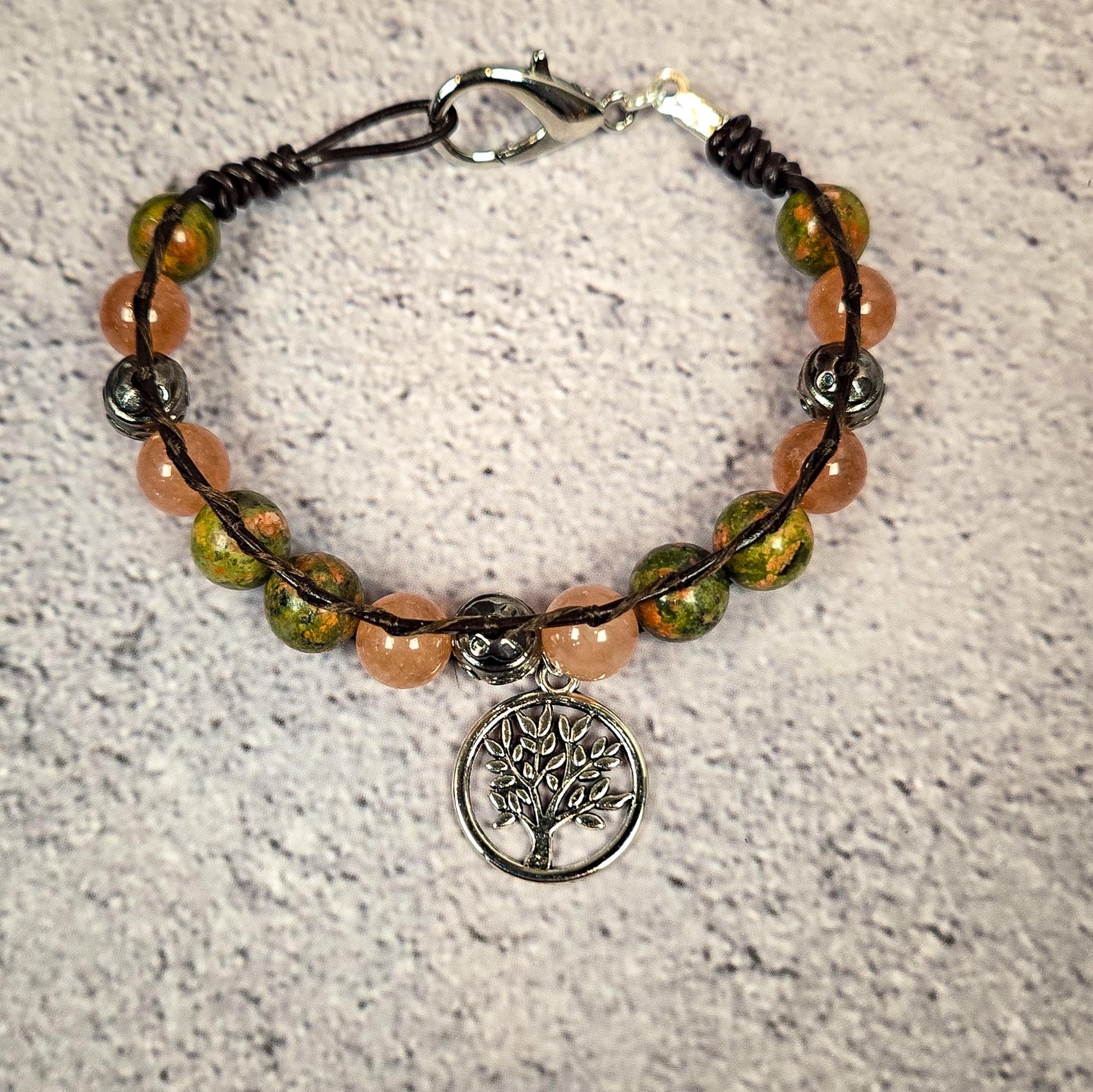 This handmade leather wrap bracelet is crafted with unakite and sunstone beads, representing growth, renewal, and radiant vitality. The design is completed with a silver-tone Tree of Life charm — a timeless symbol of grounding, connection, and the cyclical nature of existence.