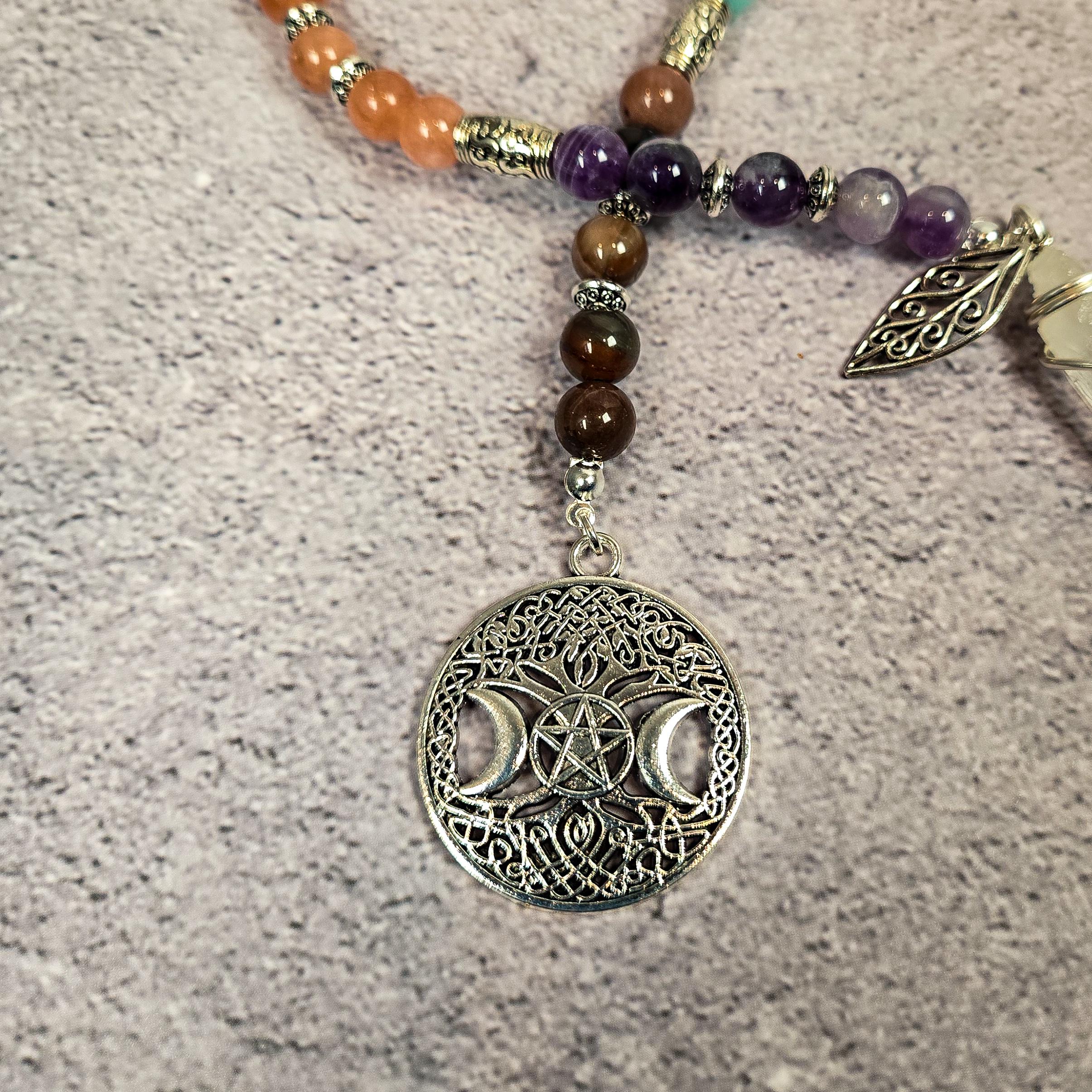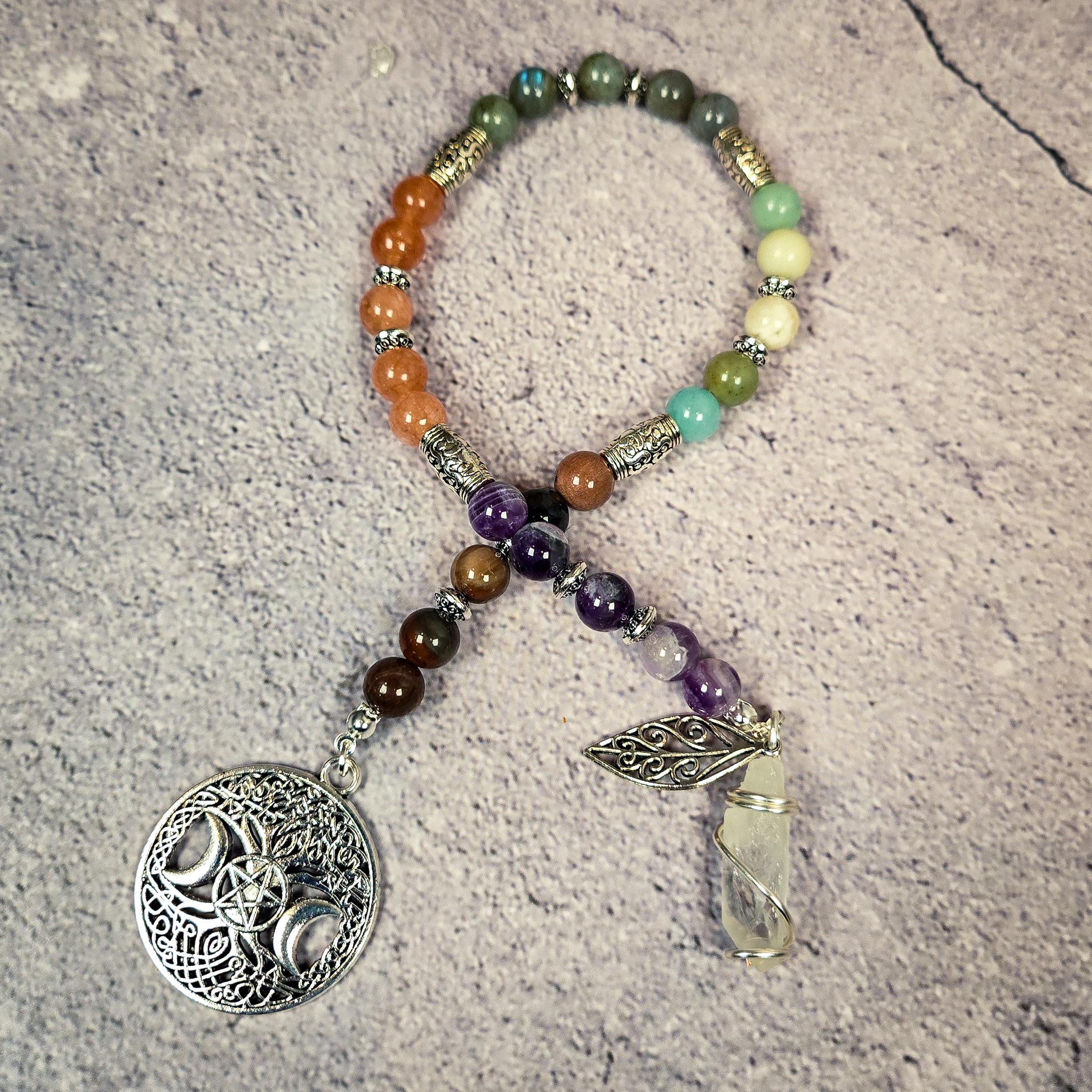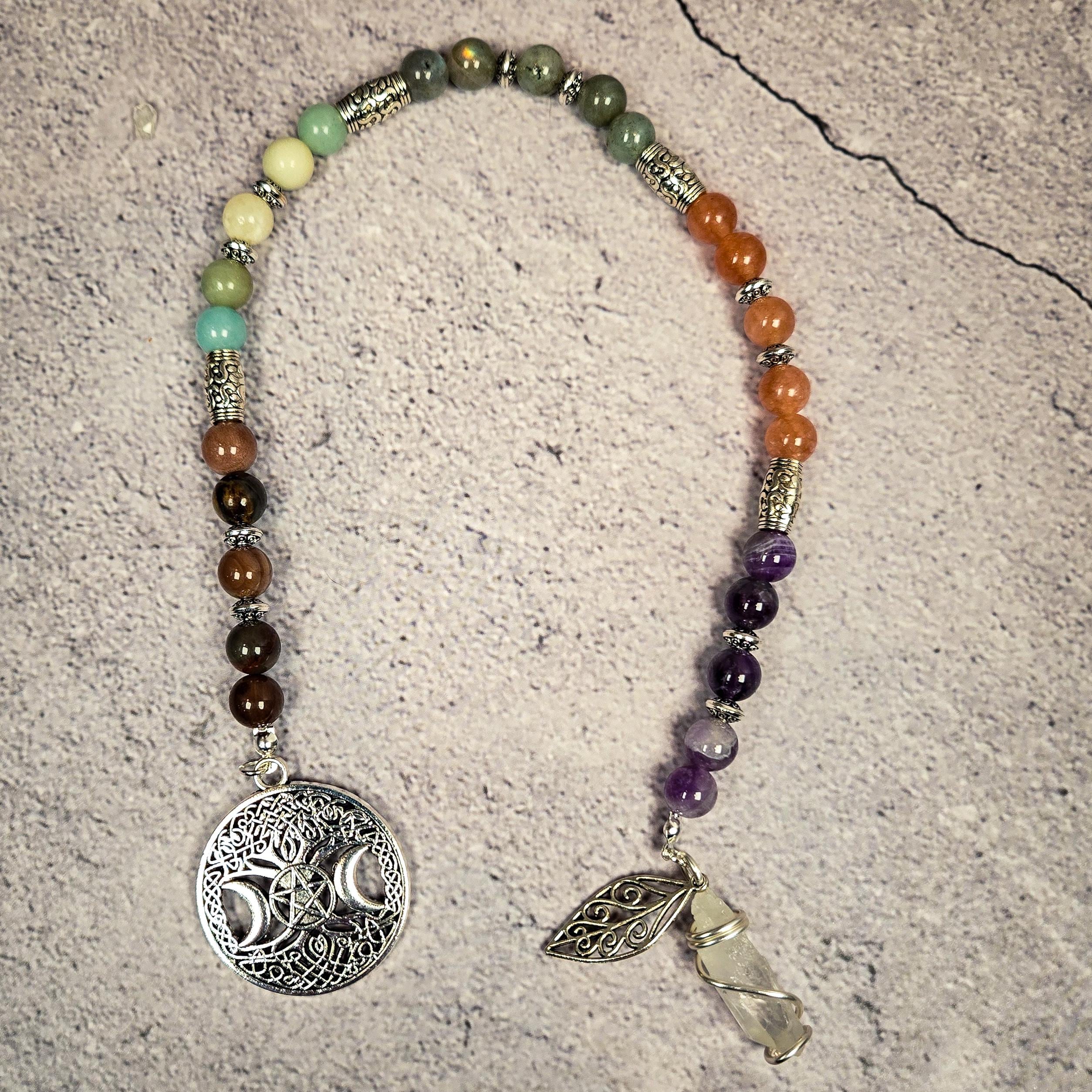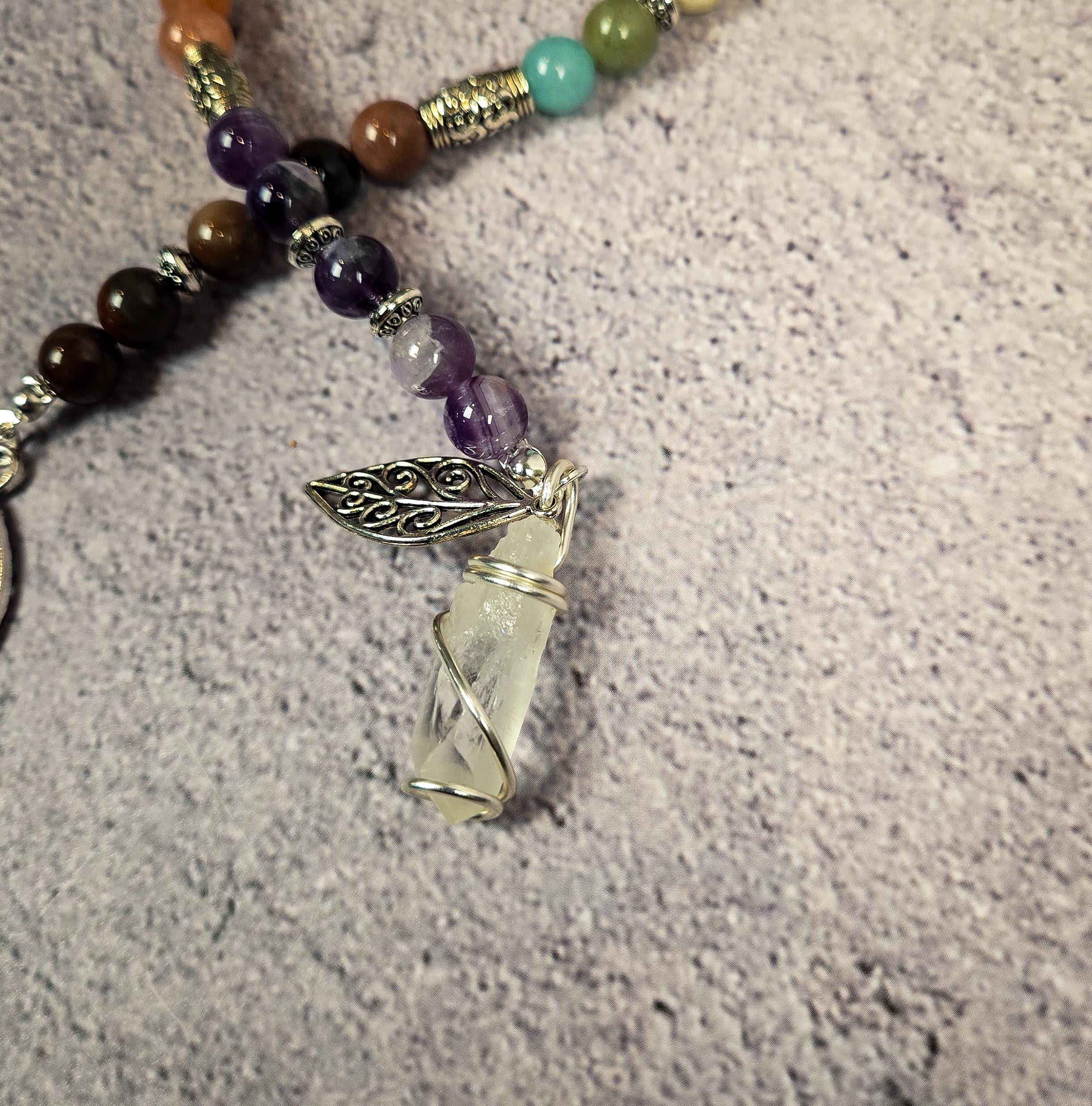 Introducing our Five Element Prayer Beads handcrafted with Amethyst, Sunstone, Labradorite, Amazonite, and Petrified Wood beads. This unique creation serves as a profound tool for balancing and connecting with the fundamental forces that shape our universe.