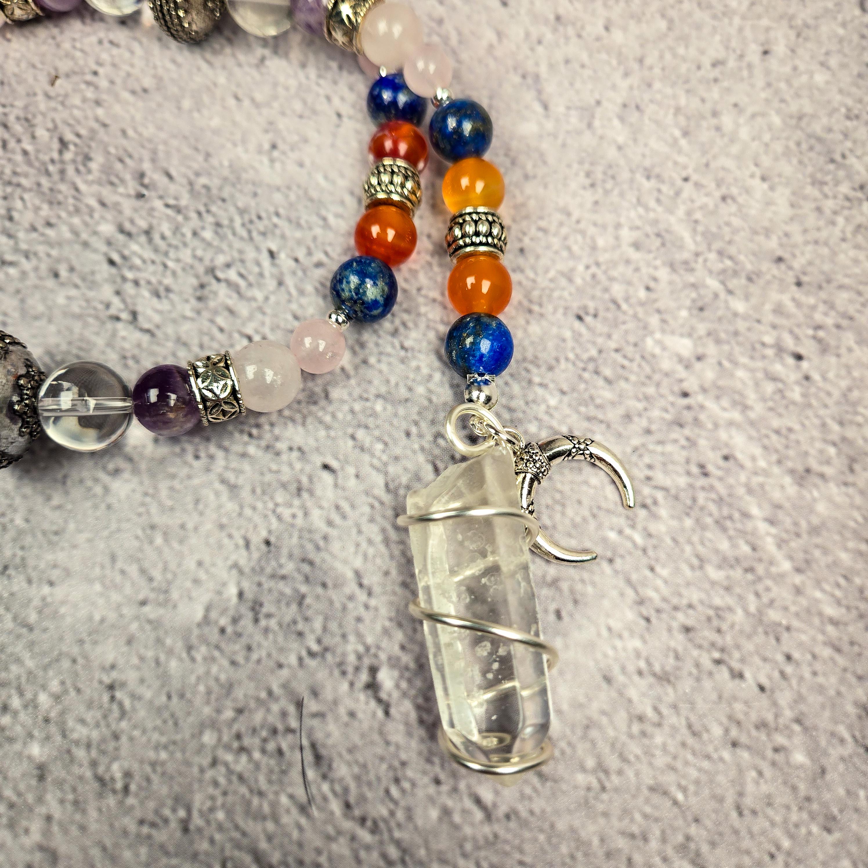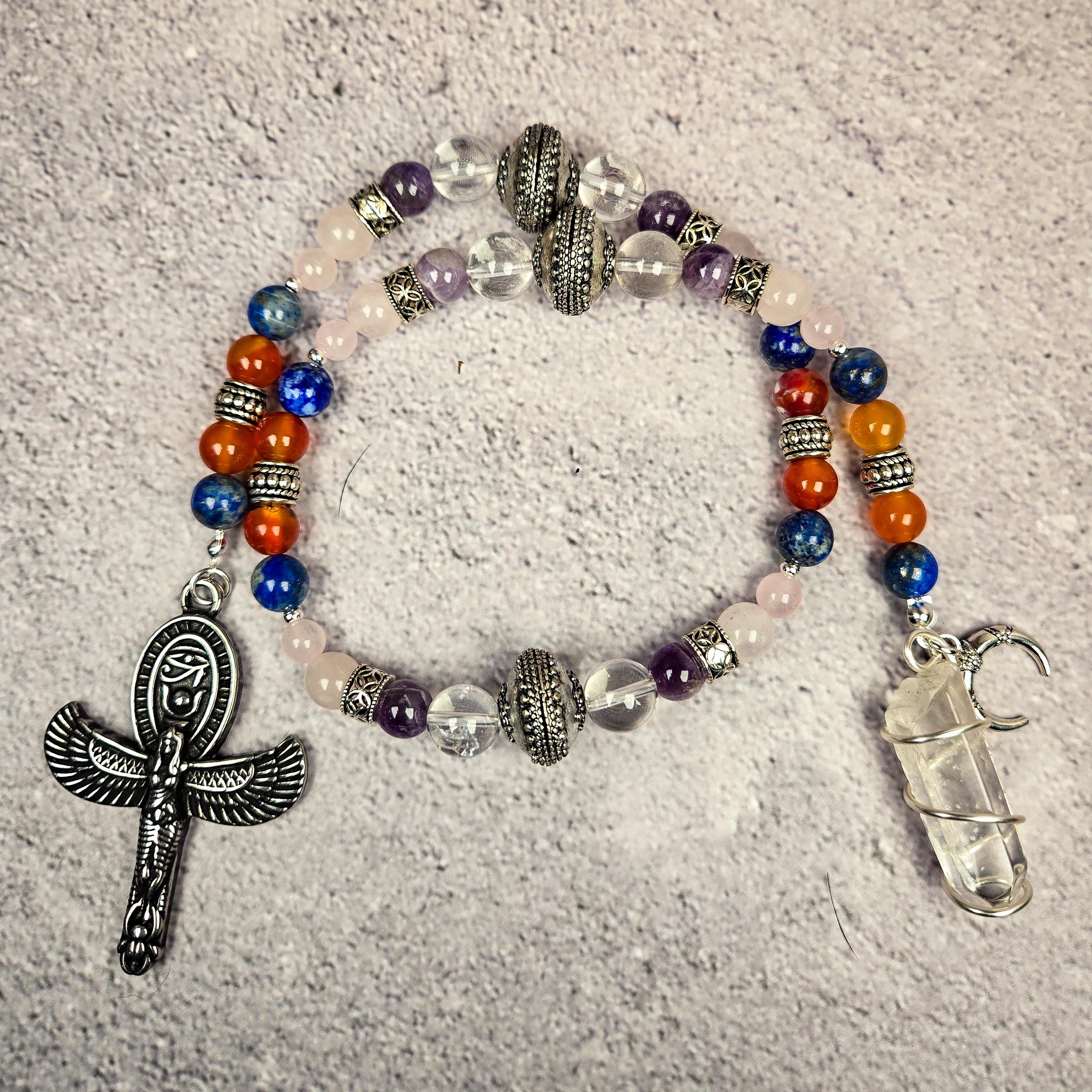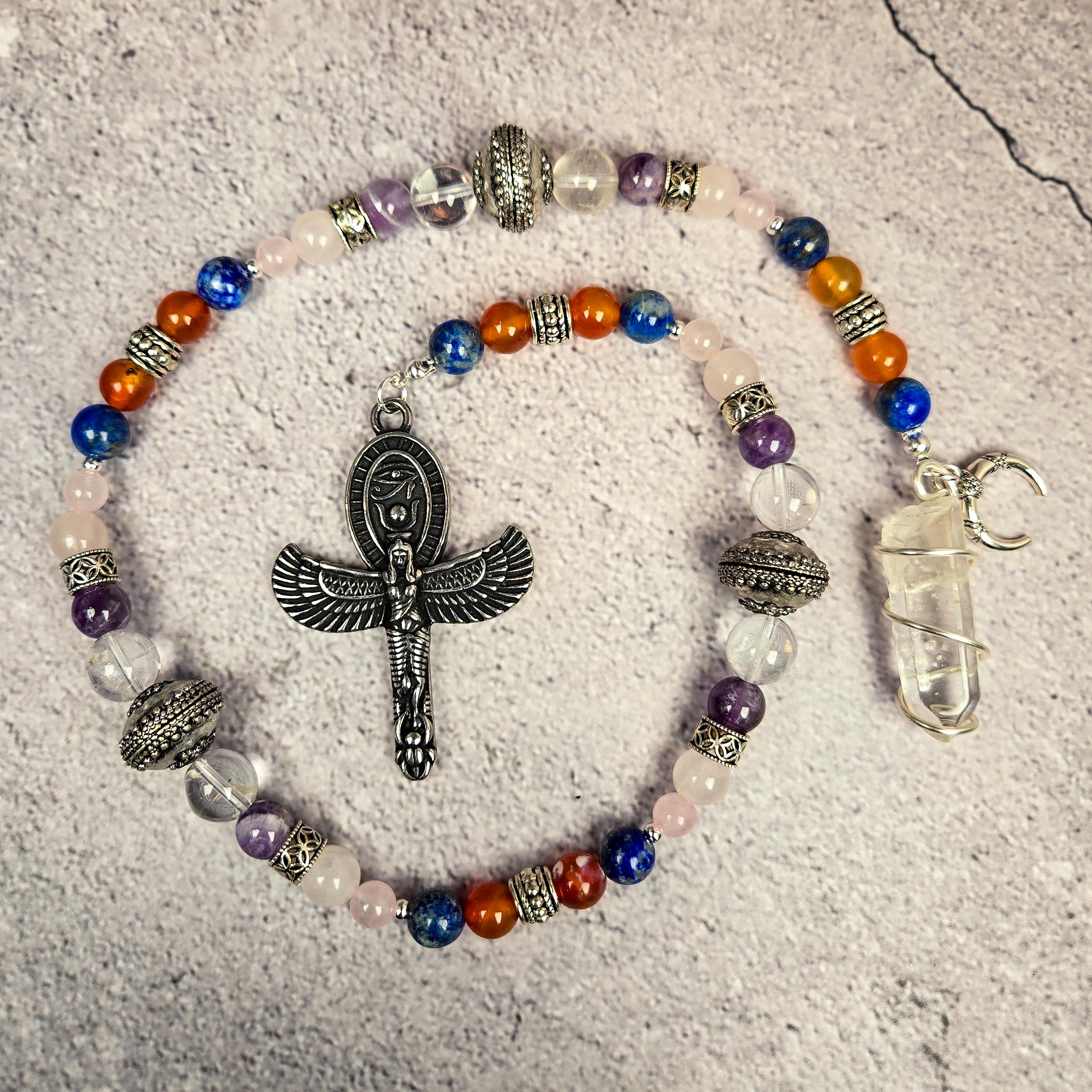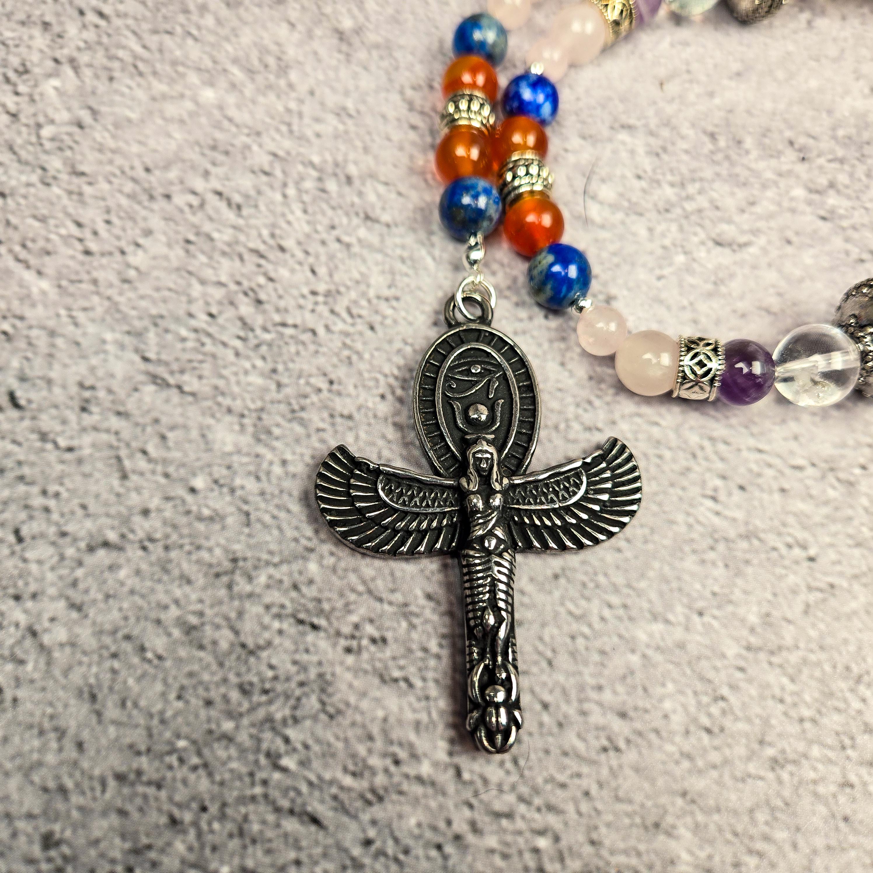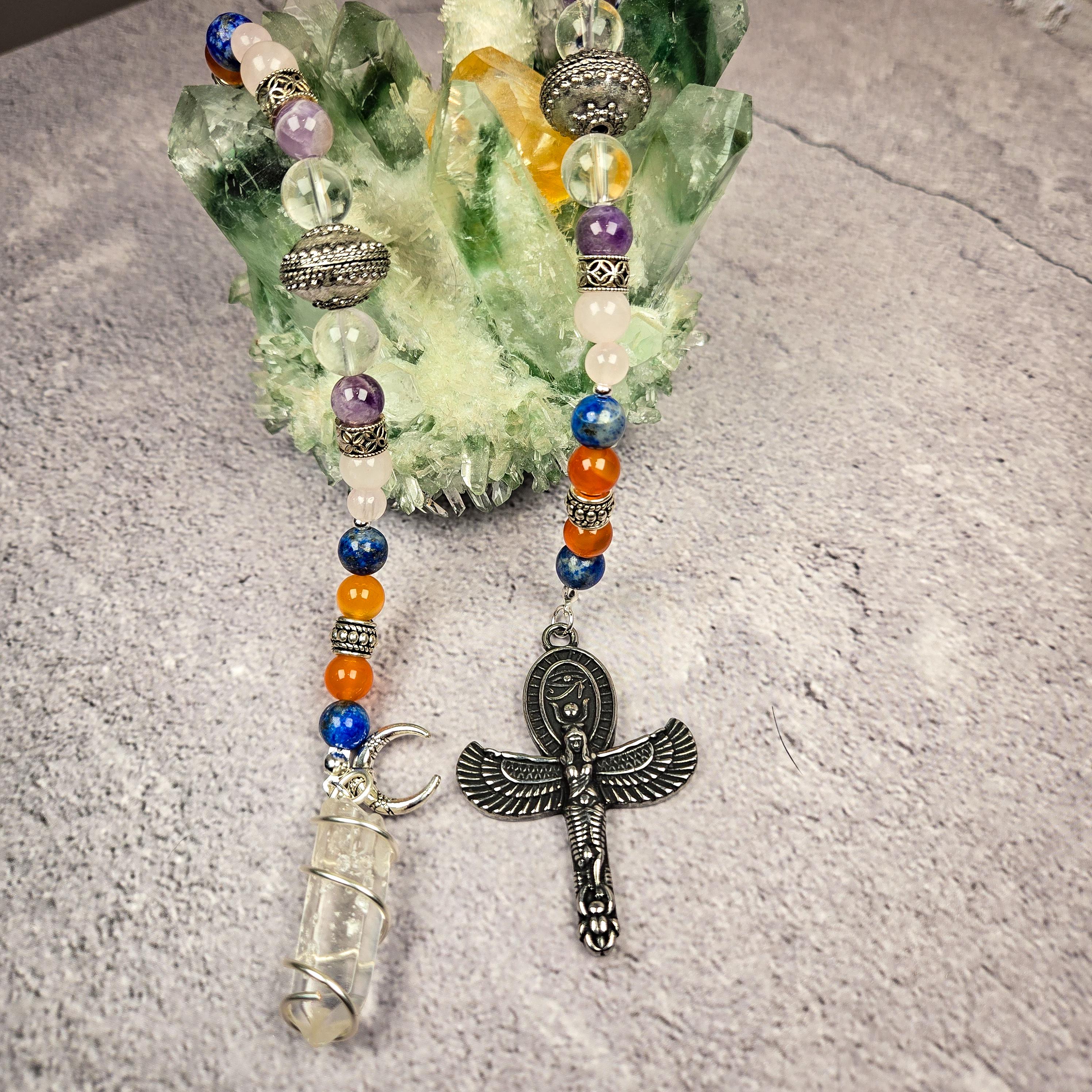 Honor the nurturing and transformative energy of the Egyptian goddess Isis with this stunning prayer bead set. Handcrafted with a blend of powerful gemstones—carnelian, lapis lazuli, amethyst, rose quartz, and clear quartz—this set is designed to support healing, spiritual growth, and protection, all while connecting you to the divine wisdom and love of Isis.
