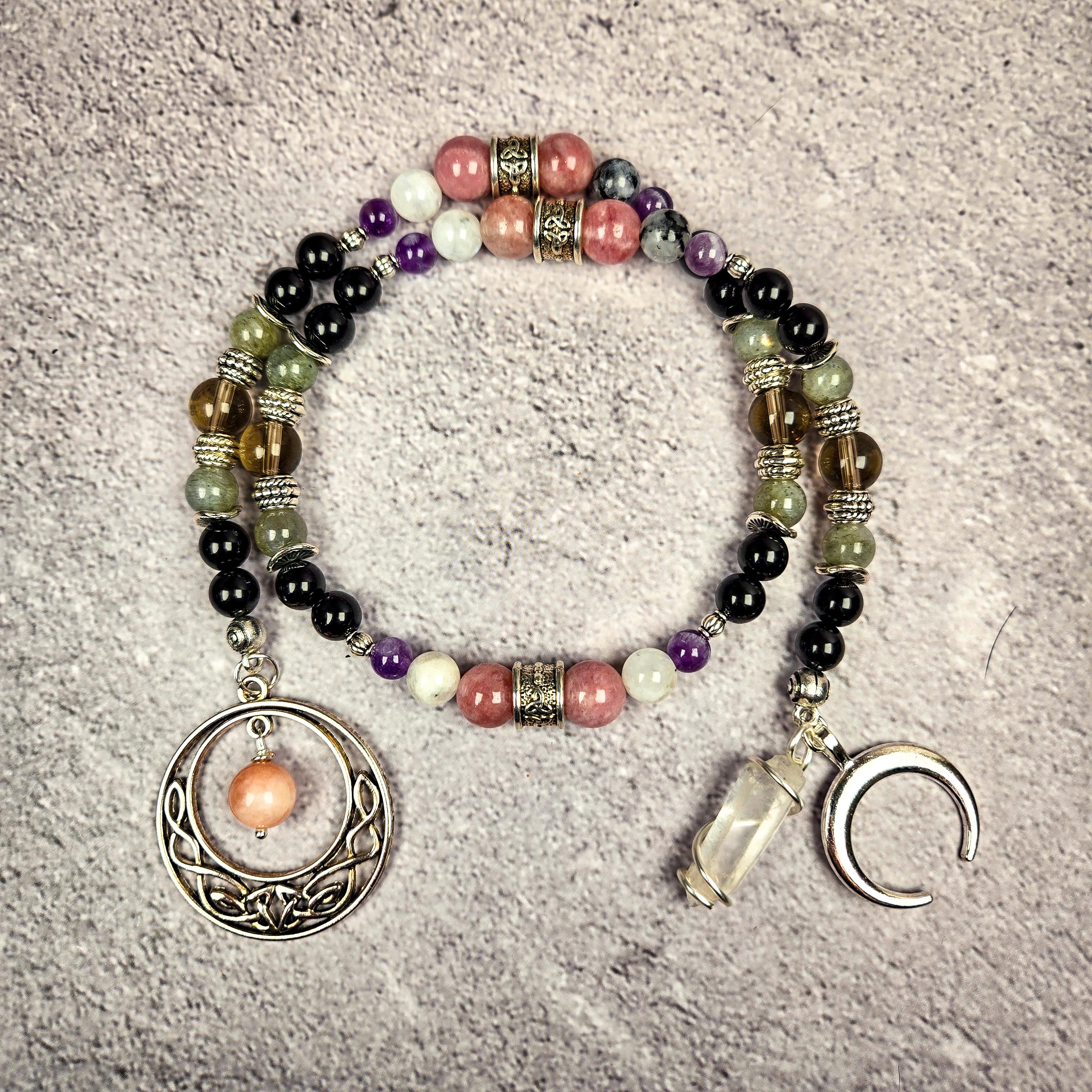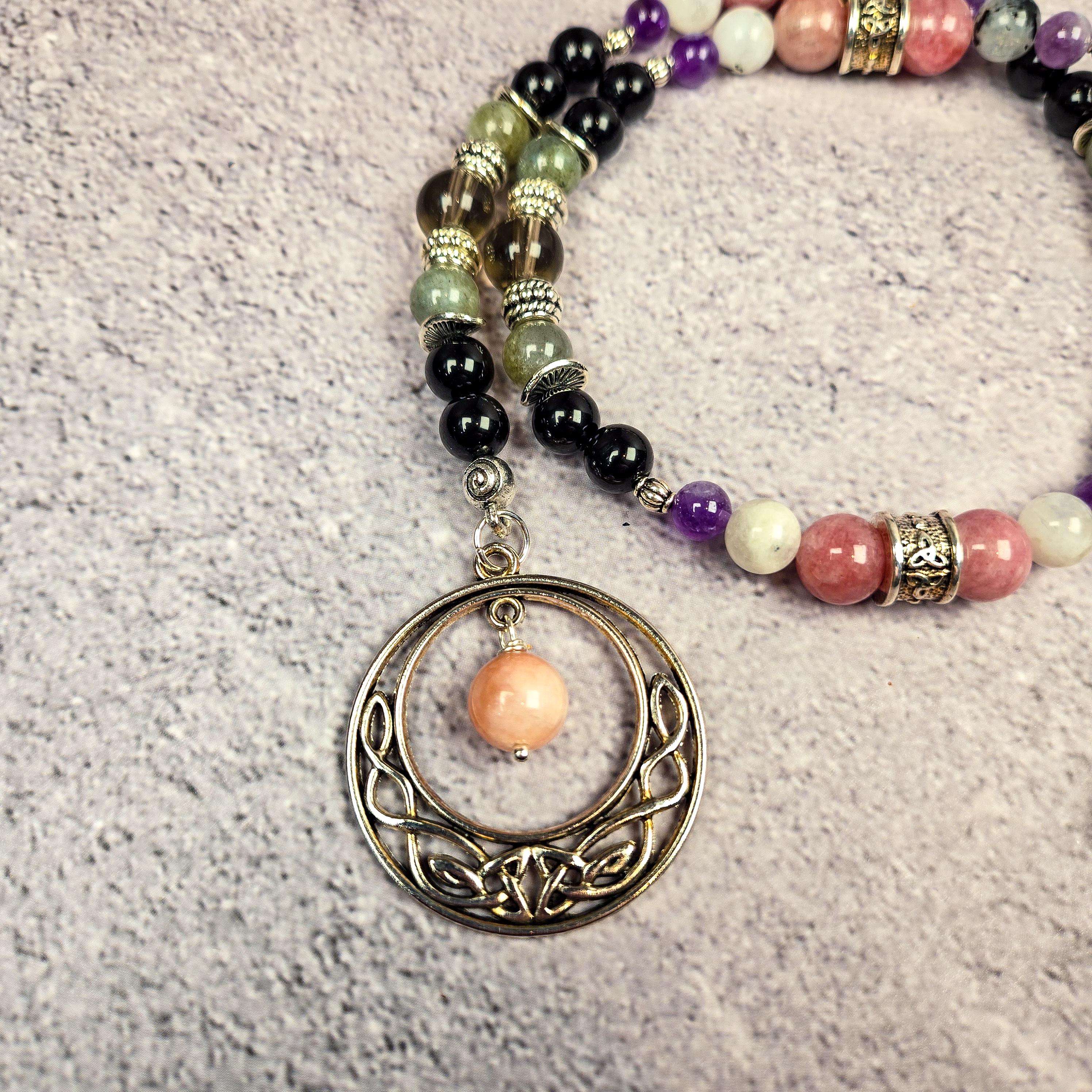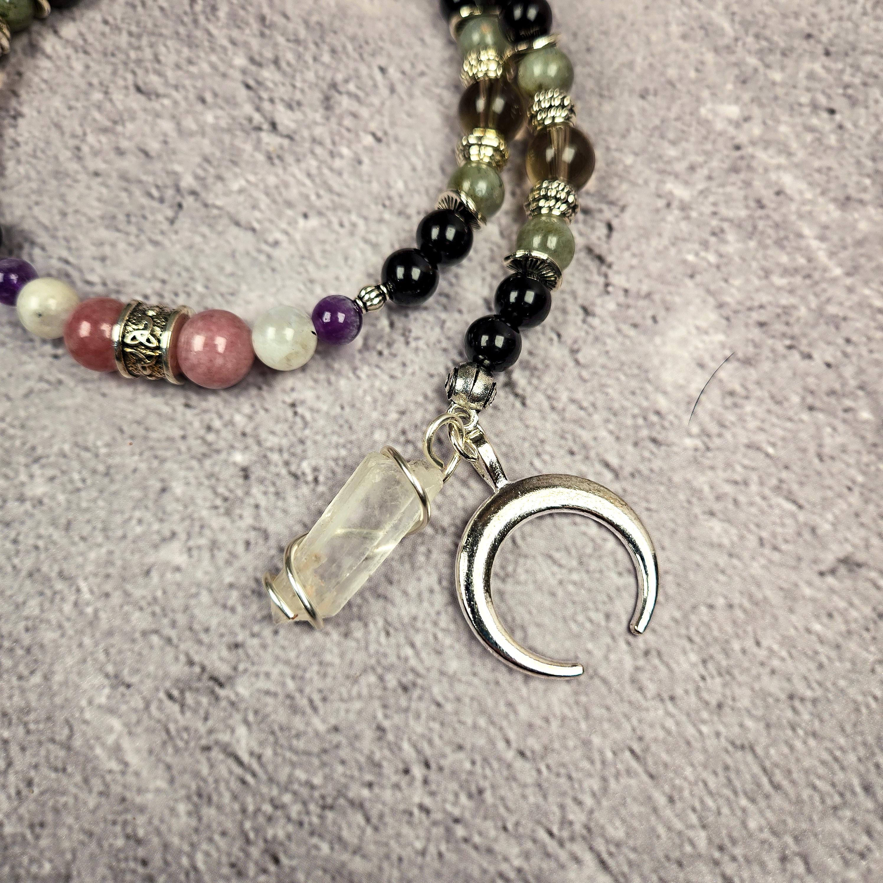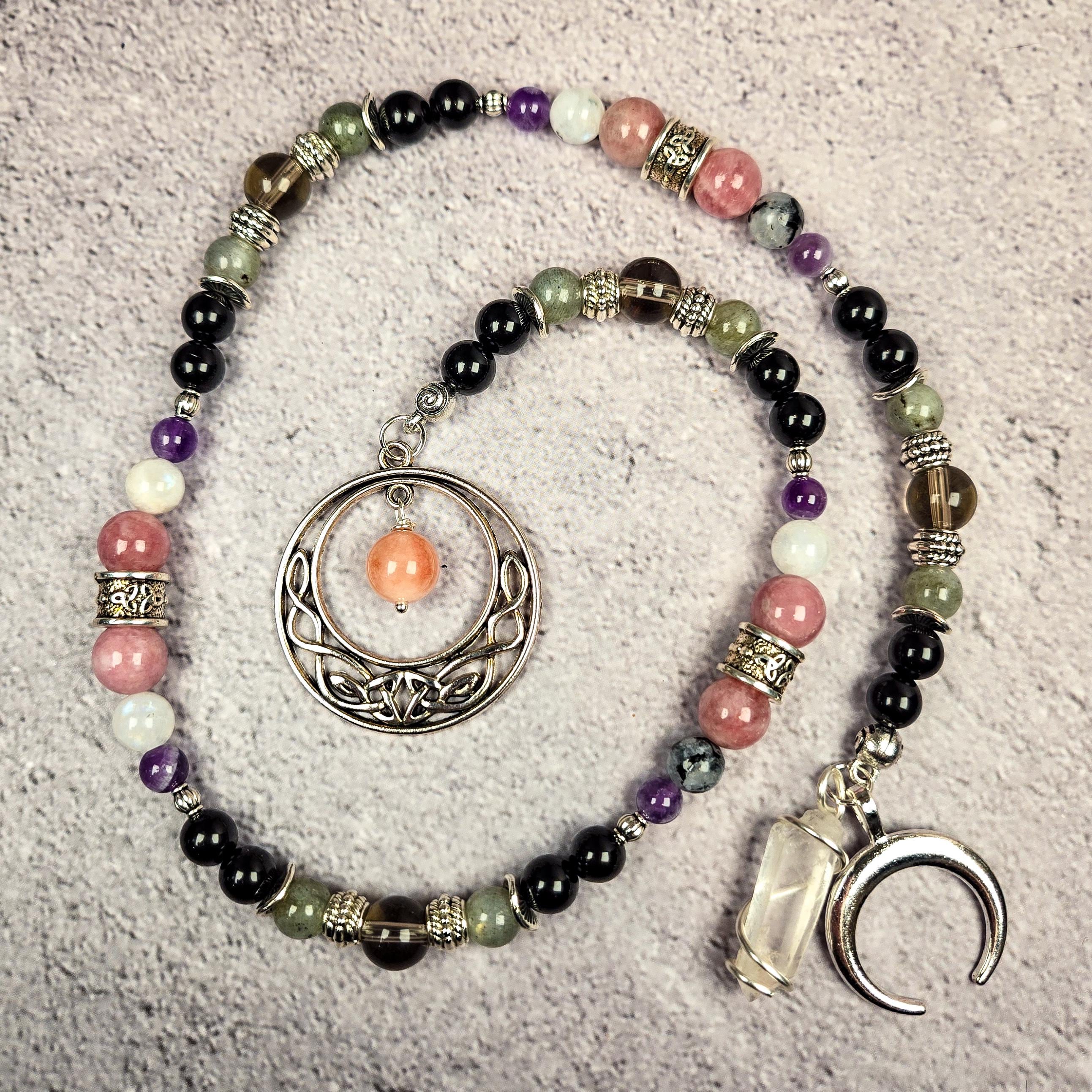 These prayer beads were created in honor of Cerridwen, the Celtic goddess of transformation, wisdom, and inspiration. Keeper of the sacred cauldron, she presides over the cycles of death and rebirth, creativity, and divine knowledge. This set embodies her alchemy—the dance between light and shadow, intuition and intellect, mystery and revelation.