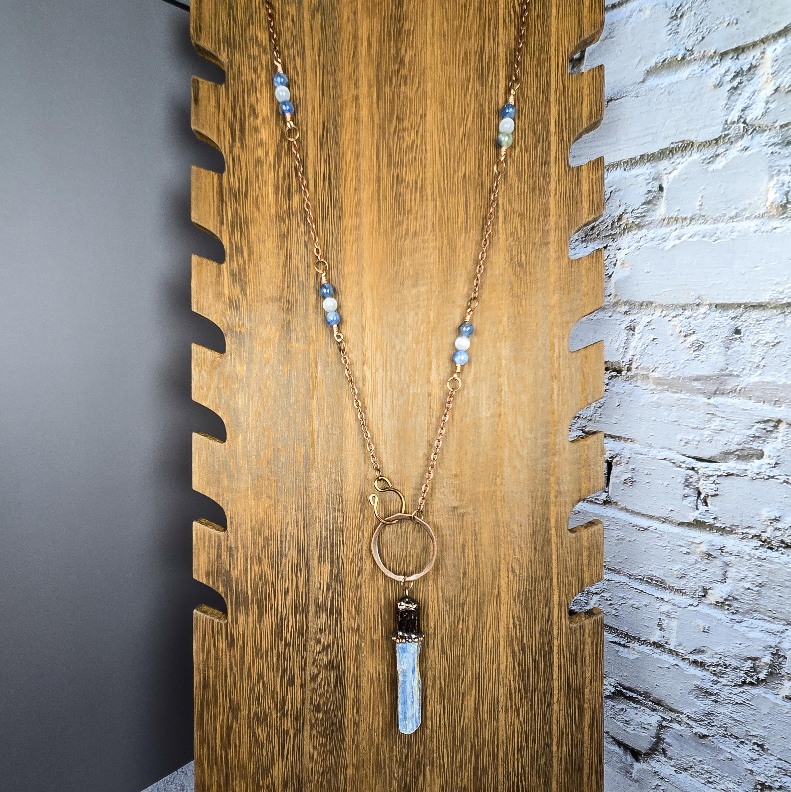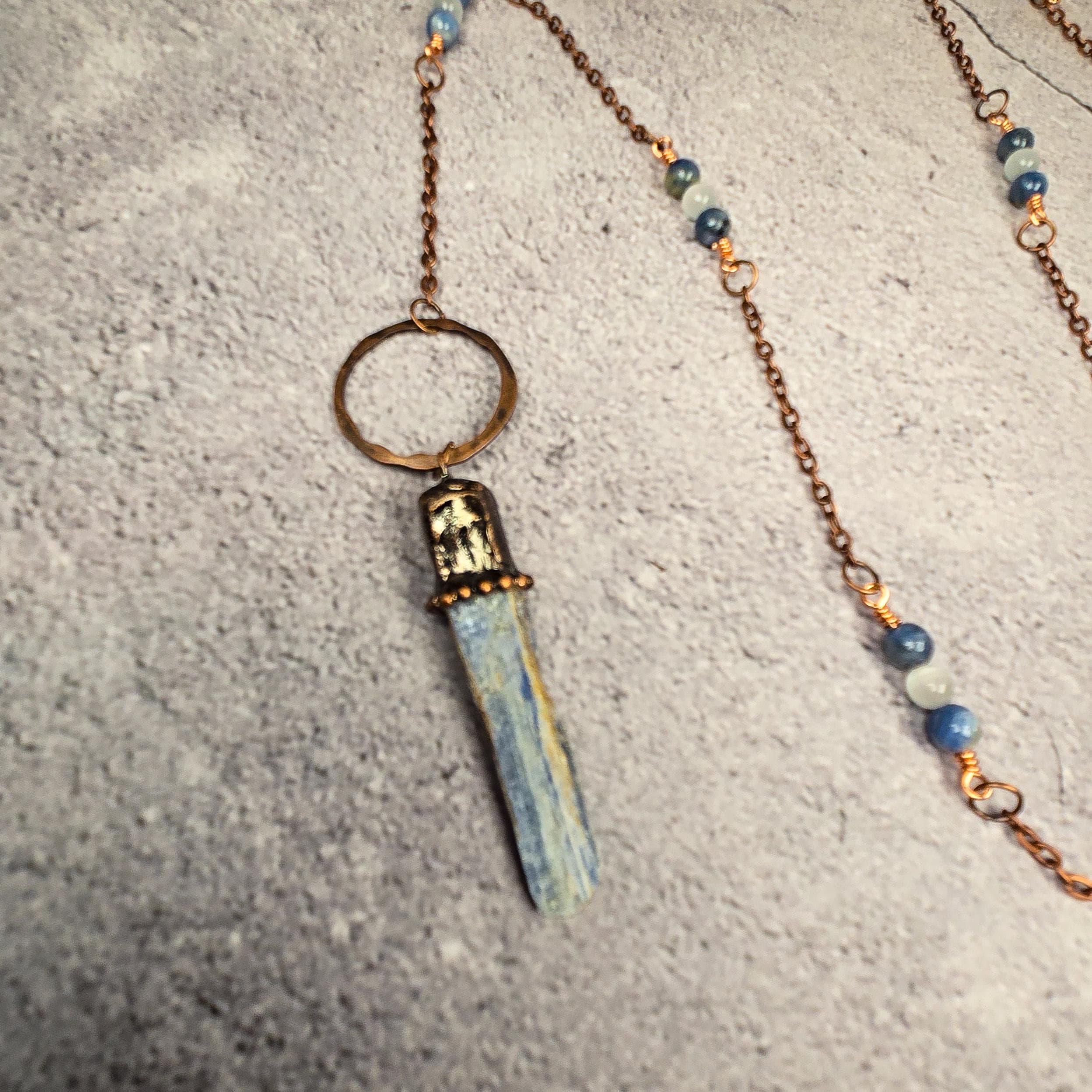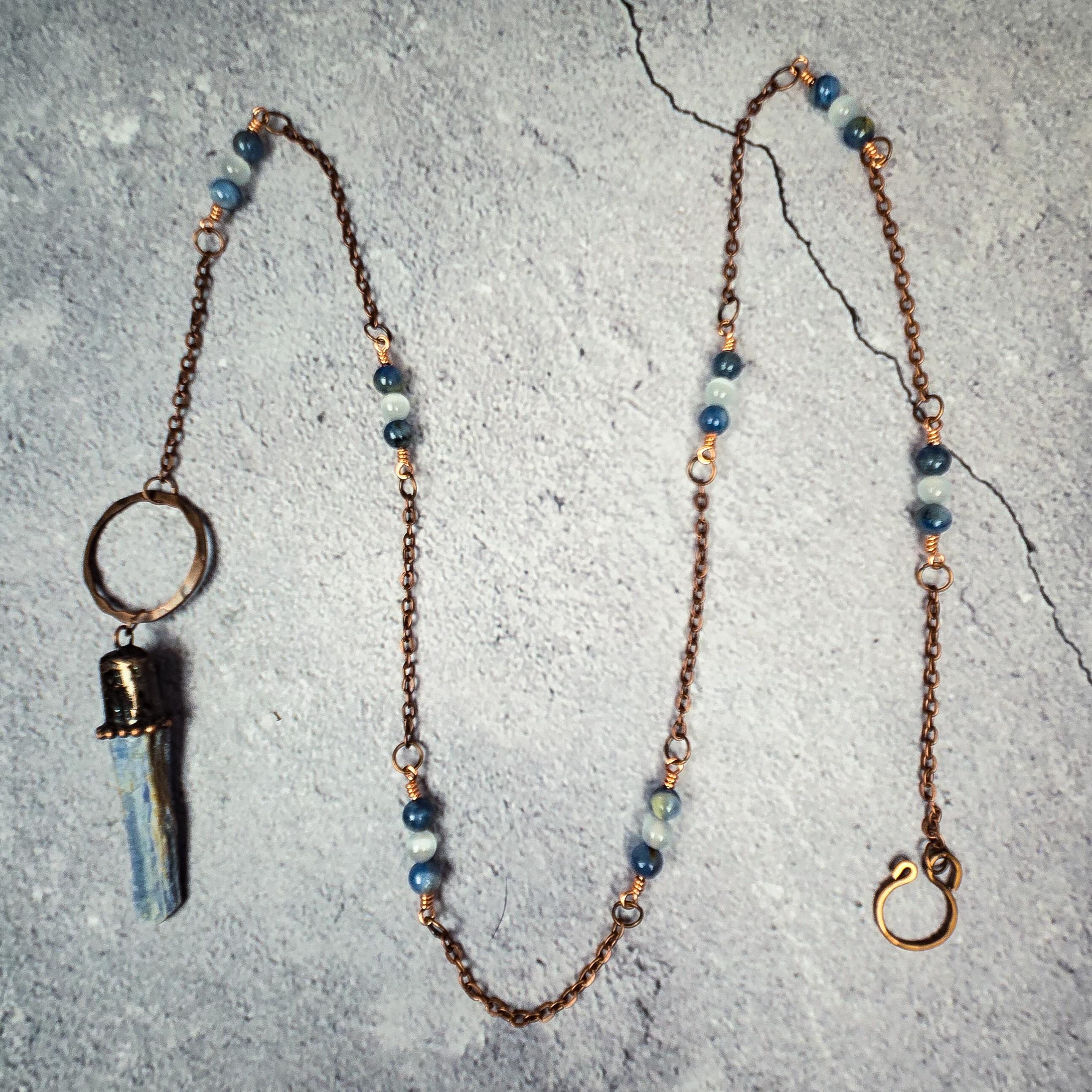 This handcrafted pendulum necklace embodies balance, truth, and energetic flow. Designed for both adornment and divination, it features a stunning blue kyanite crystal suspended from a copper chain, accented with blue kyanite and selenite beads to enhance its spiritual power.
