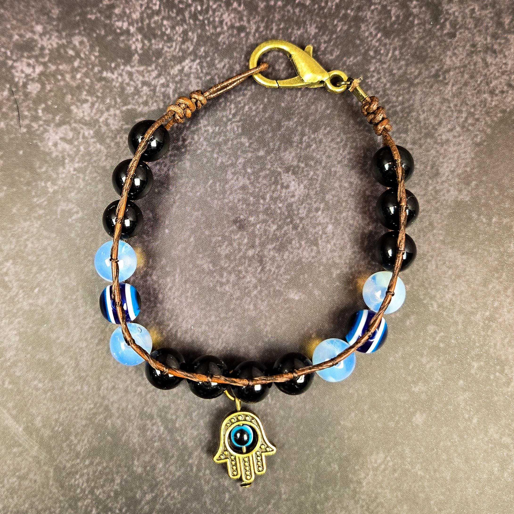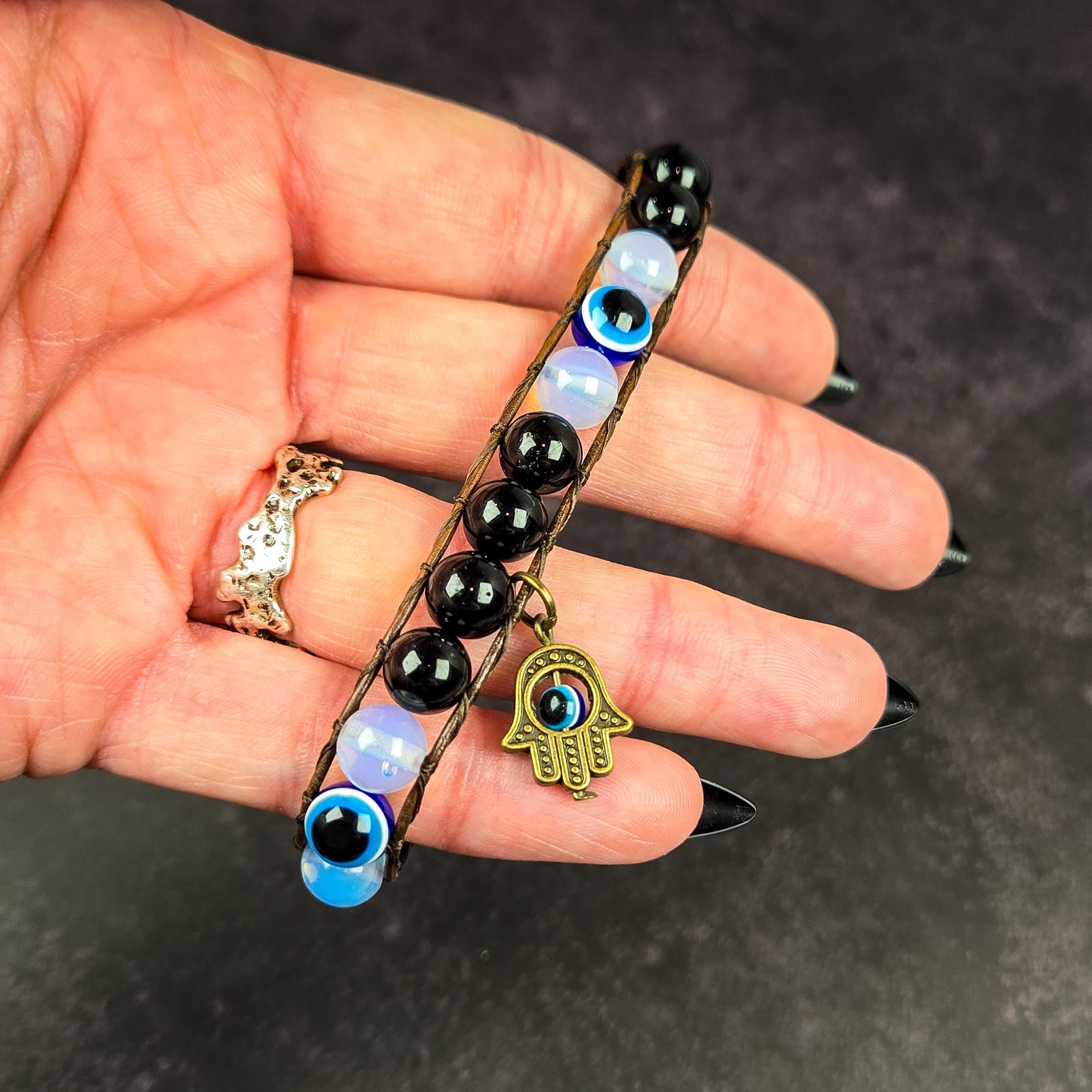 This handcrafted leather wrap bracelet was created as a powerful talisman of protection and balance. It features white agate, black tourmaline, and traditional blue evil eye beads on a 1mm leather cord. The bracelet is finished with an antique gold Hamsa charm inlaid with a blue nazar bead, a potent symbol of spiritual defense and good fortune.