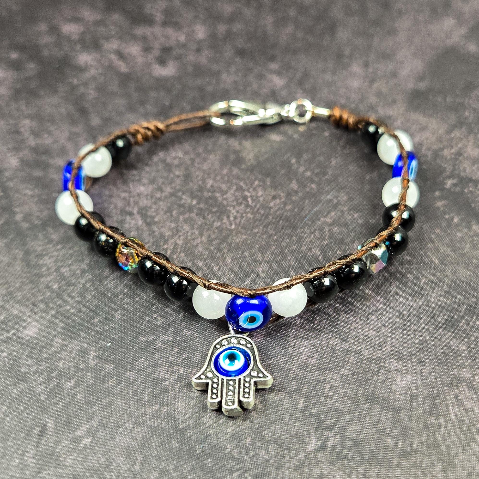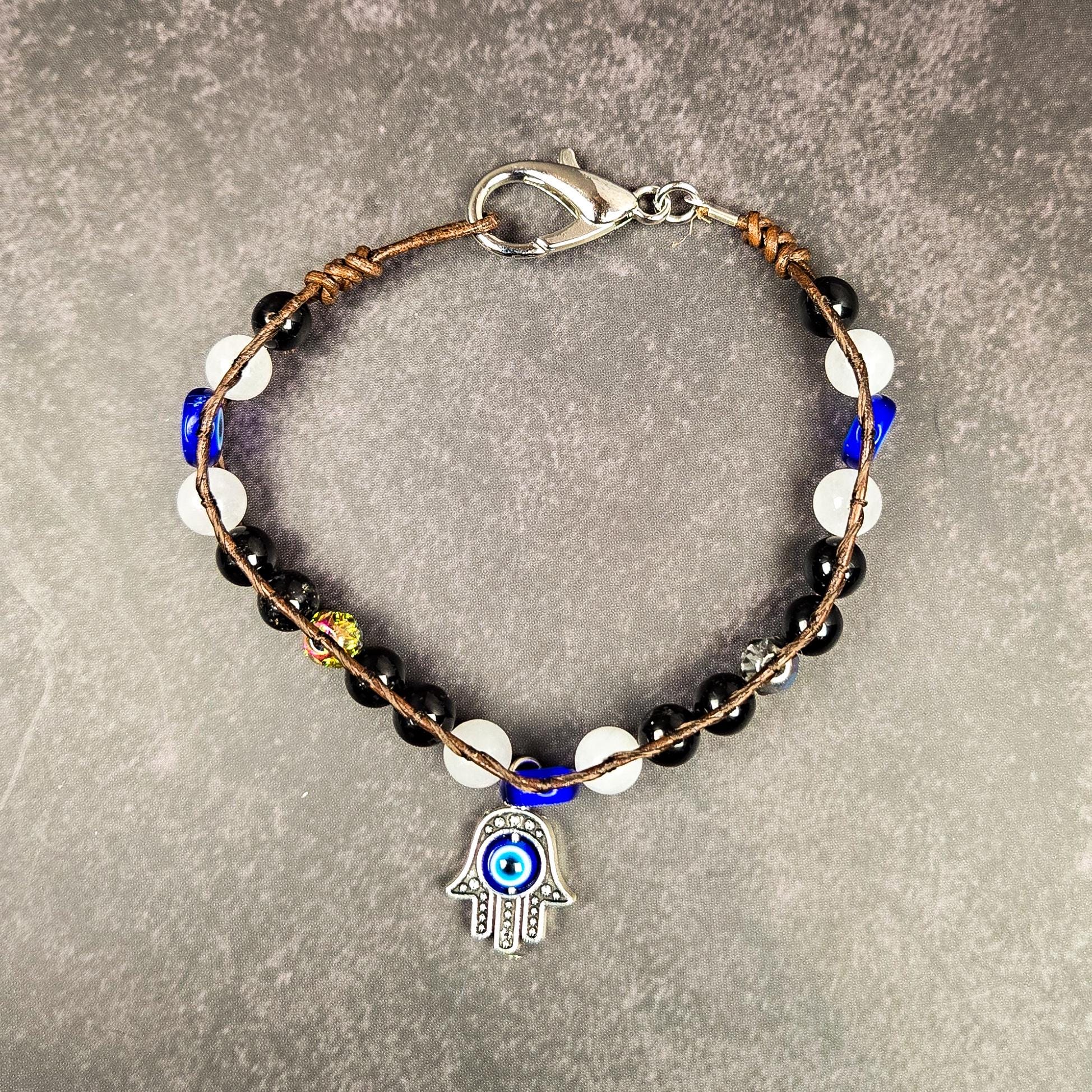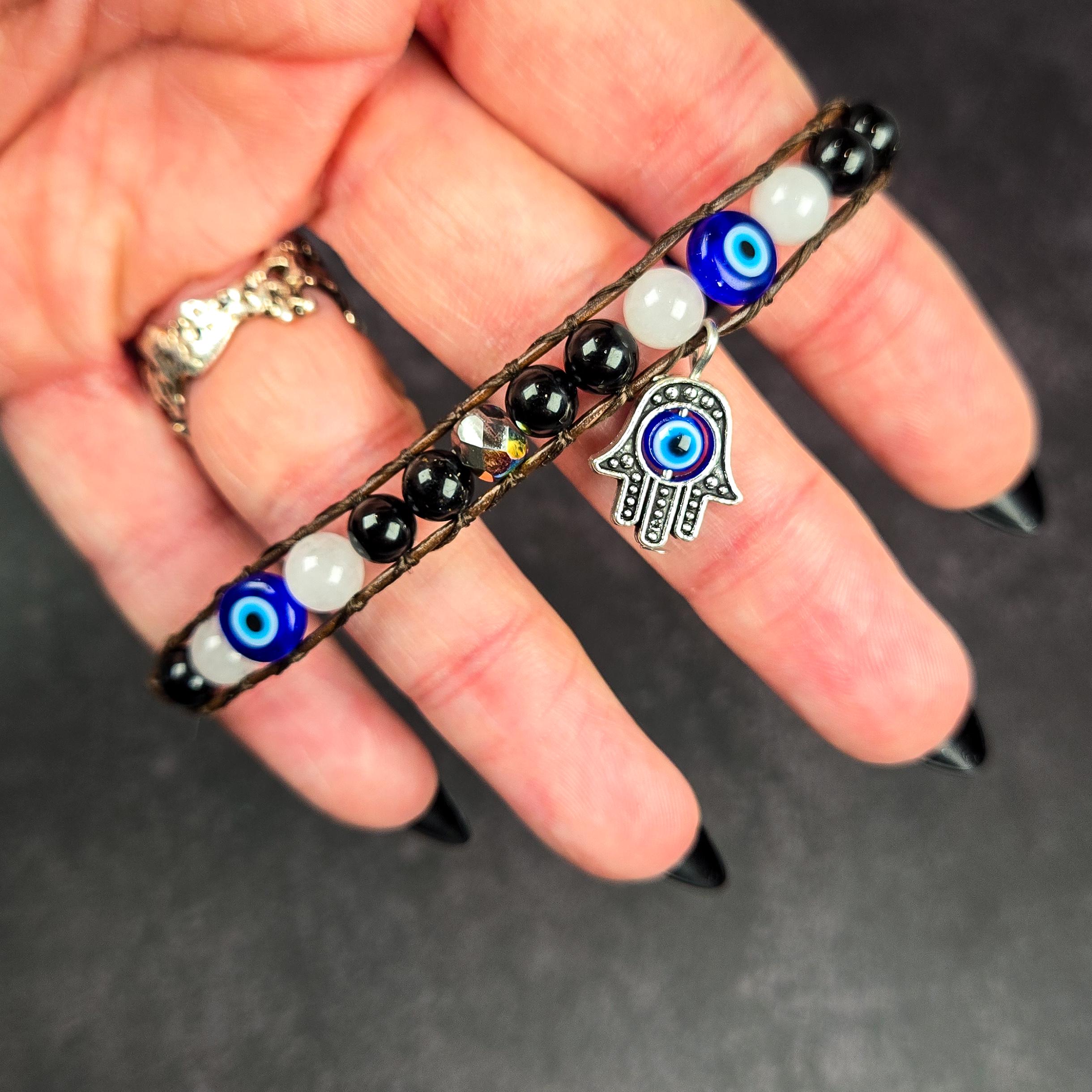 This handcrafted leather wrap bracelet was created as a powerful talisman of protection and balance. It features white agate, black tourmaline, and traditional blue evil eye beads on a 1mm leather cord. The bracelet is finished with a silver-tone Hamsa charm inlaid with a blue nazar bead — a potent symbol of spiritual defense and good fortune.