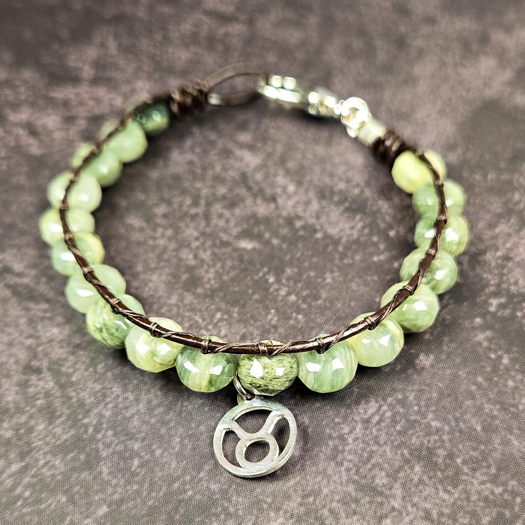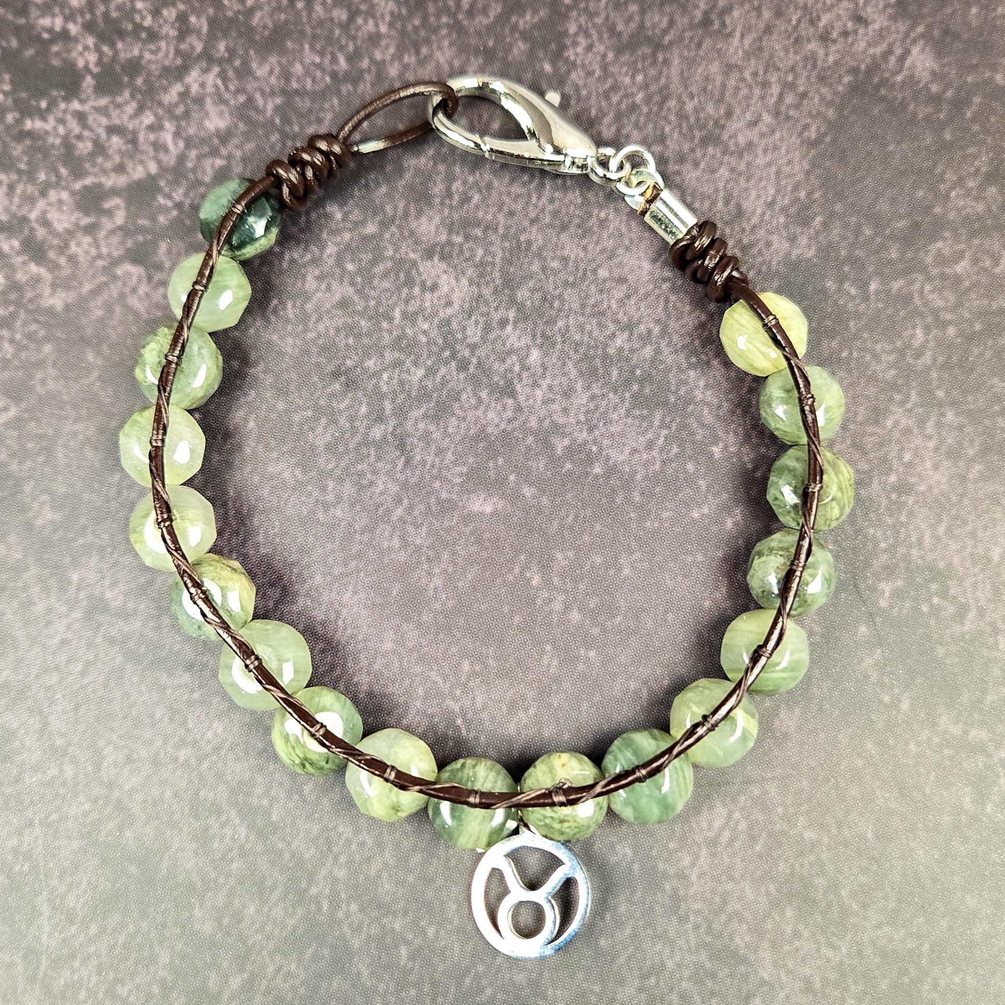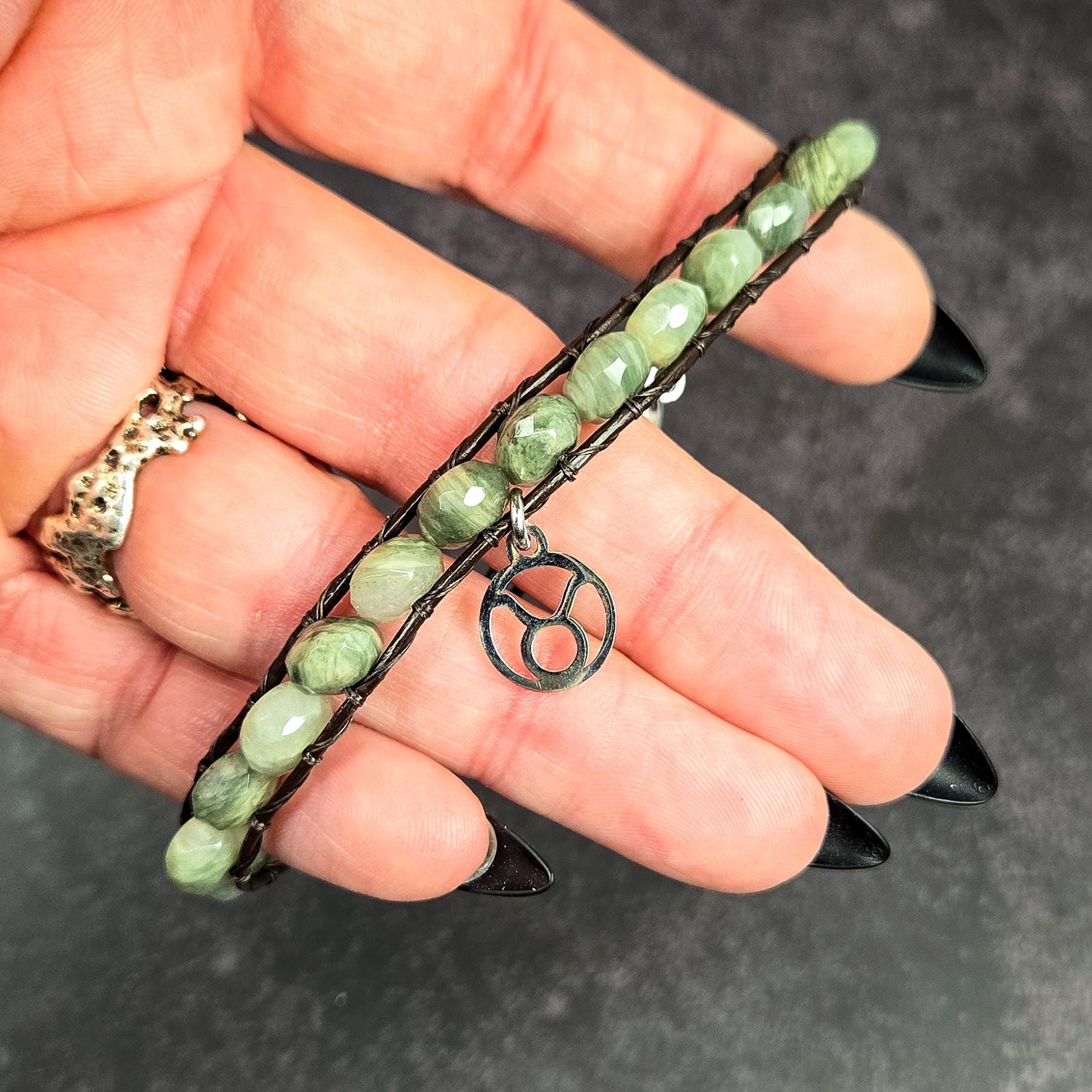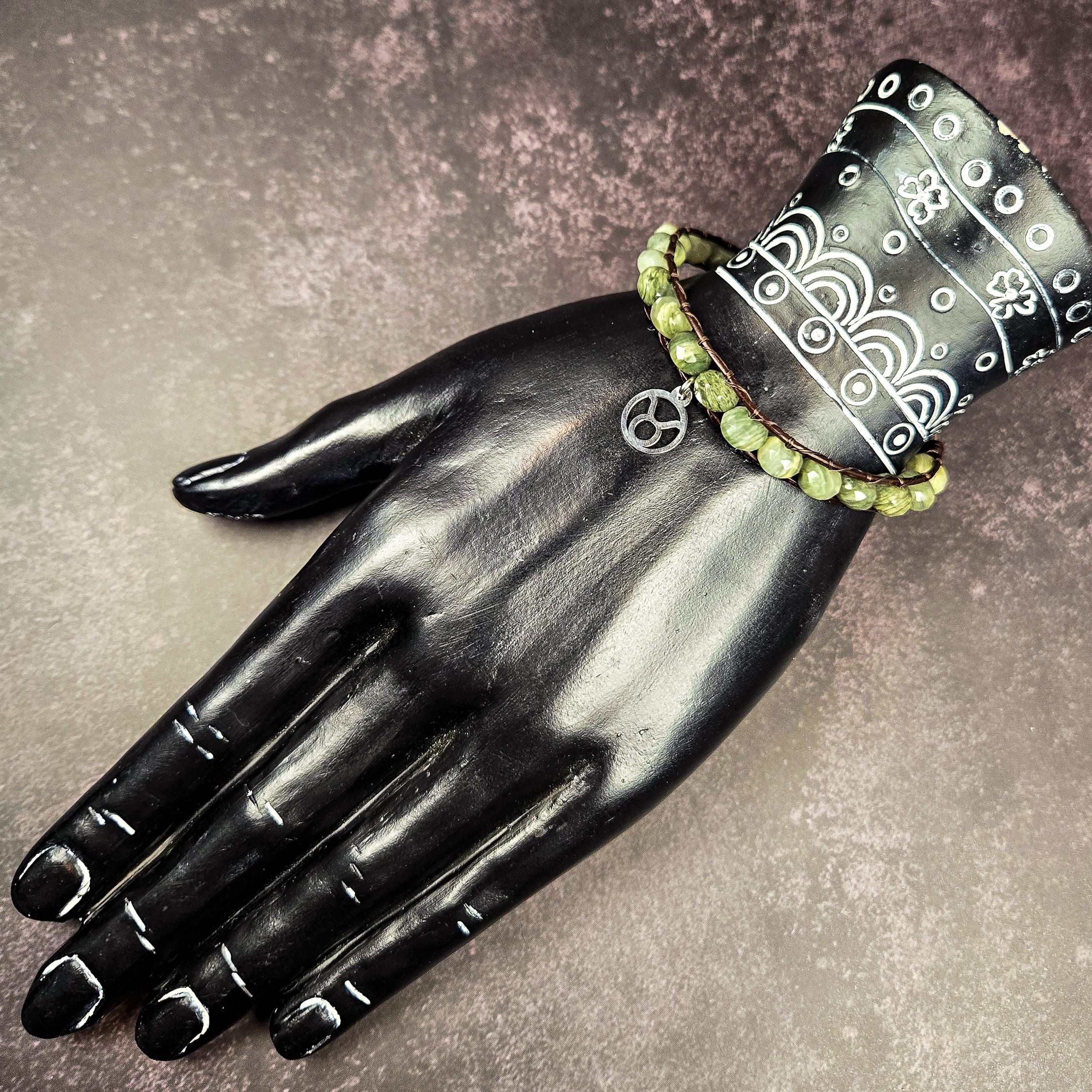 This handcrafted leather wrap bracelet was created as a talisman of clarity, vitality, and divine connection. It features luminous green rutilated quartz beads hand-stitched onto a 1mm leather cord and is finished with a Gemini zodiac charm, honoring the duality, curiosity, and intellect of this air sign.