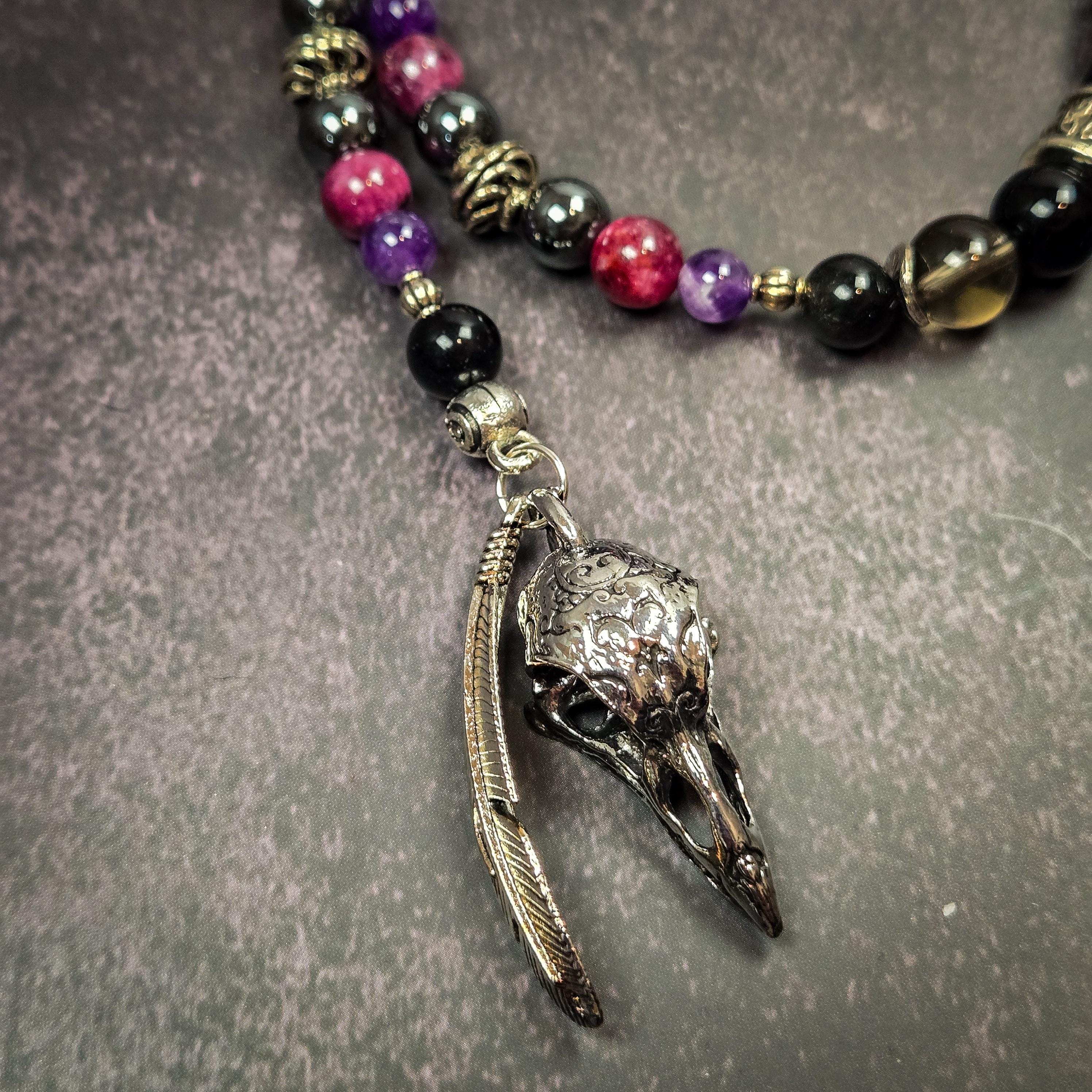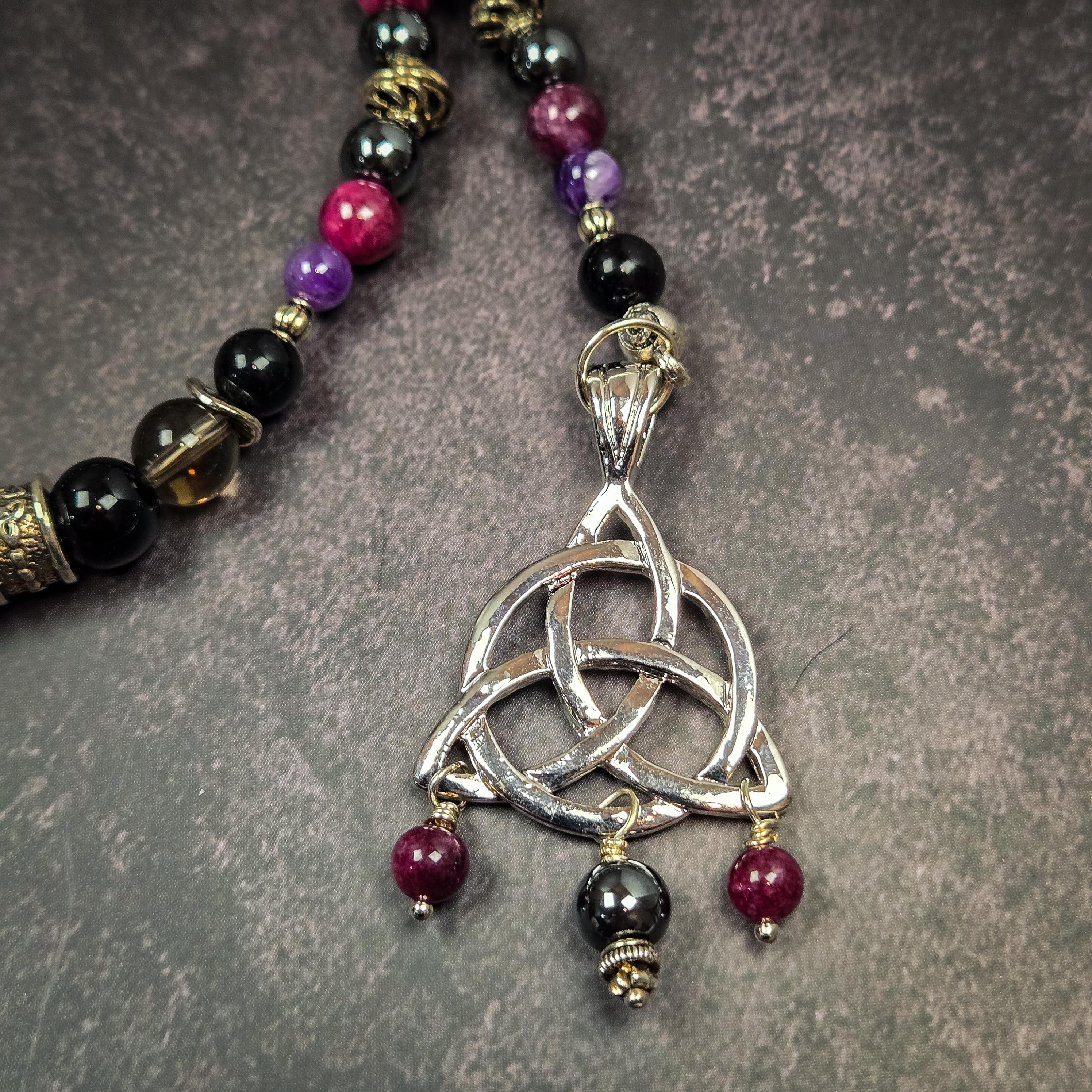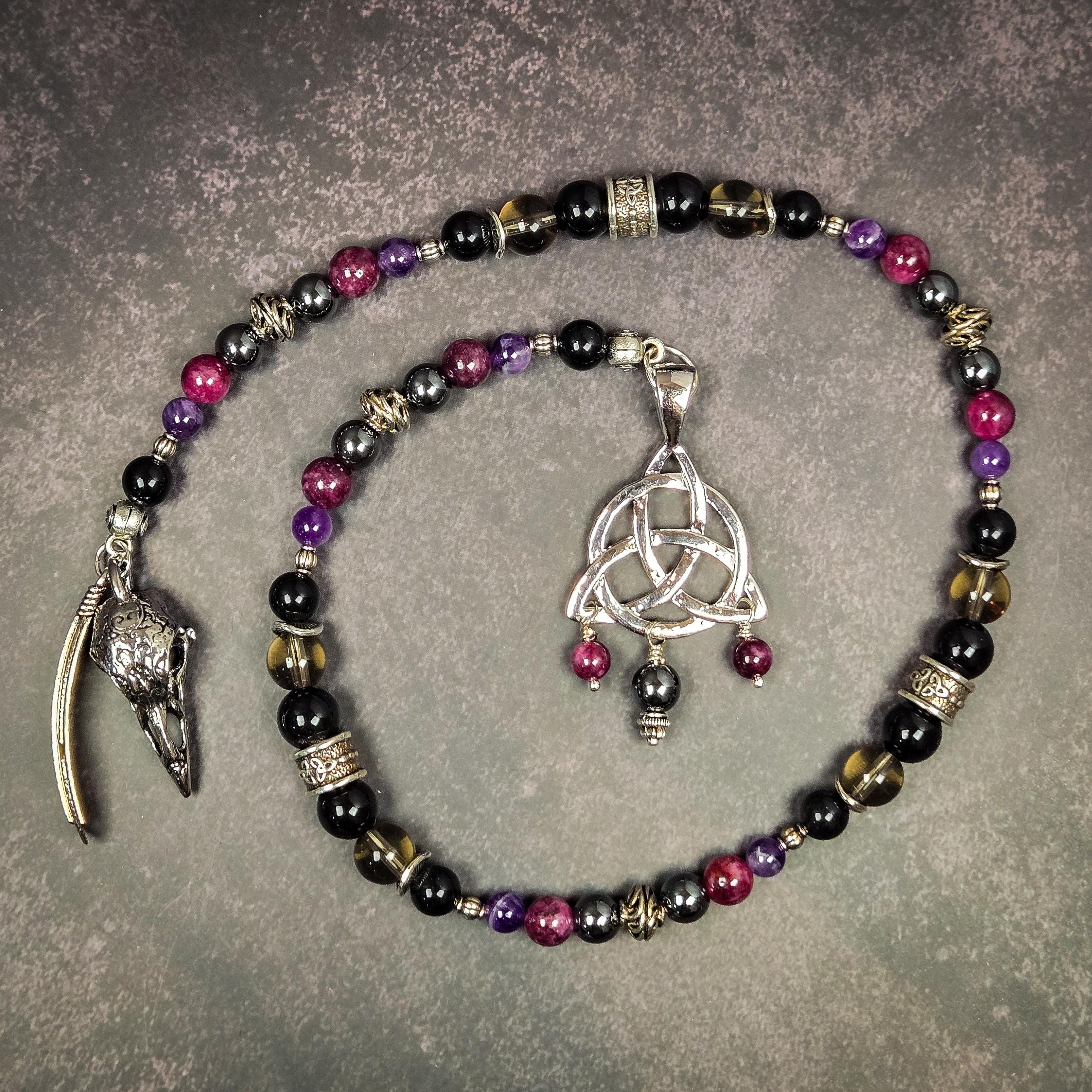 This handmade set of prayer beads is dedicated to the Morrígan, the powerful Celtic goddess of war, fate, and transformation. Known as a guardian of sovereignty and a guide through times of conflict and shadow, the Morrígan embodies strength, mystery, and the cycles of life, death, and rebirth.