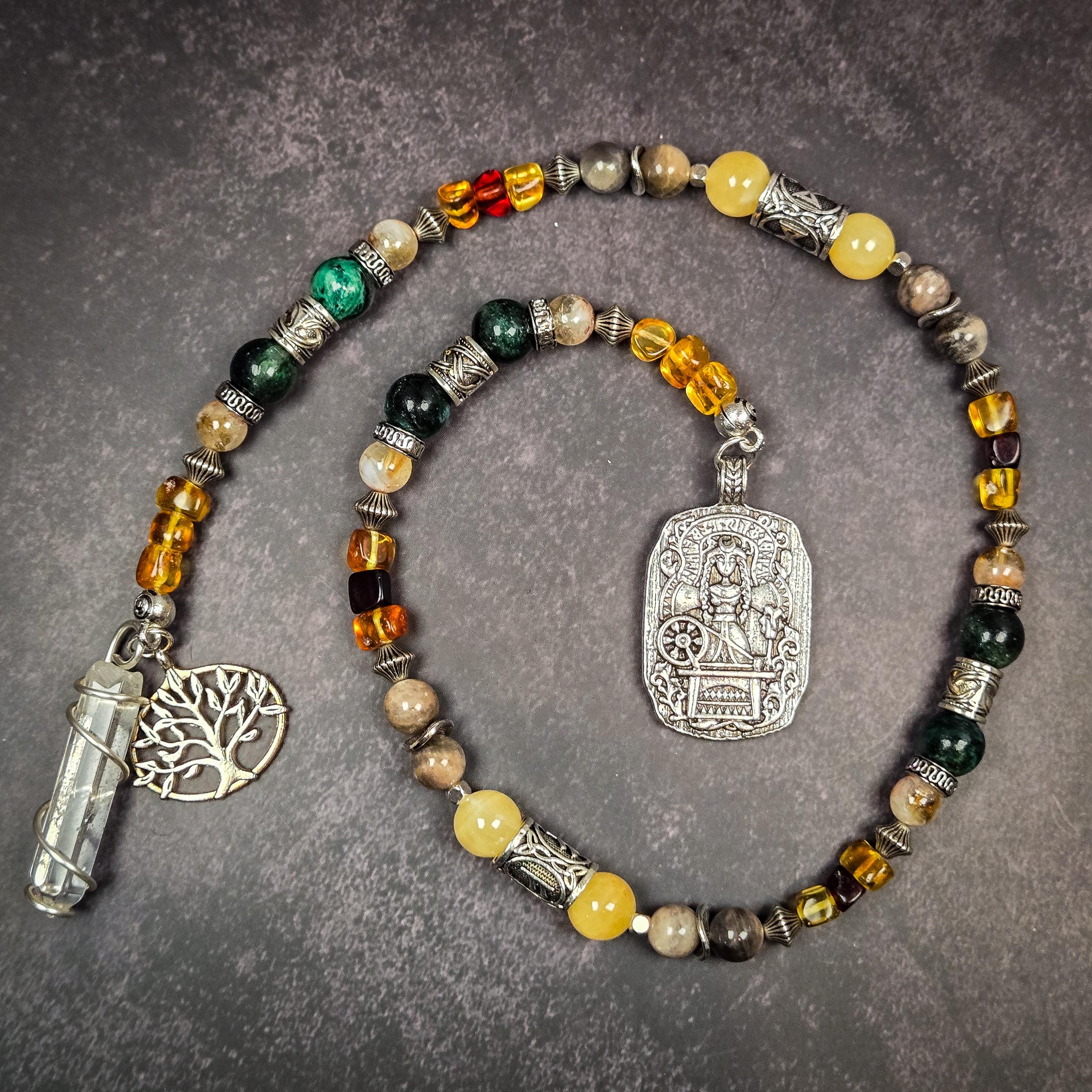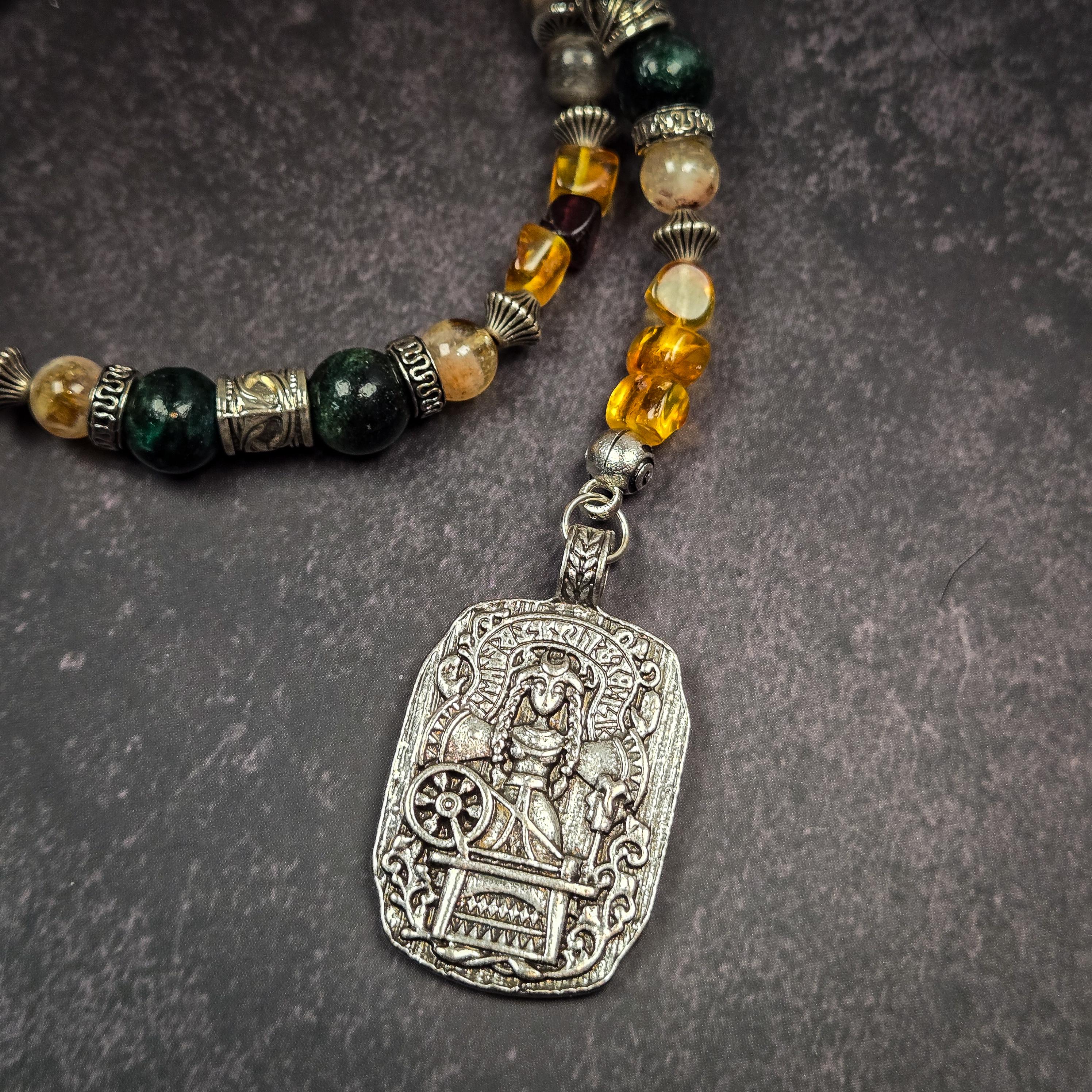 Embrace the wisdom and grace of Frigg, the Norse Goddess of Marriage, Motherhood, and Prophecy, with these exquisitely crafted prayer beads. Each bead has been thoughtfully selected for its unique properties, creating a powerful tool for your spiritual practice and connection to this revered deity: