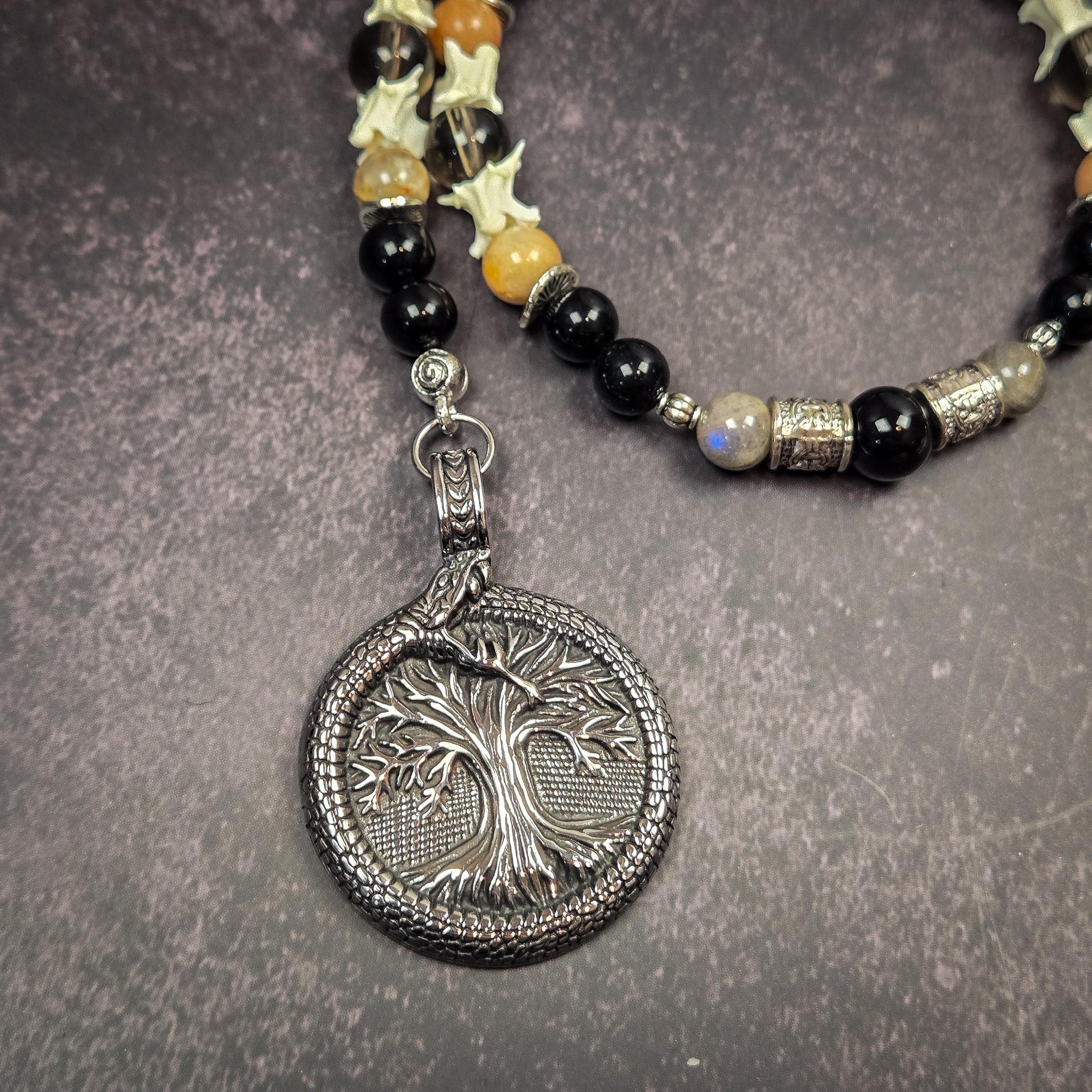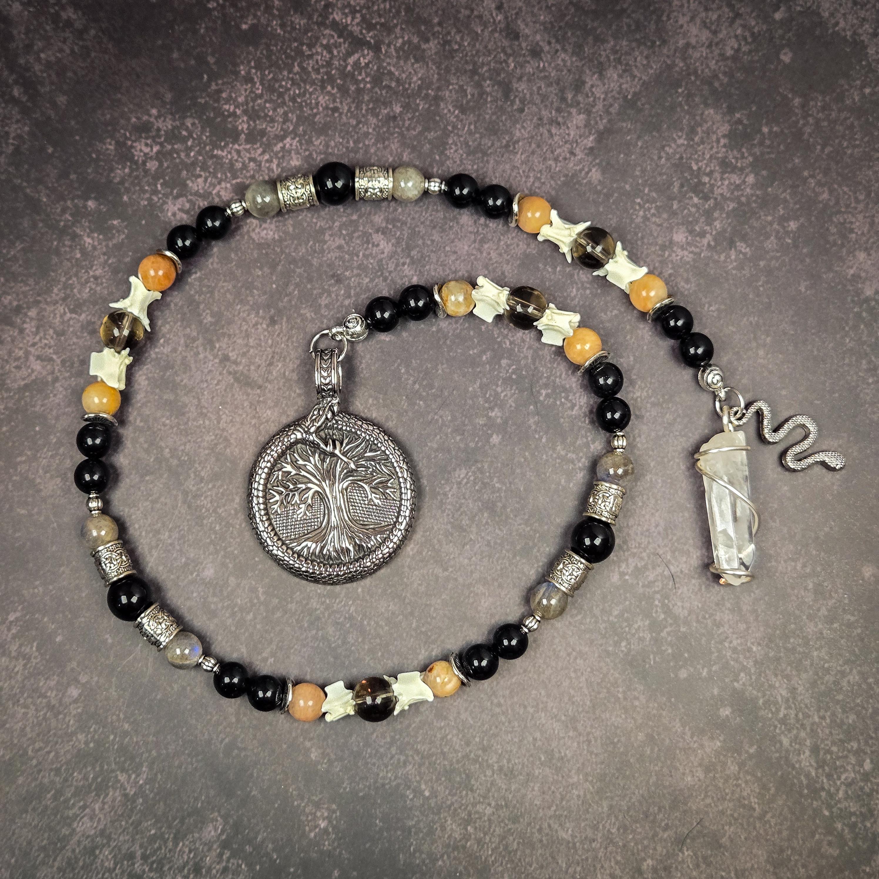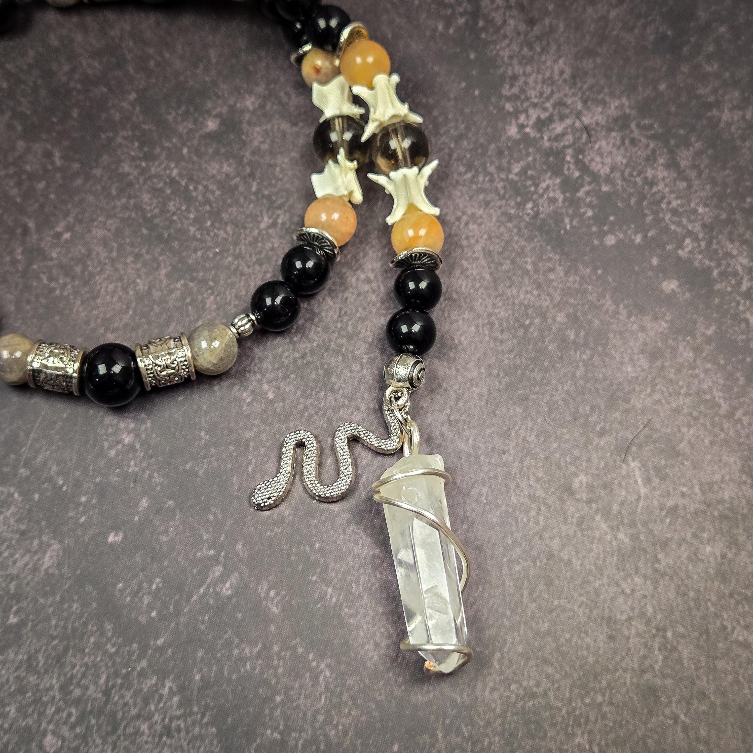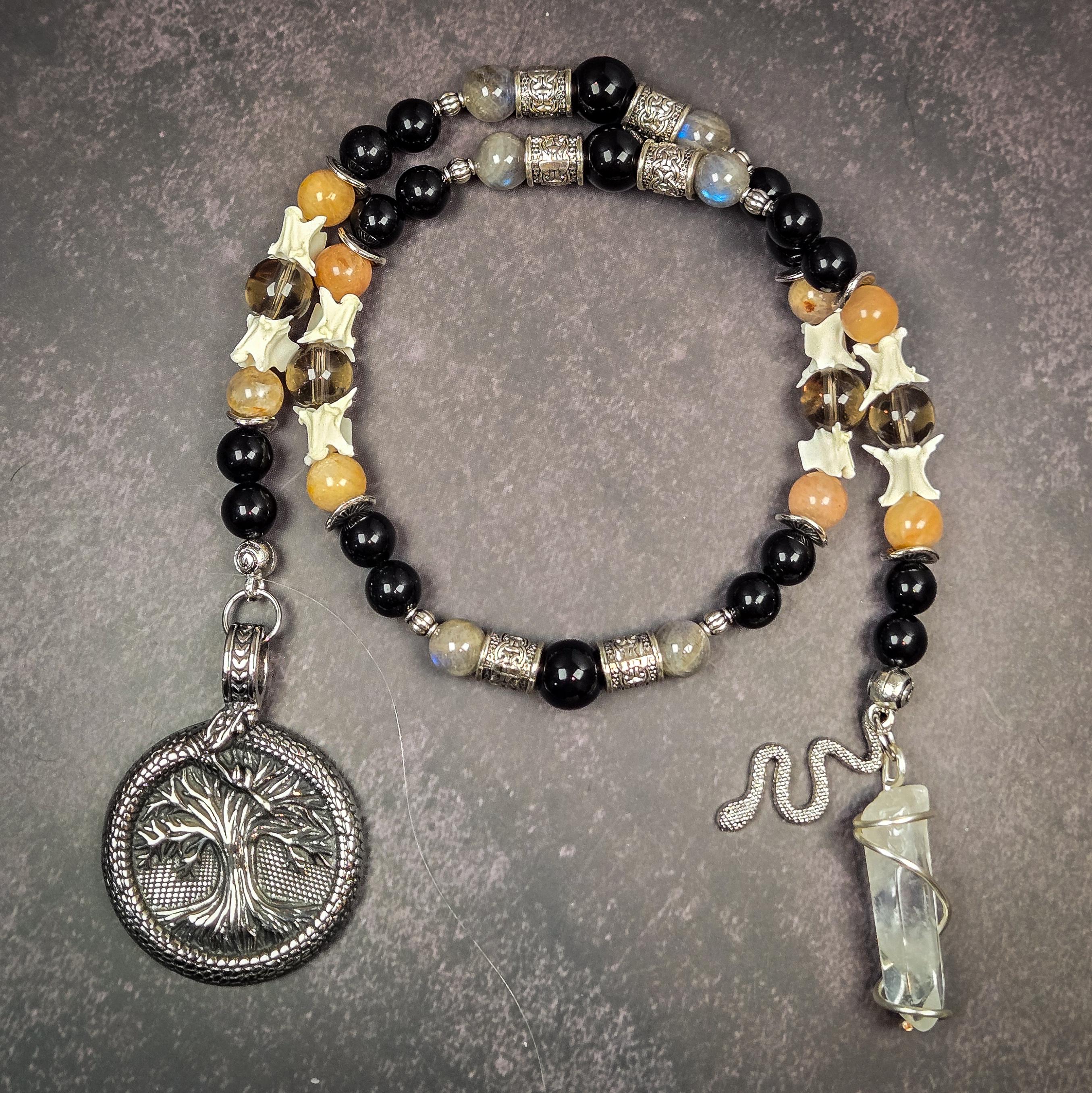 Honor the mighty World Serpent with this powerful handcrafted set of prayer beads, created to support protection, shadow work, boundary-setting, deep intuition, and transformative magick. Each bead has been intentionally chosen to reflect the primordial energy of Jörmungandr, ancient, coiled, liminal, and ever-watchful beneath the sea.