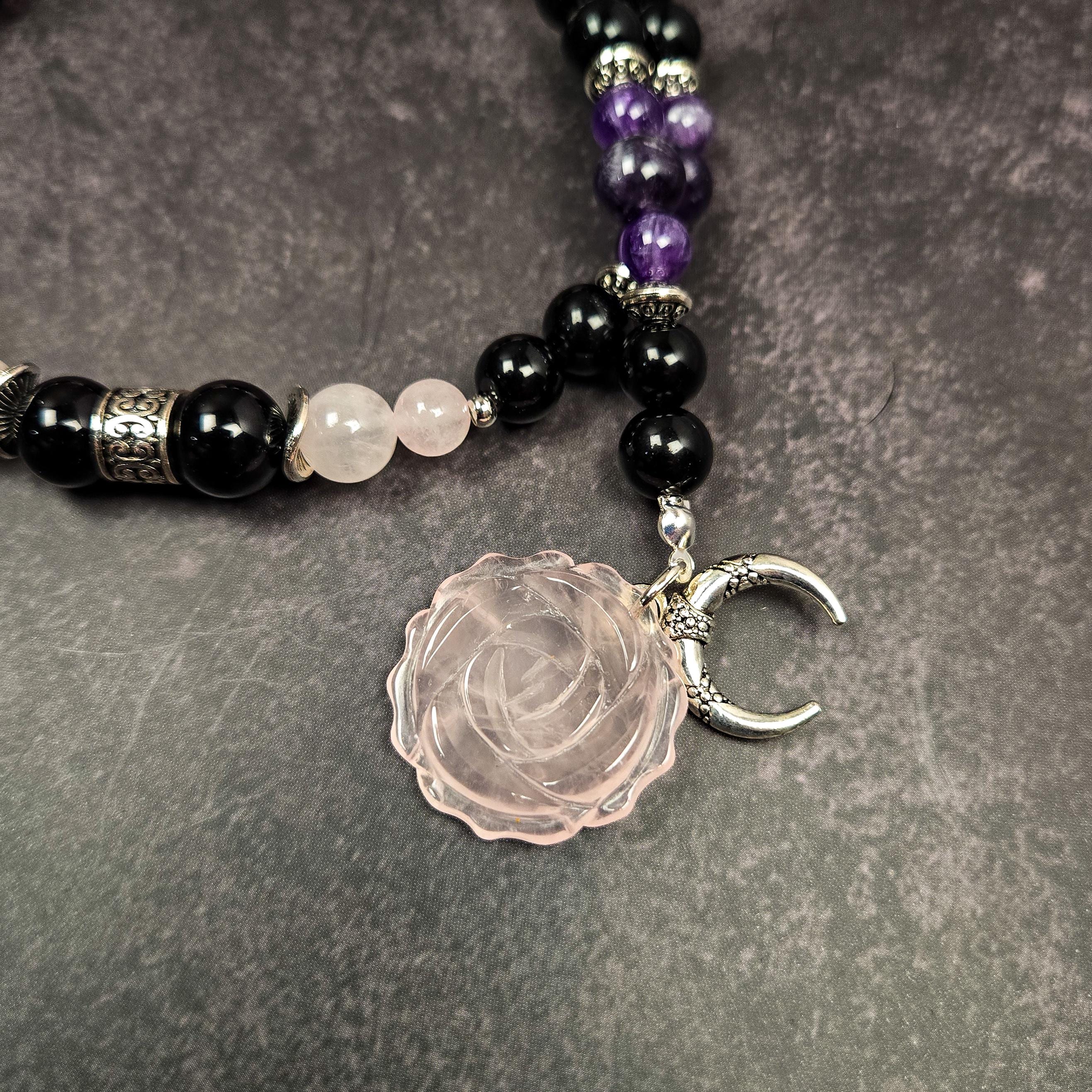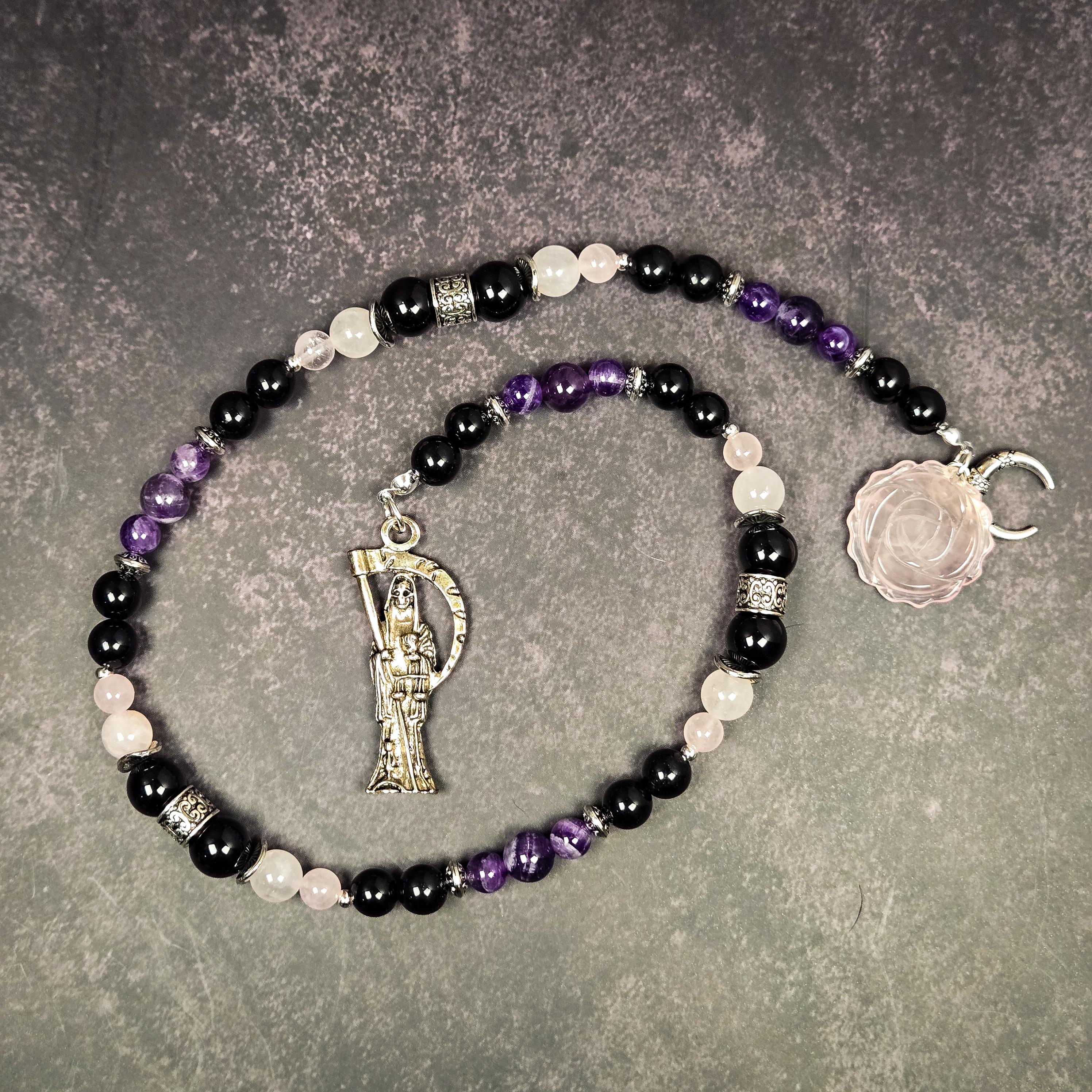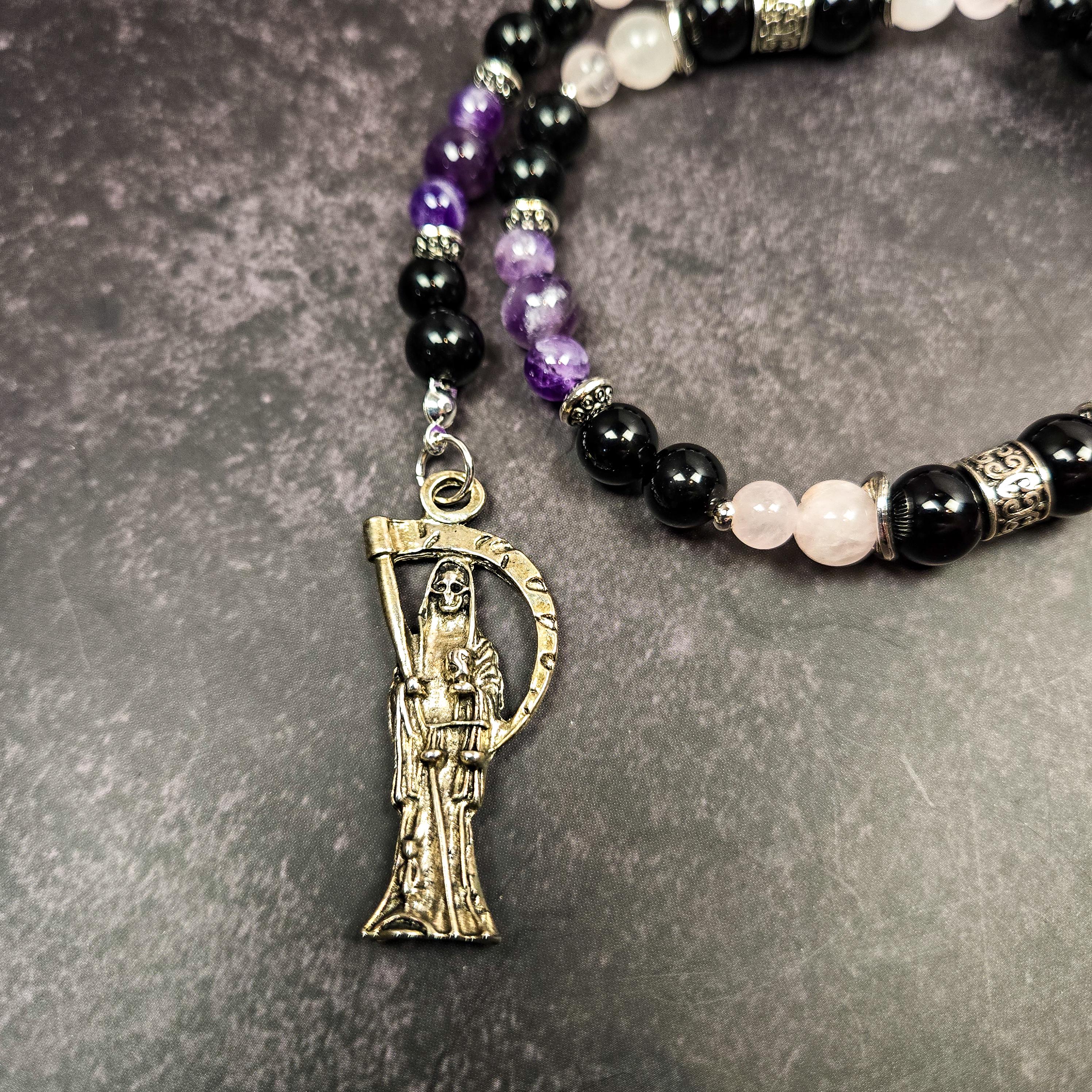 Discover the spiritual harmony of our Santa Muerte Prayer Beads, crafted with the energies of amethyst, obsidian, and rose quartz. Handmade with love and devotion, these prayer beads are designed to help you connect with the revered Santa Muerte while harnessing the properties of these precious gemstones.
