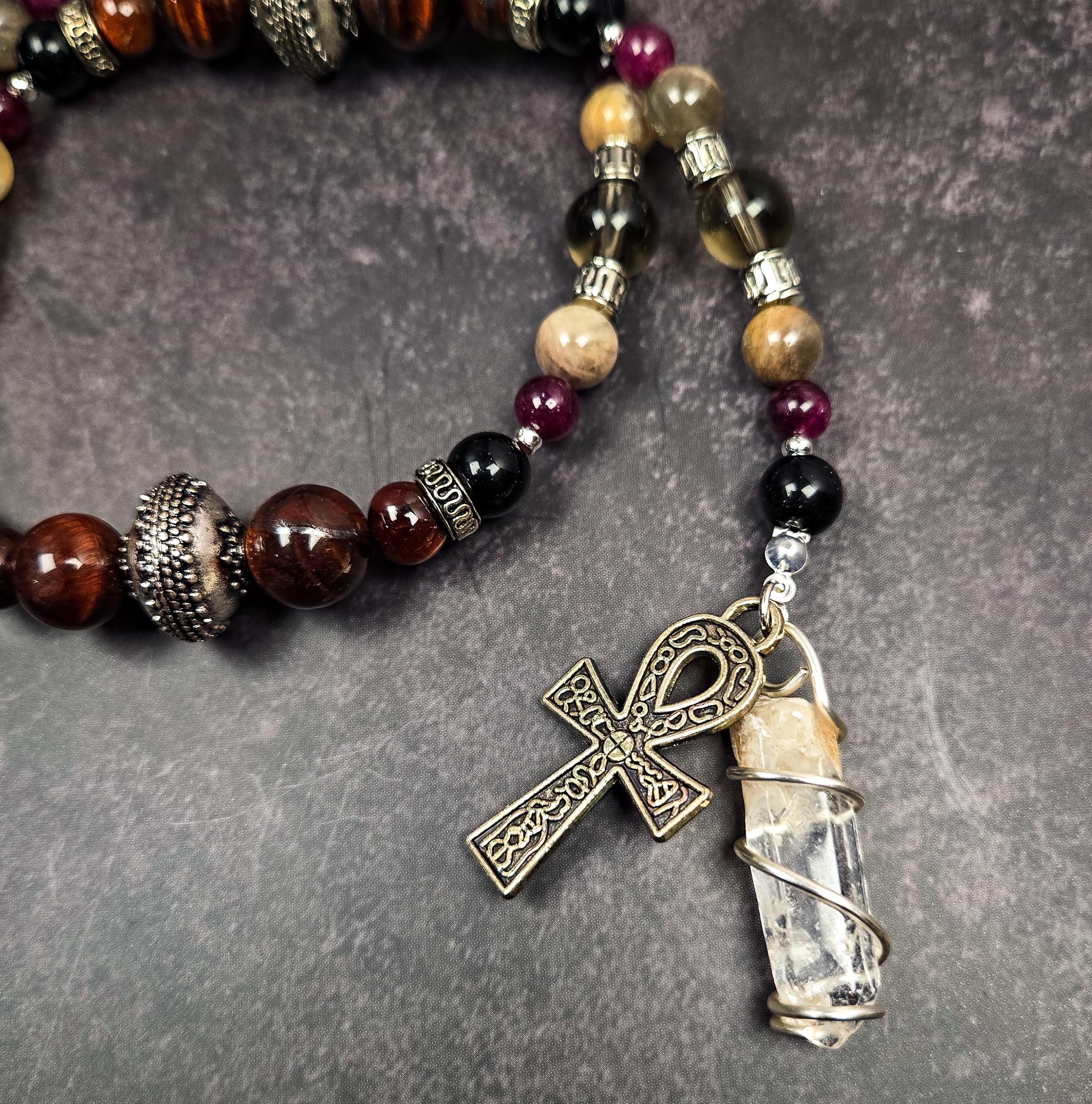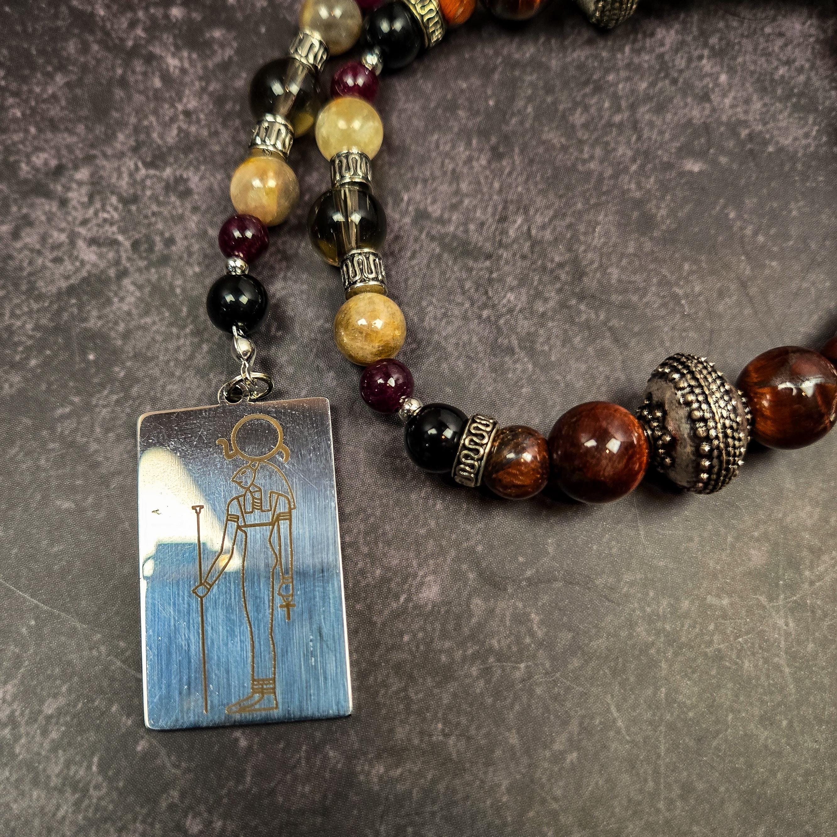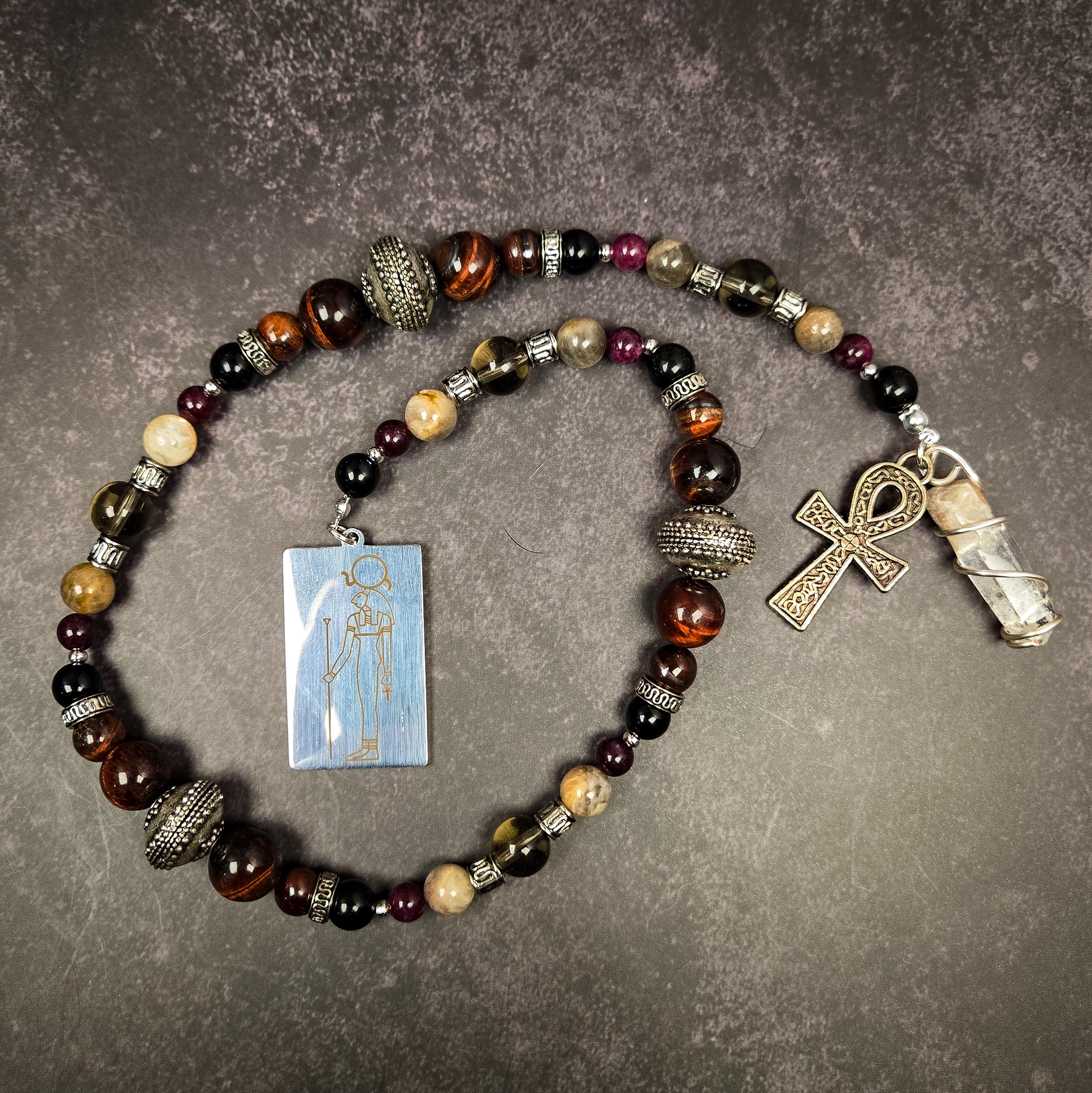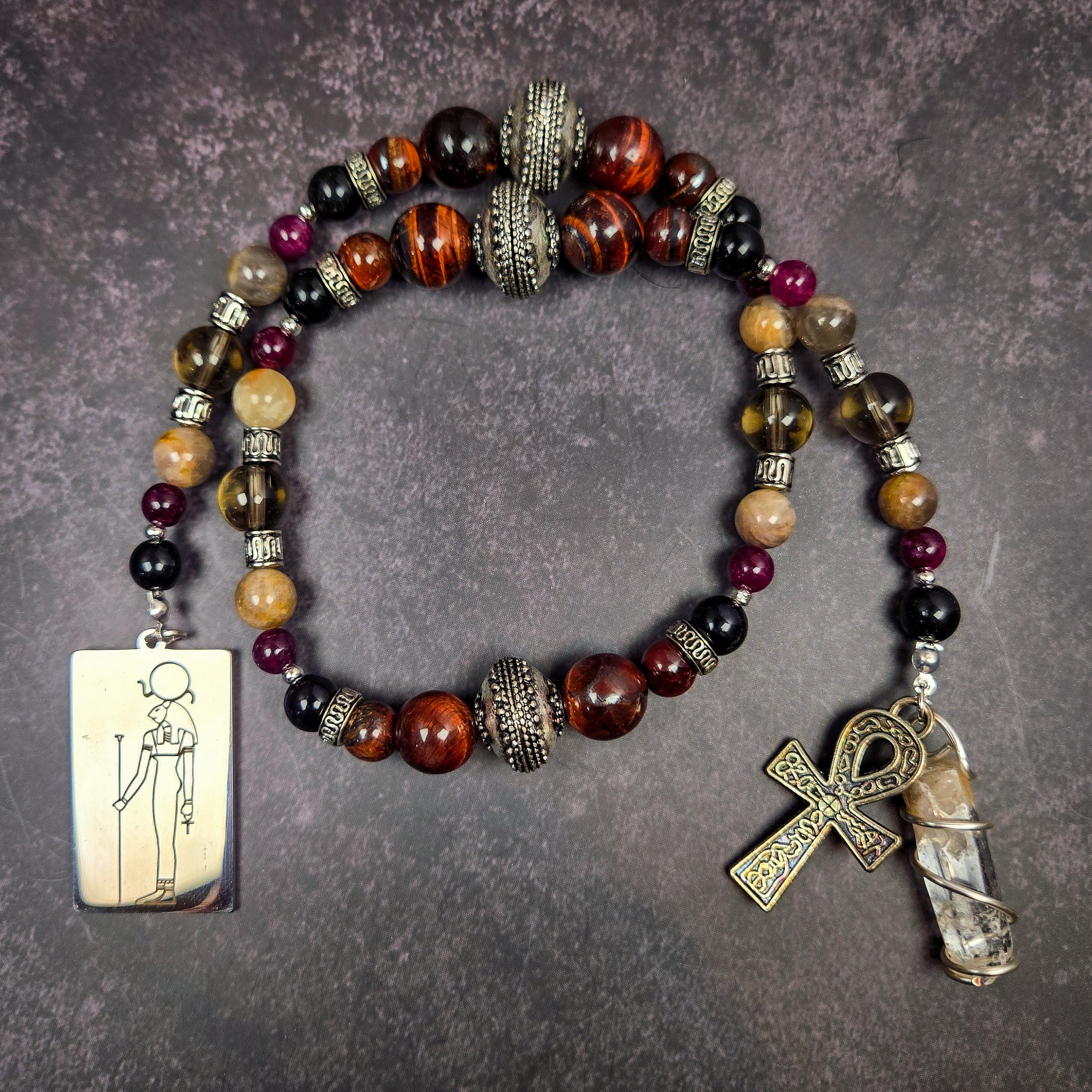 Invoke the fierce power and protective strength of the Egyptian goddess Sekhmet with this handcrafted strand of pagan prayer beads. Known as the lion-headed warrior goddess of healing, justice, and transformation, Sekhmet inspires courage and clarity while guiding her devotees through both battle and renewal.