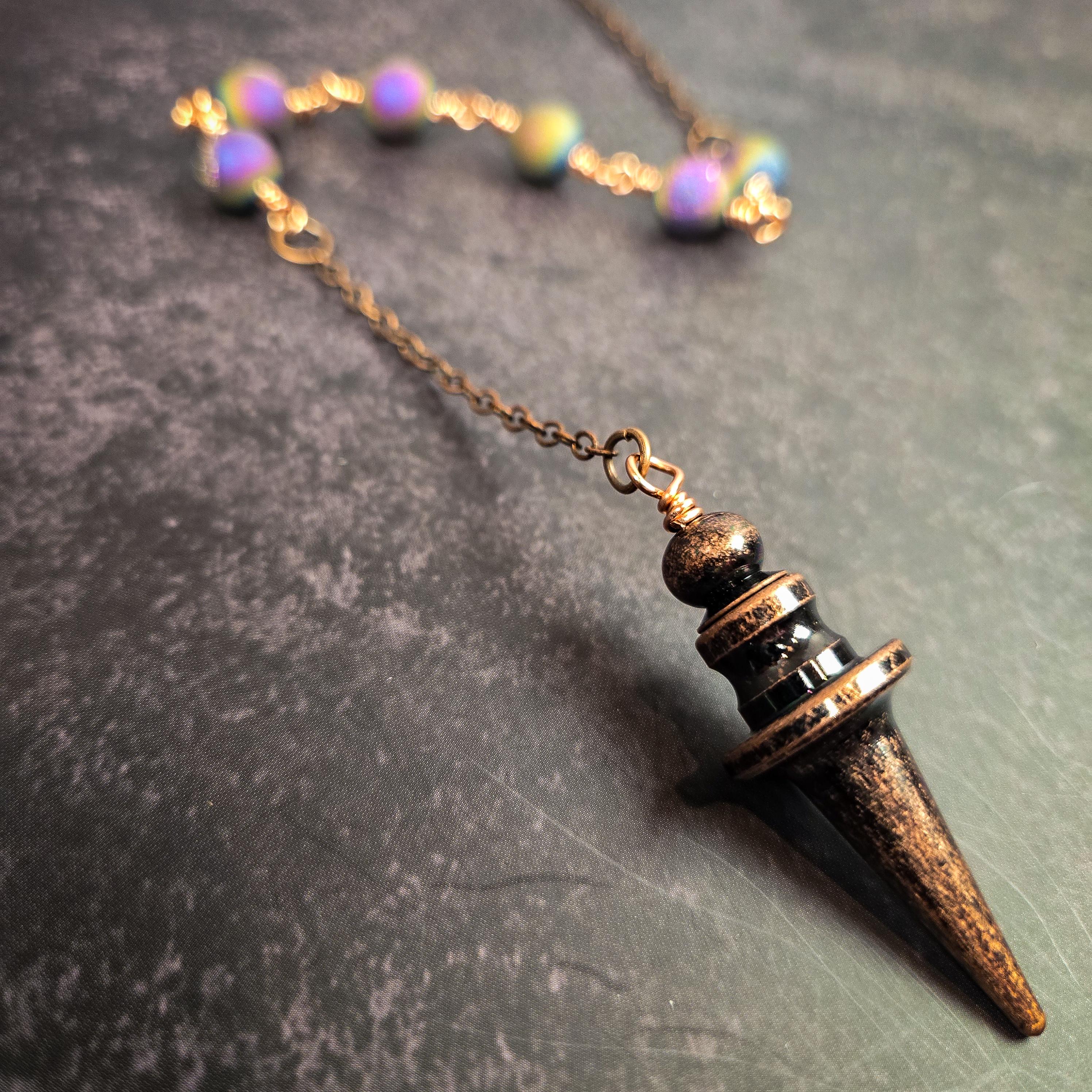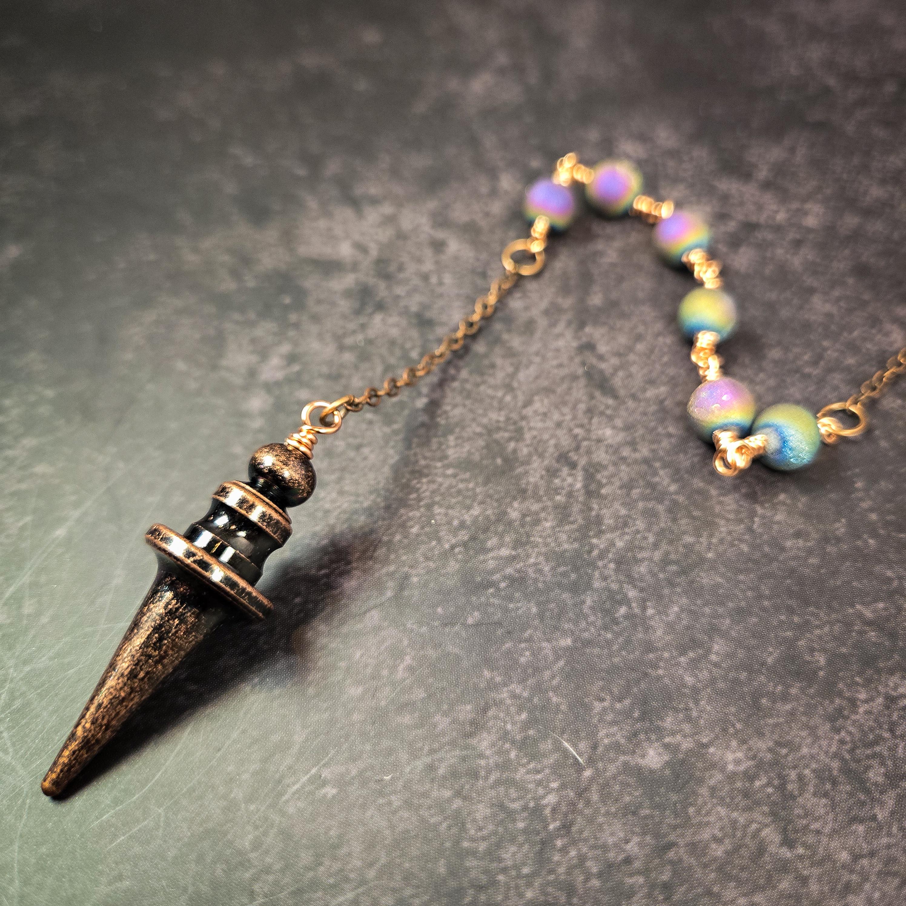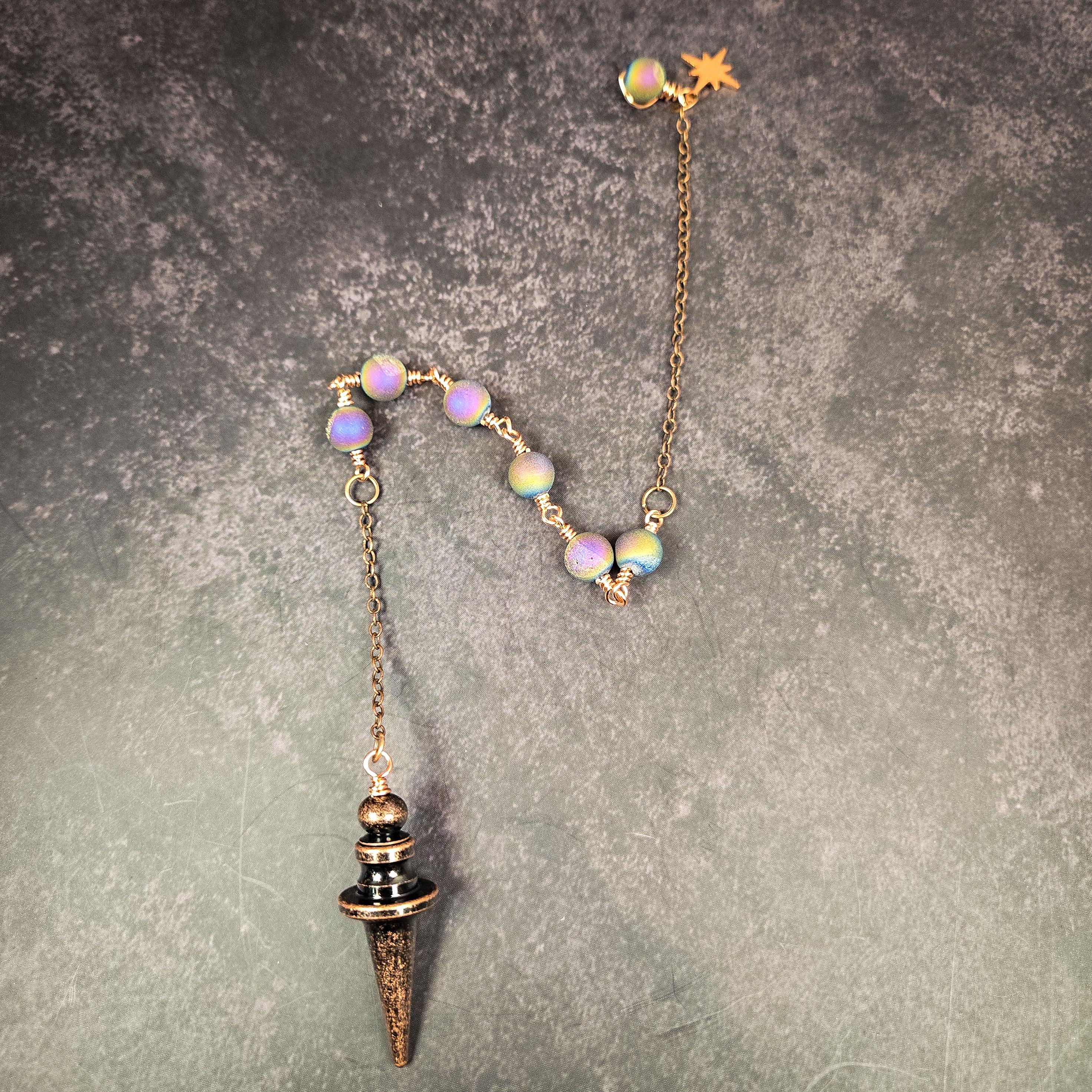 Illuminate your divination practice with this copper pendulum adorned with shimmering rainbow titanium druzy agate beads, a striking combination of grounding metal and high-vibration crystal energy. This pendulum offers a bold visual presence and an incredibly responsive swing, making it a favorite for both intuitive readers and energy workers.