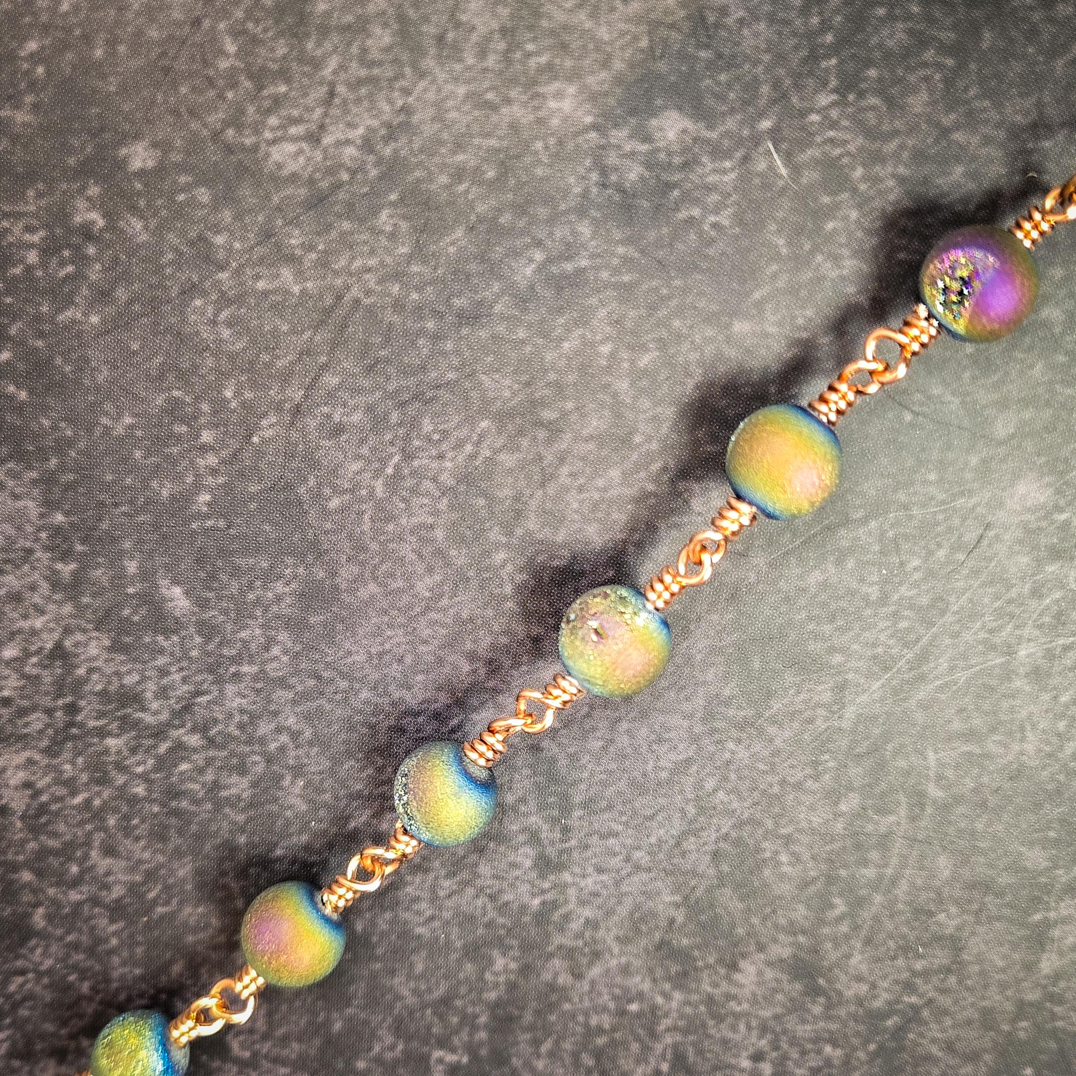 The polished copper point delivers weight, accuracy, and a natural conductive energy, helping to channel intuitive messages and enhance spiritual communication. Complementing the point are sparkling rainbow titanium druzy agate beads, each one coated in a vibrant metallic sheen that catches the light and amplifies the pendulum’s energetic aura.
