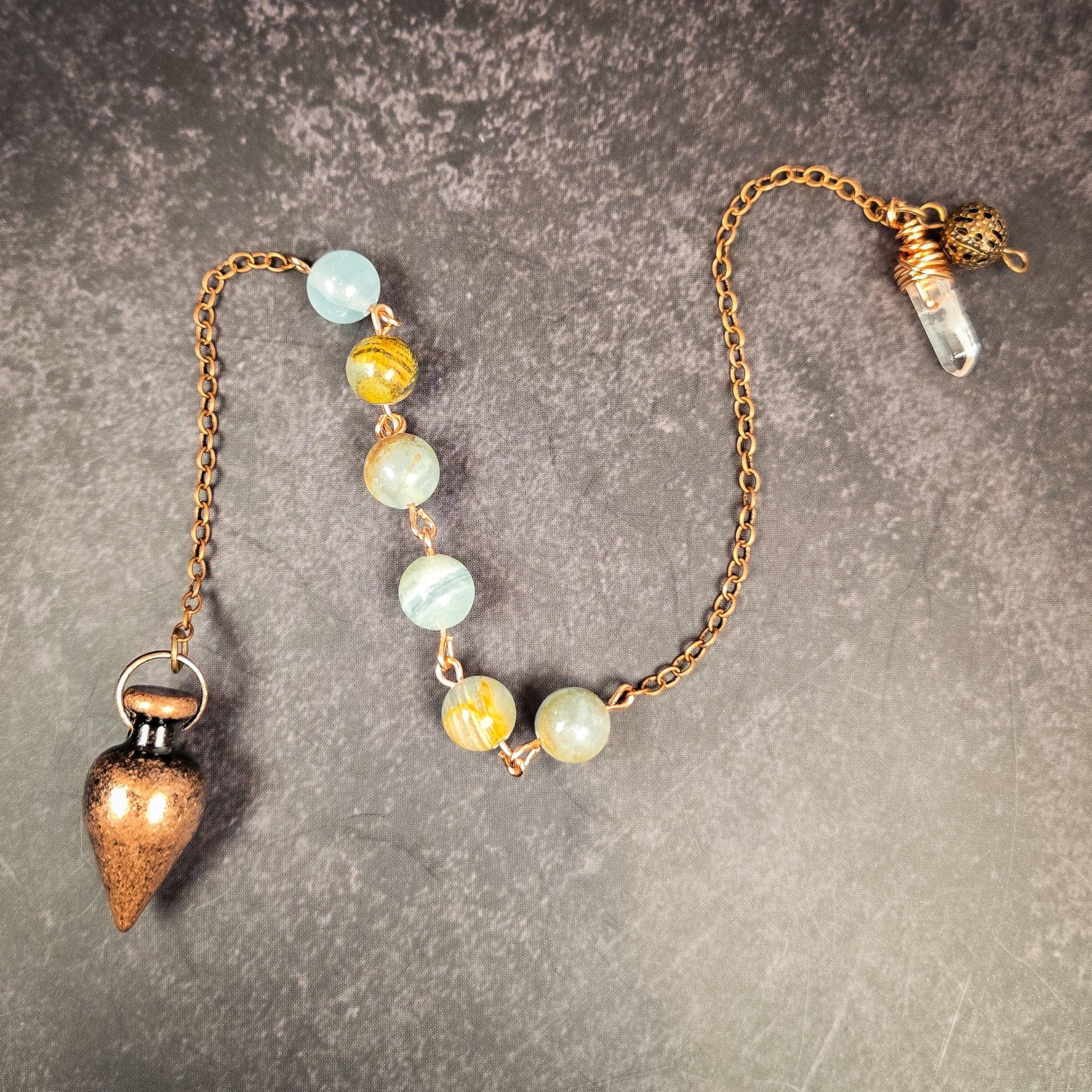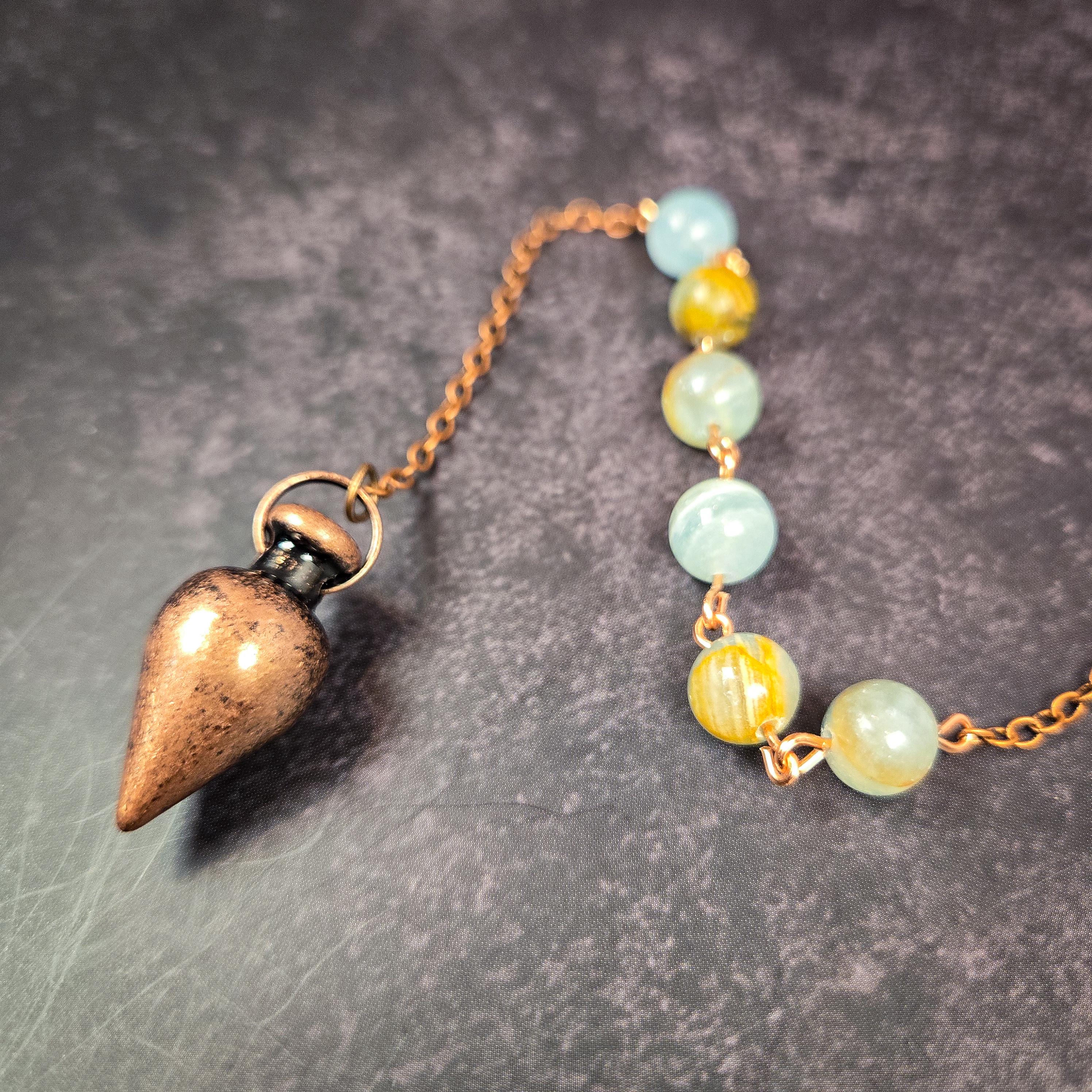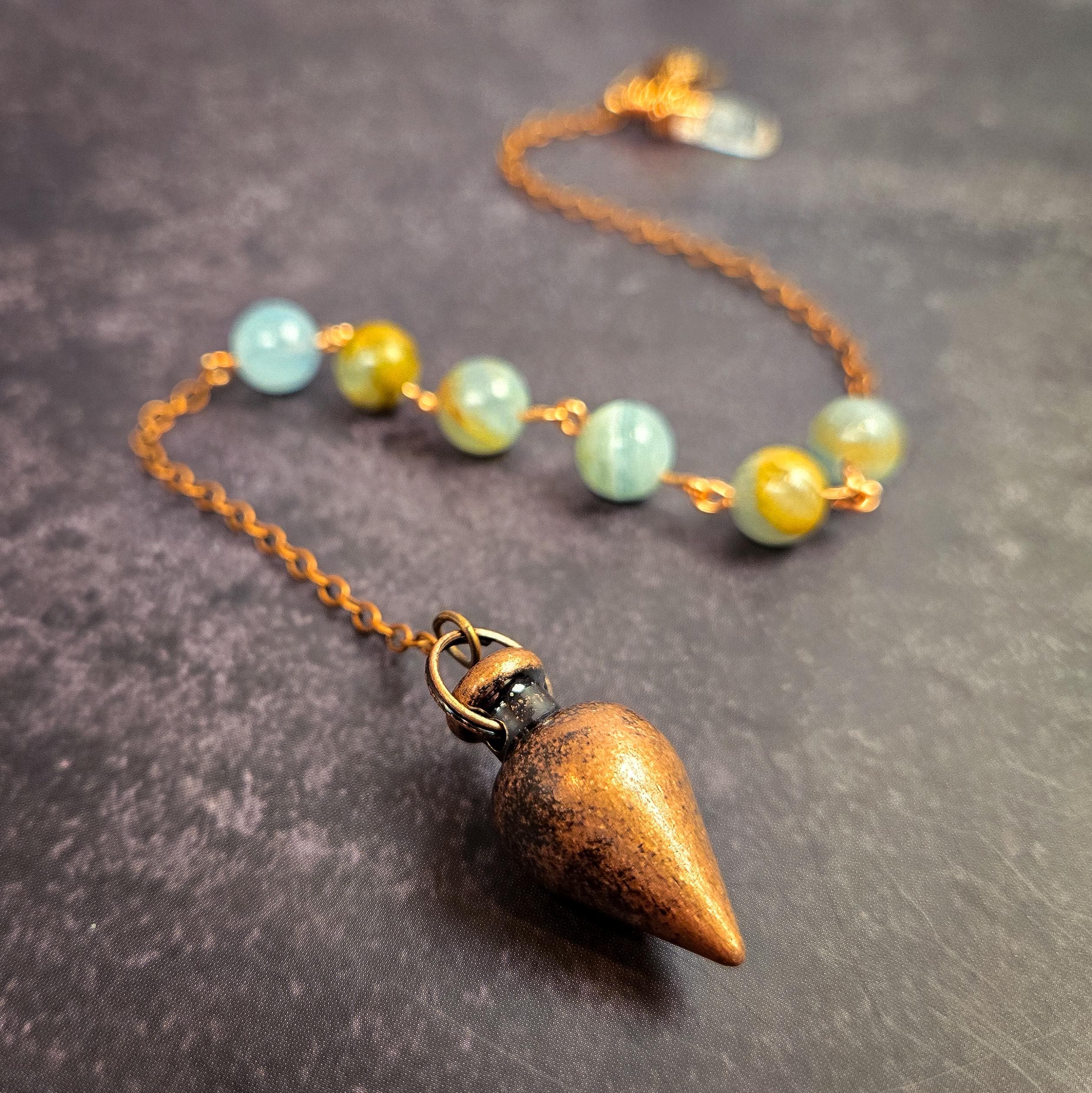 Caribbean blue calcite is often associated with emotional healing, inner peace, and heightened intuition. Its tranquil energy makes this pendulum especially well-suited for sensitive readings, meditation, and working through emotional or energetic blocks. Paired with copper, the result is a pendulum that feels both steady and deeply intuitive.