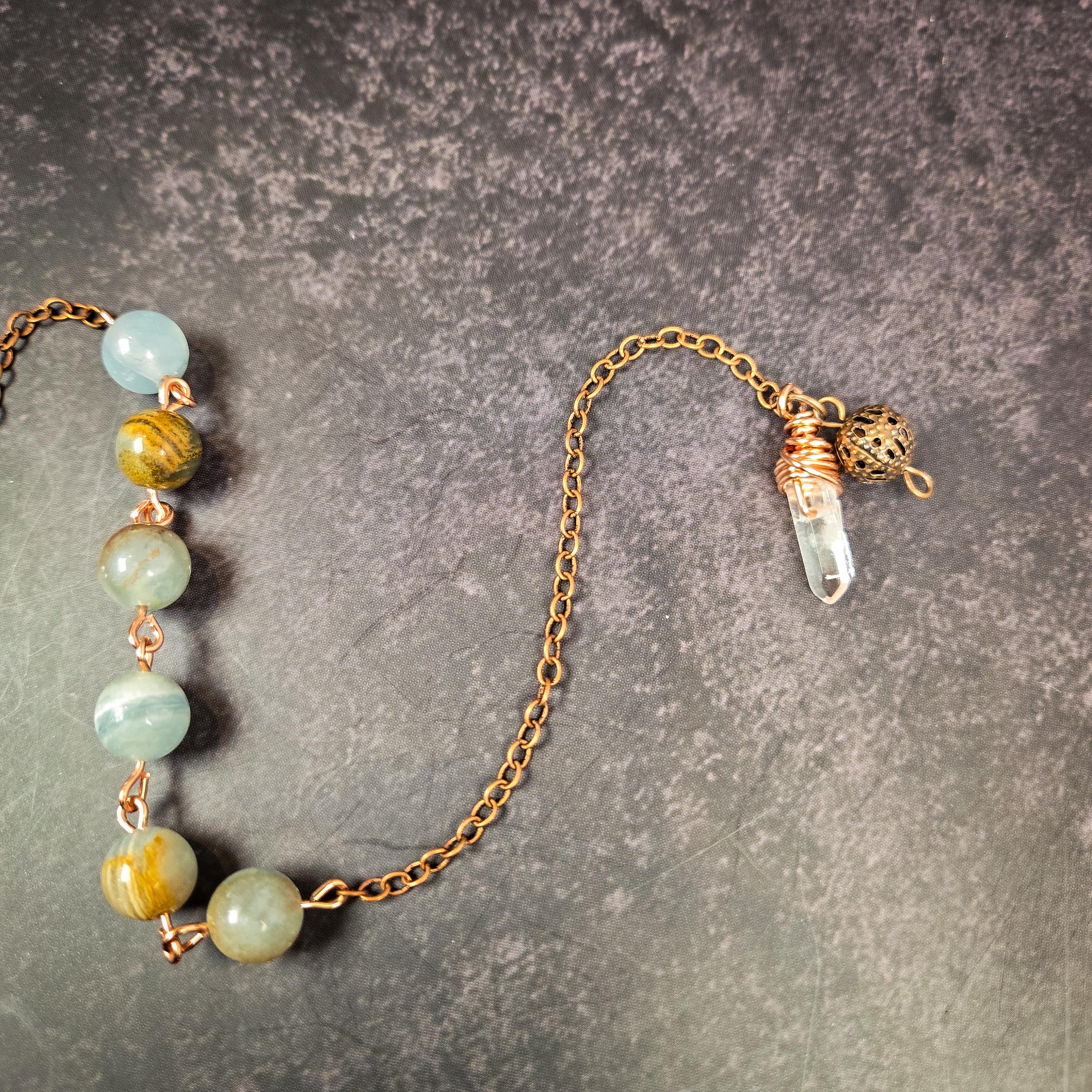 This copper pendulum with Caribbean blue calcite beads is a soothing yet powerful tool for divination, intuitive work, and emotional alignment. The copper pendulum point enhances energetic conductivity and responsiveness, while Caribbean blue calcite brings a calming, clarifying energy that supports clear communication and gentle insight.