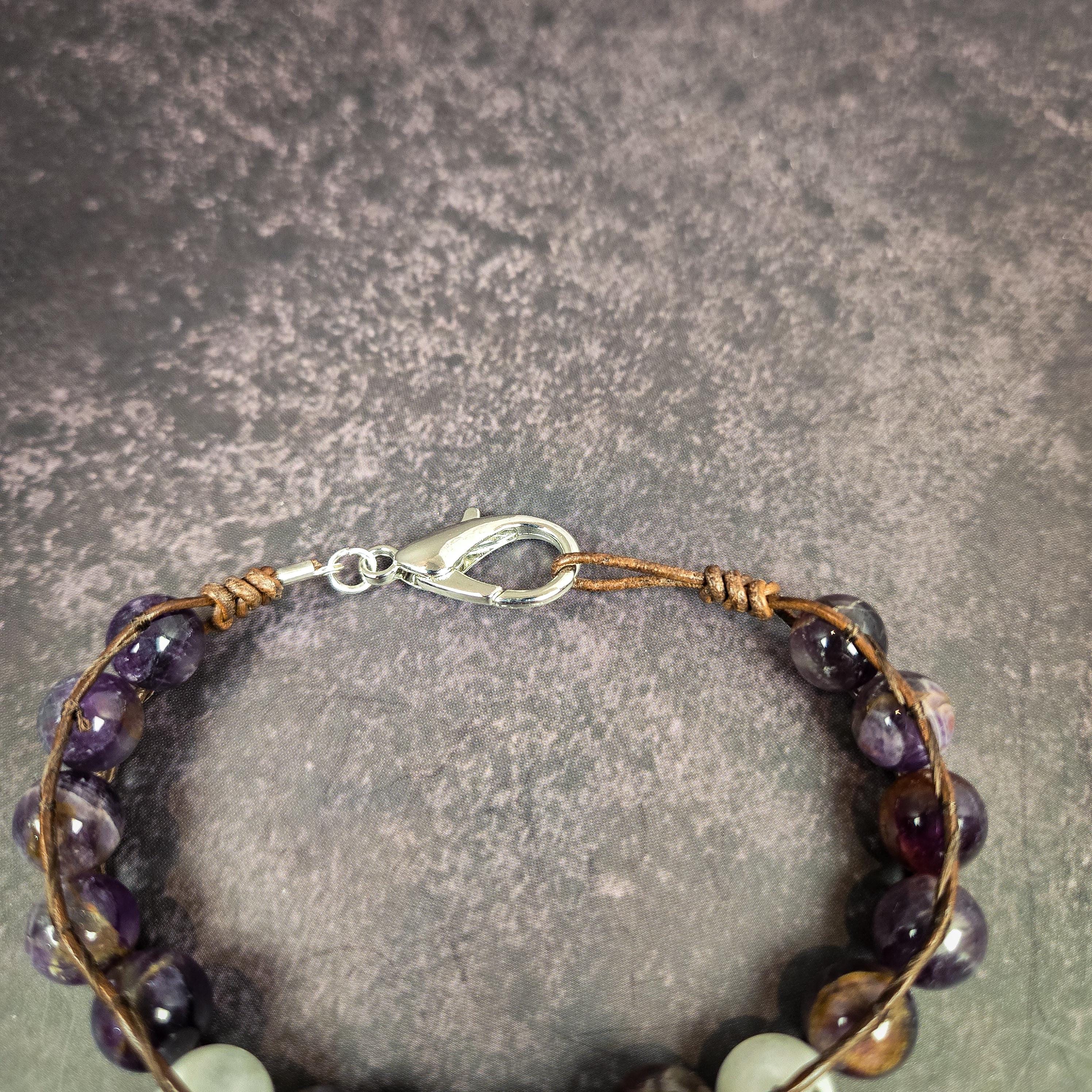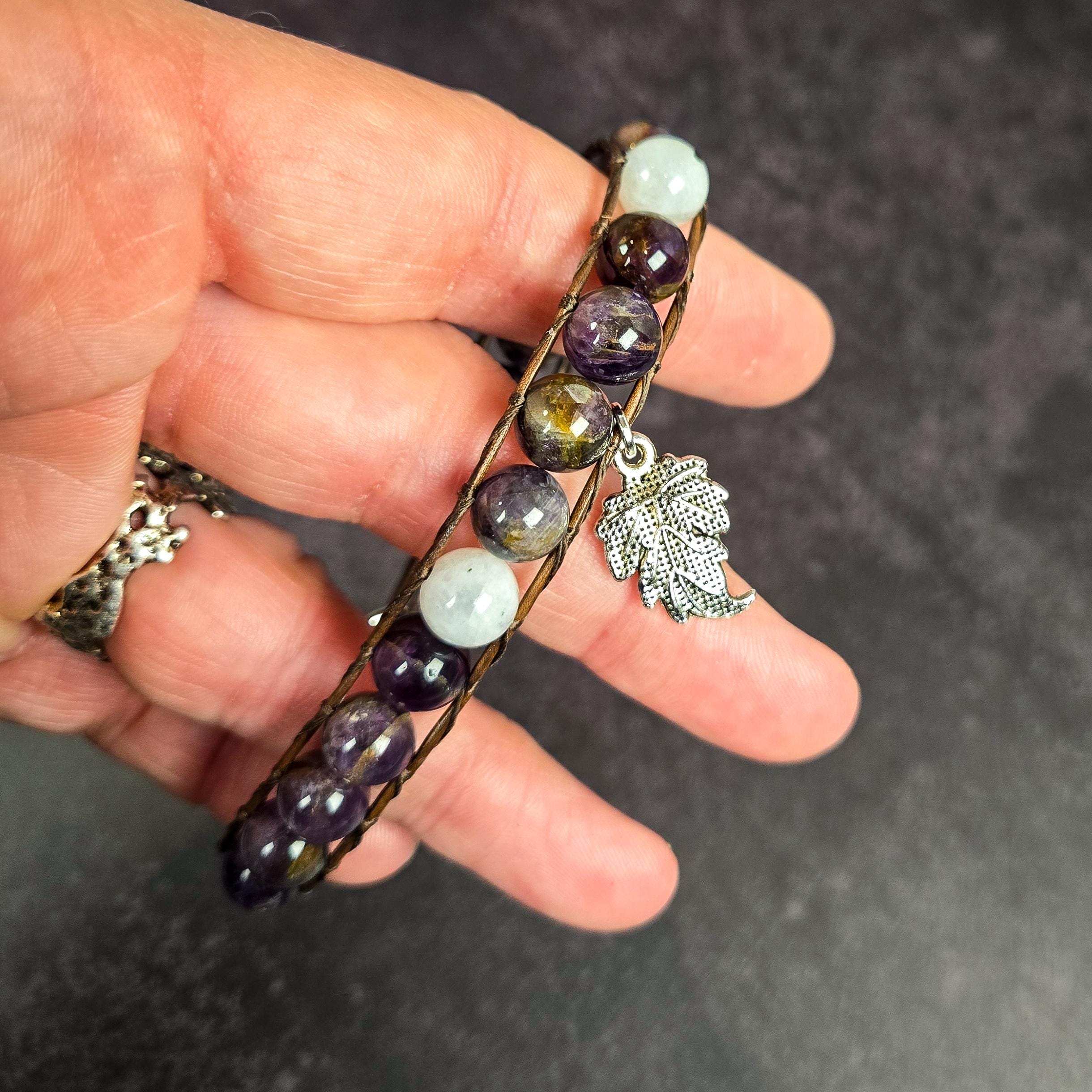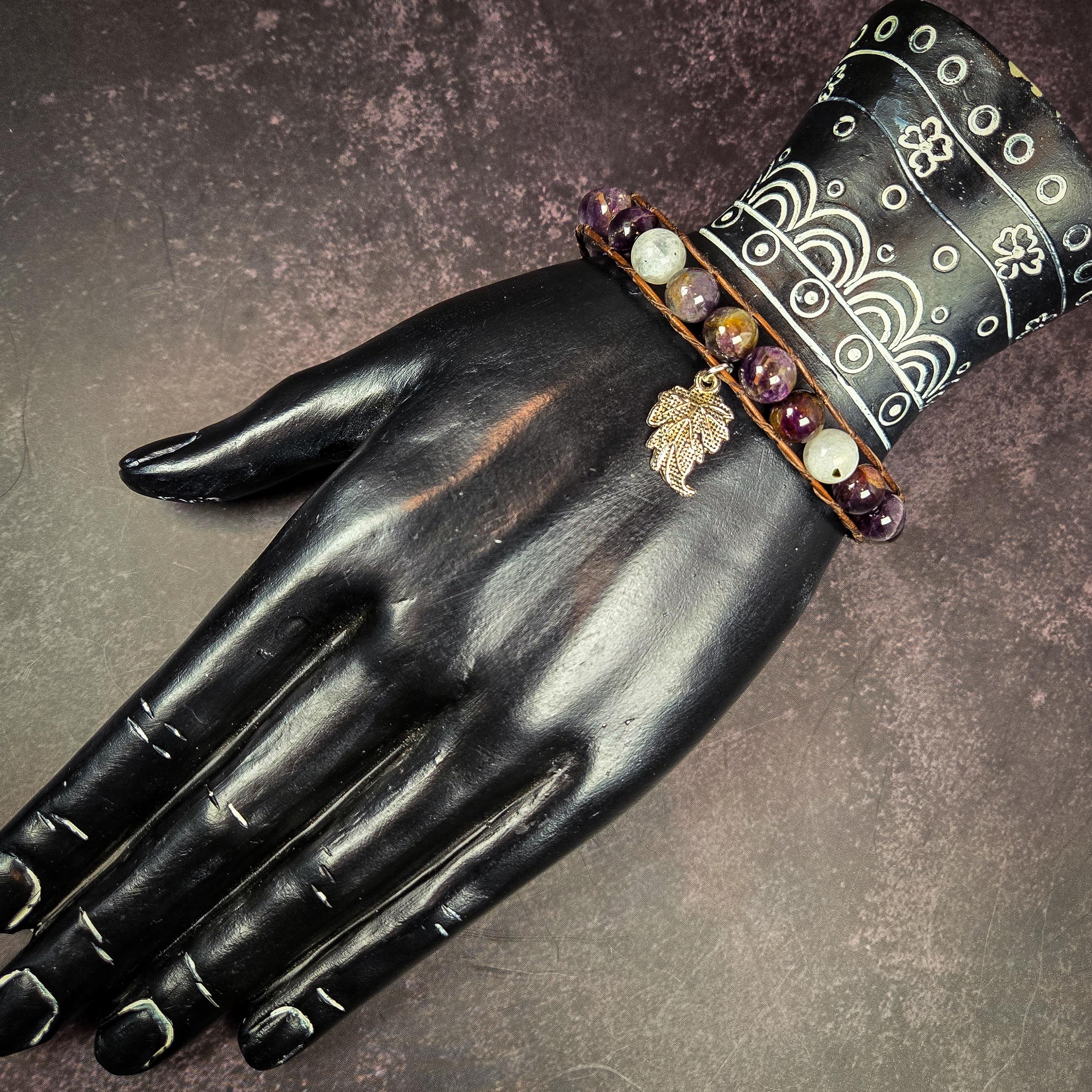 This beaded leather wrap bracelet is a grounding yet ethereal piece, handcrafted with purple ghost quartz and moonstone beads and finished with a detailed leaf charm. Wrapped on a durable leather cord, this bracelet blends natural textures with soft, intuitive energy, making it perfect for everyday wear or intentional spiritual practice.