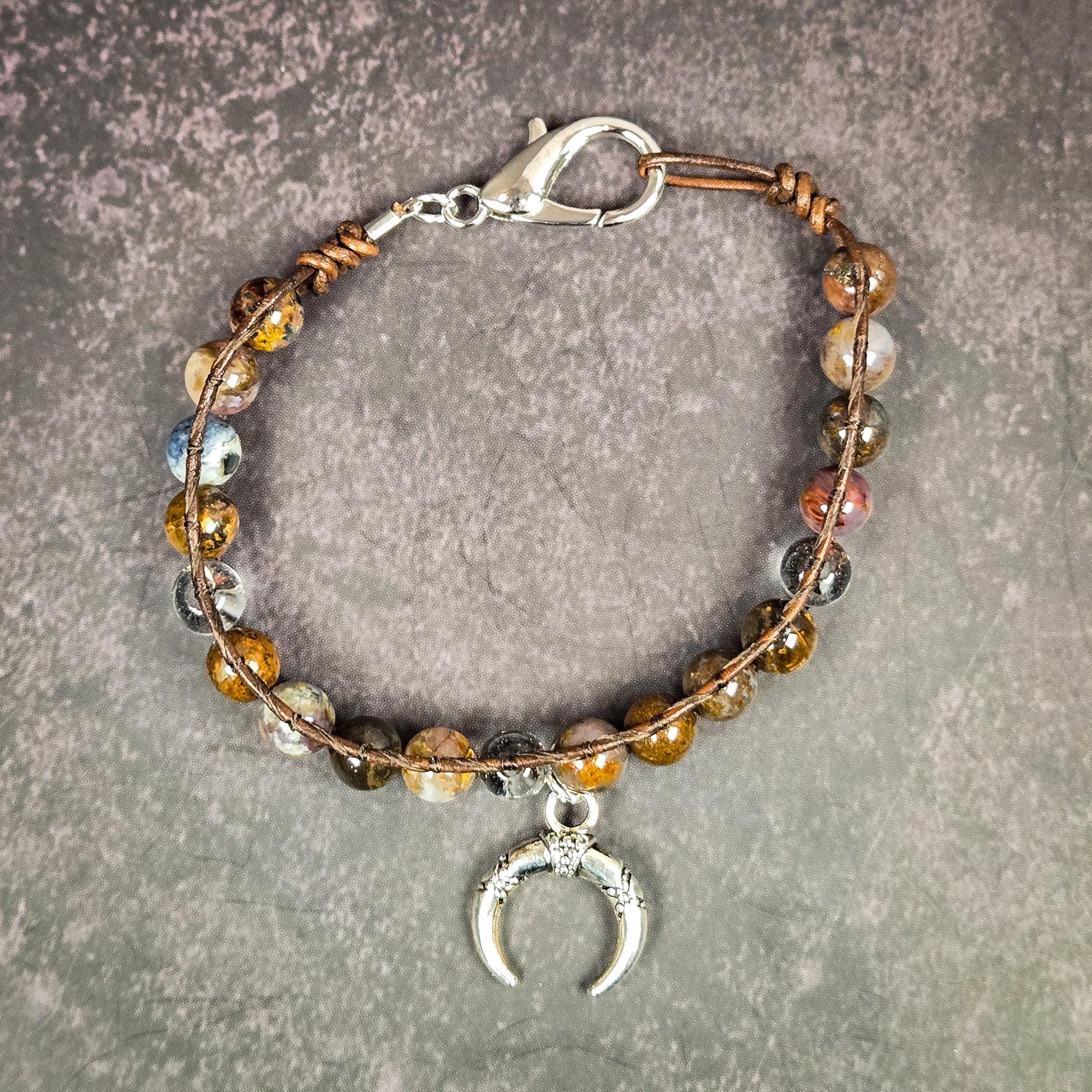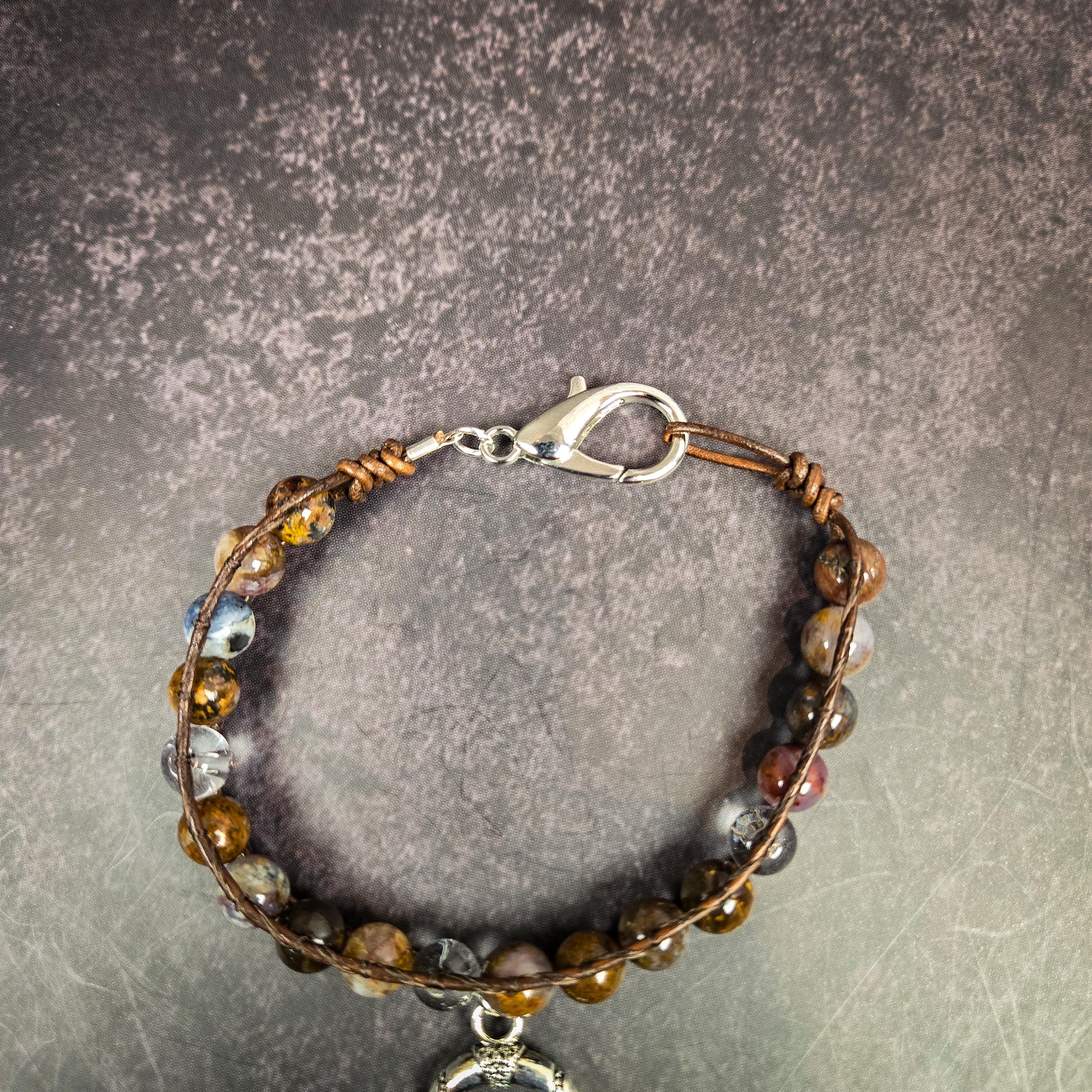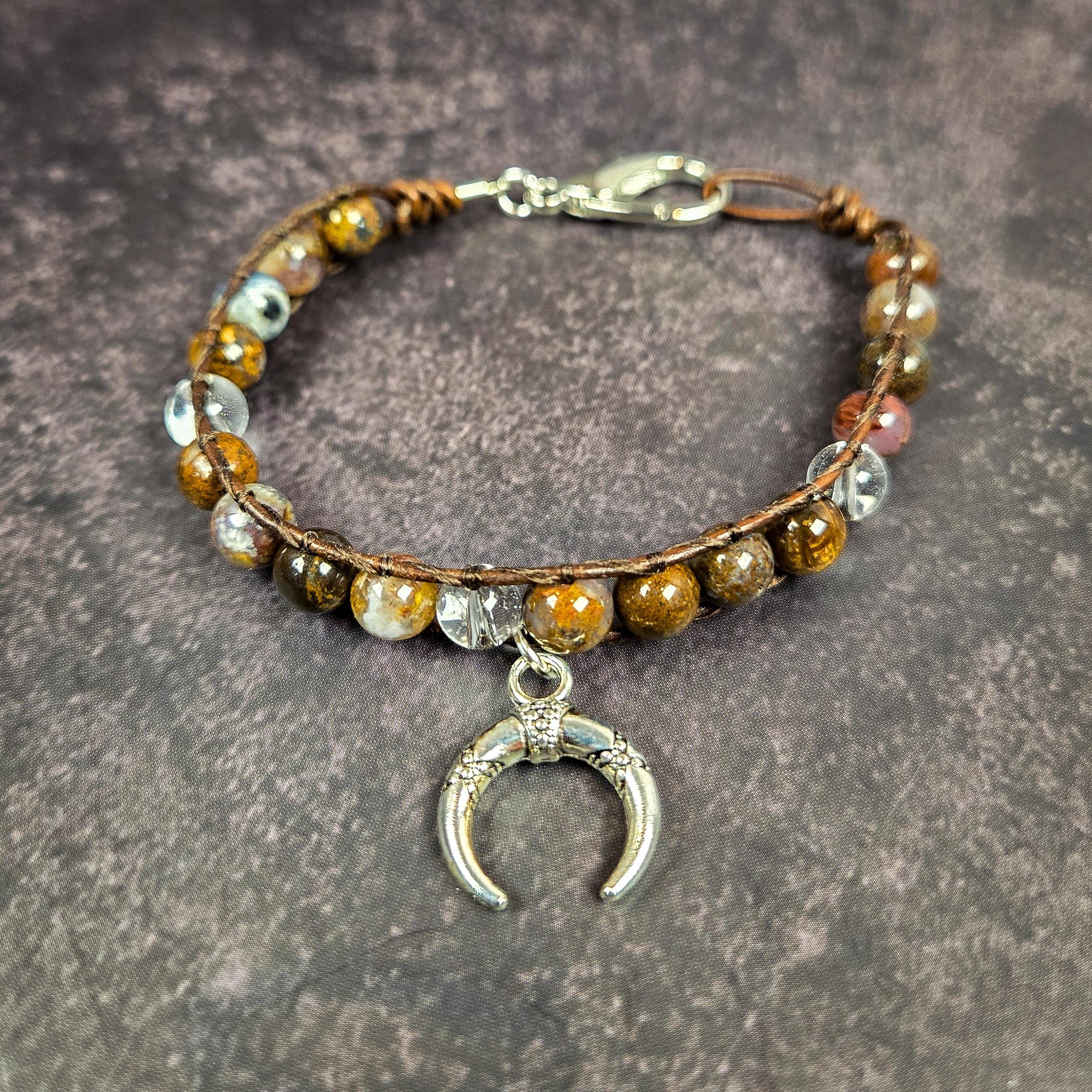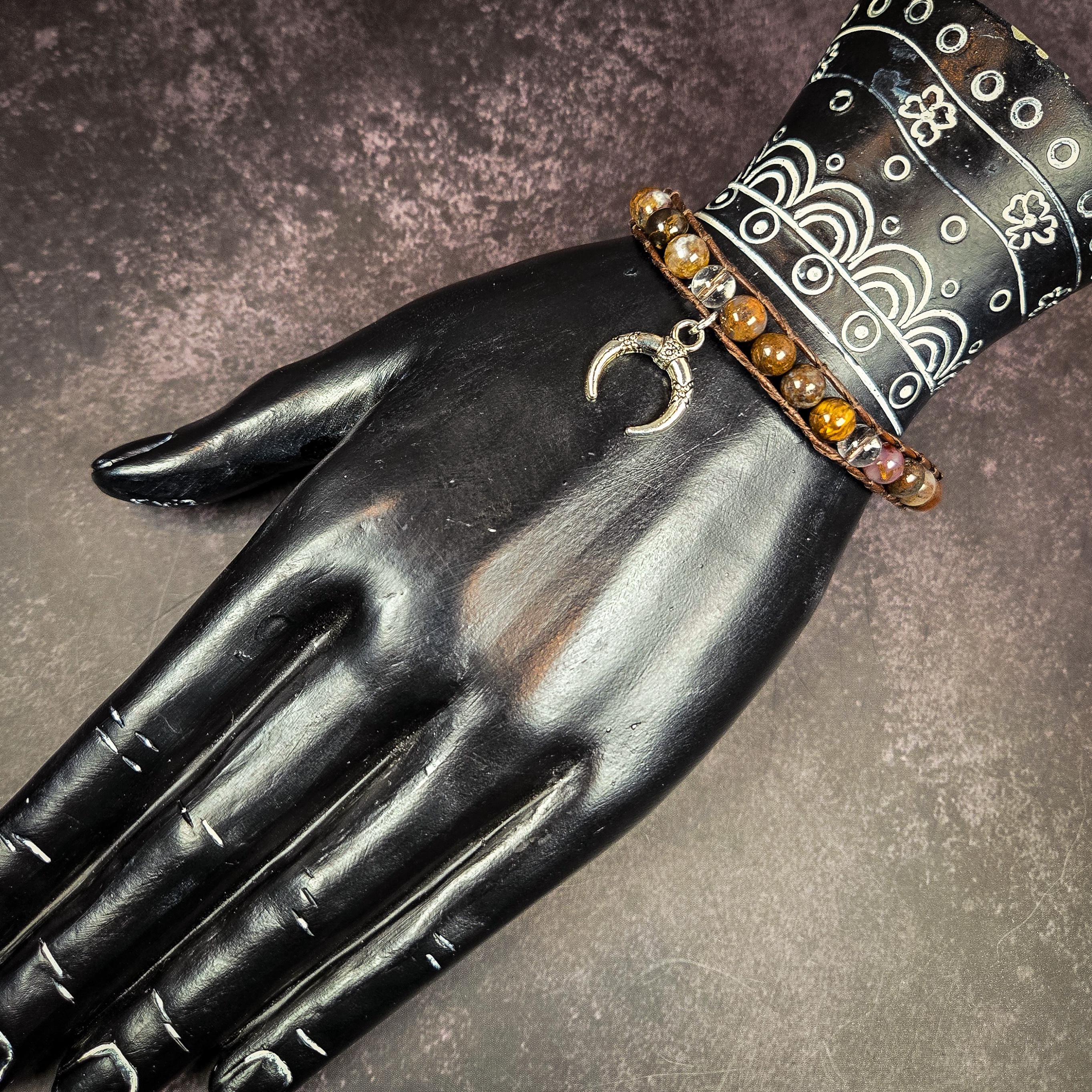 This pietersite and clear quartz beaded leather wrap bracelet is a striking, high-energy piece designed for spiritual focus, transformation, and clarity of intent. Handcrafted with rich, swirling pietersite beads and luminous clear quartz, then wrapped on durable leather cord, this bracelet carries both grounding and expansive energy.