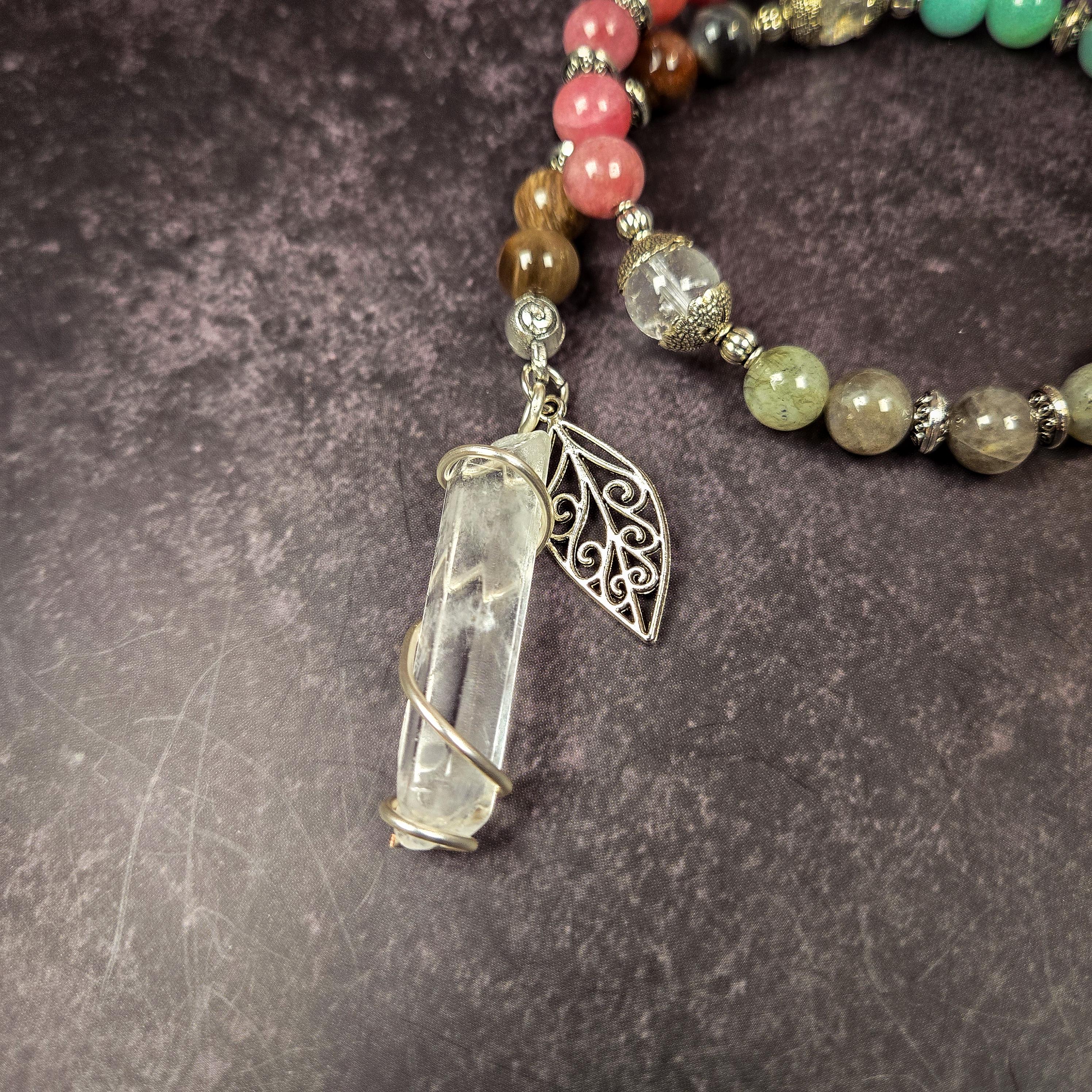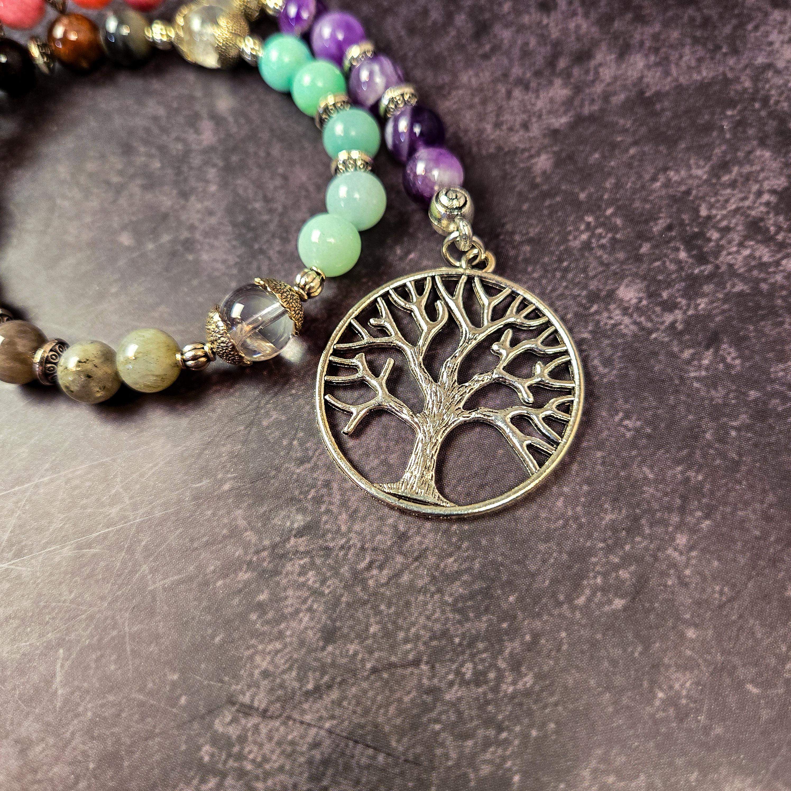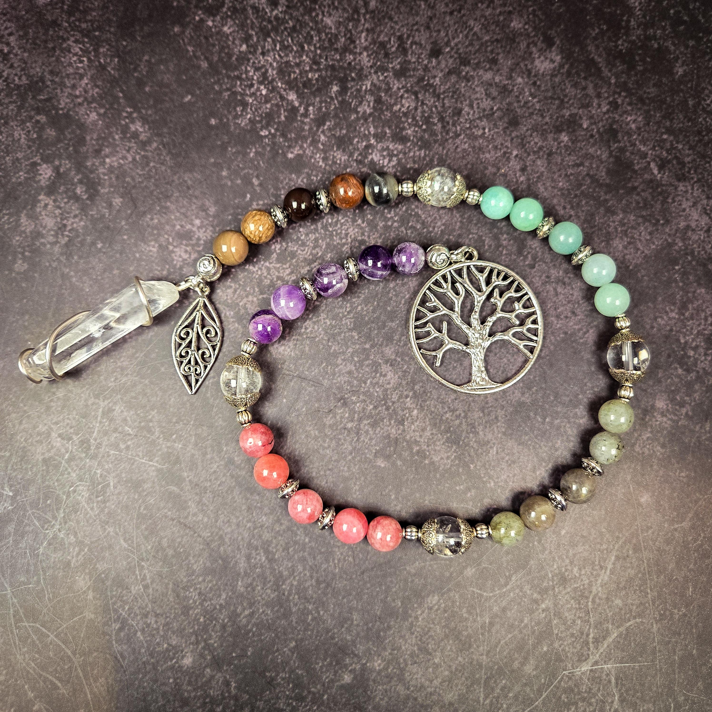 Introducing our Five Element Prayer Beads handcrafted with Amethyst, Sunstone, Labradorite, Amazonite, and Petrified Wood beads. This unique creation serves as a profound tool for balancing and connecting with the fundamental forces that shape our universe.