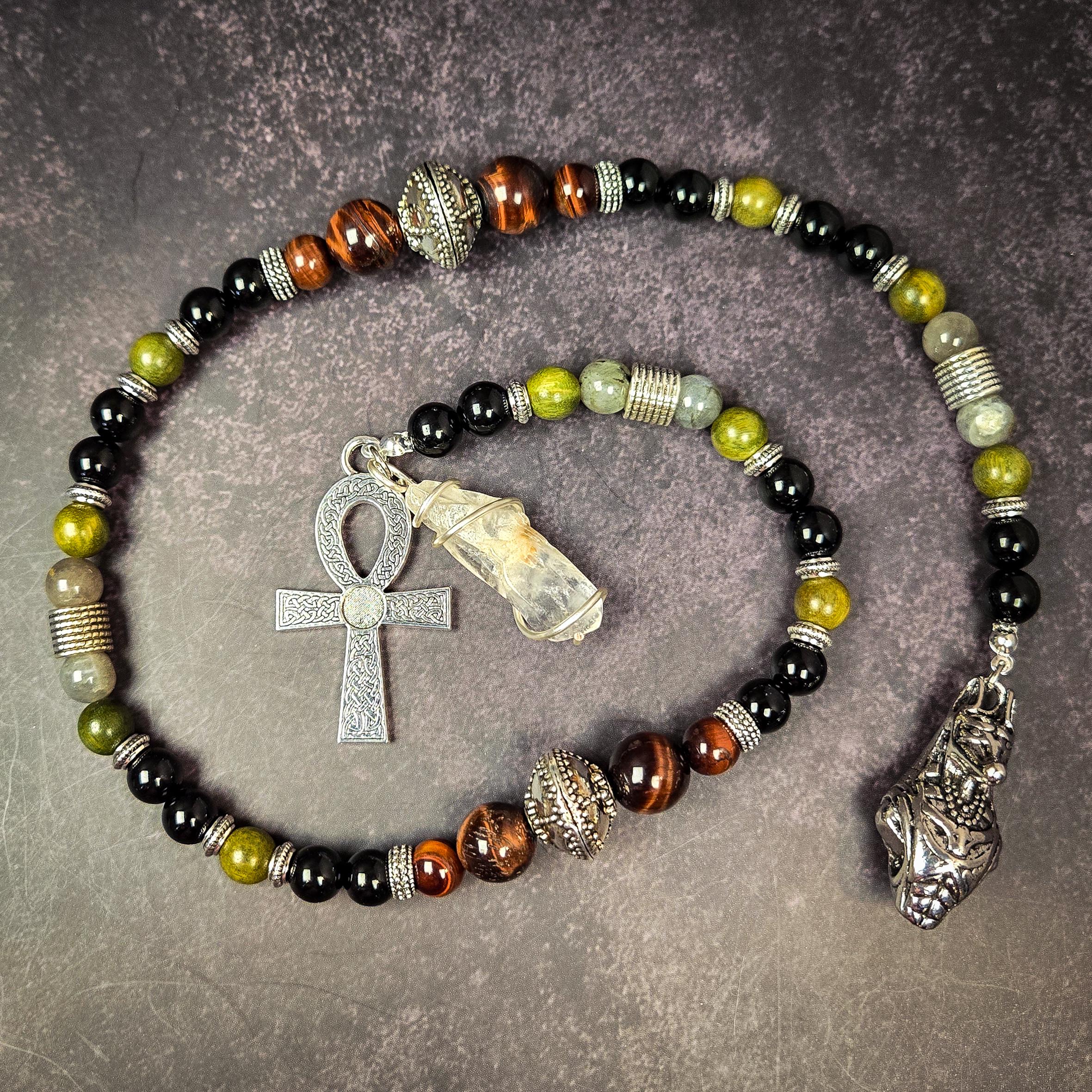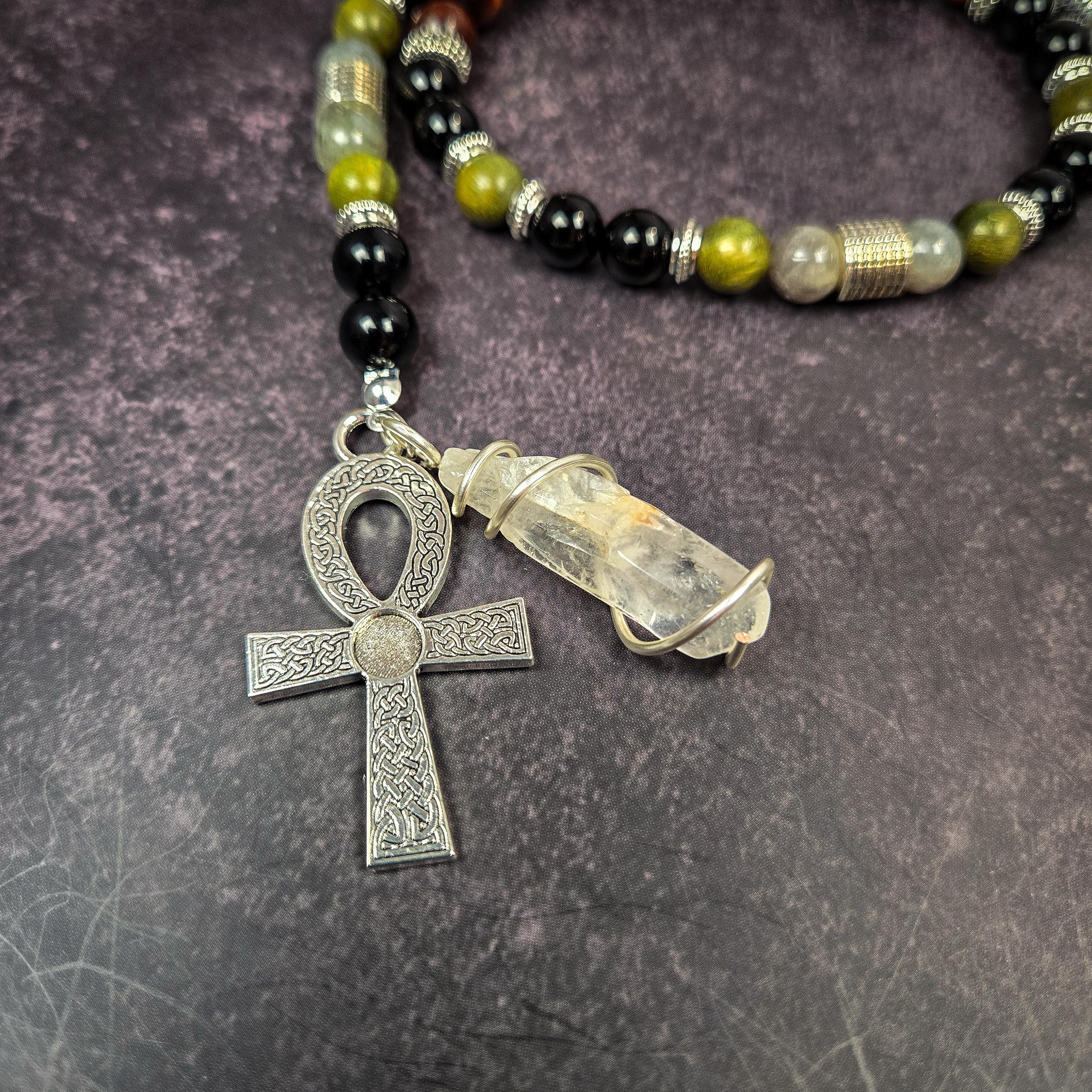 Adorned with a silver-tone Ankh charm representing eternal life and a stylized Anubis head pendant, this piece is perfect for devotional use, meditation, or as a sacred altar tool. A raw quartz point, wrapped in wire, completes the piece to amplify the energy of your workings.
