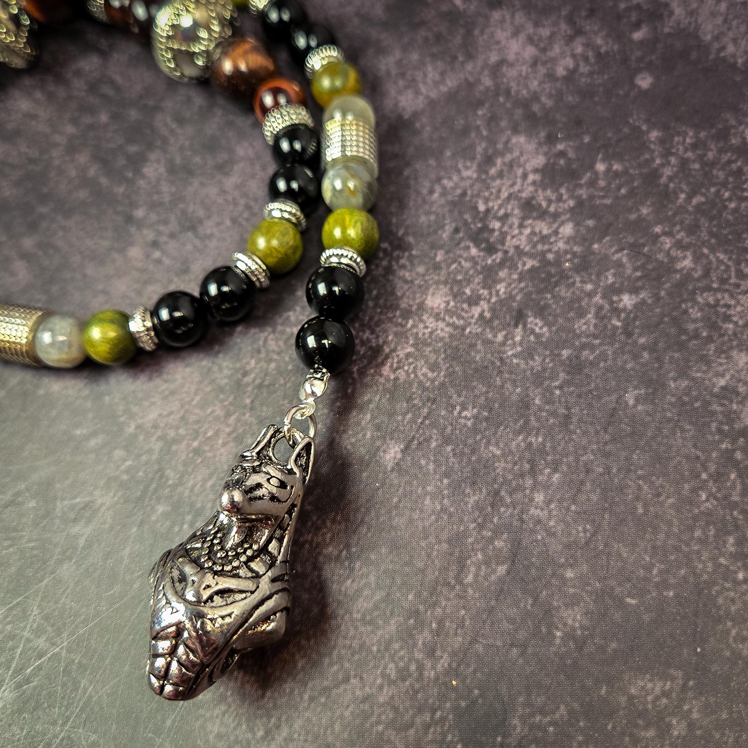 Honor the ancient Egyptian god Anubis, guardian of the dead and guide of souls, with this powerful set of handcrafted devotional prayer beads. Created with deep reverence, this piece weaves together sacred stones and symbolism to reflect Anubis’s role as protector, judge, and psychopomp.
