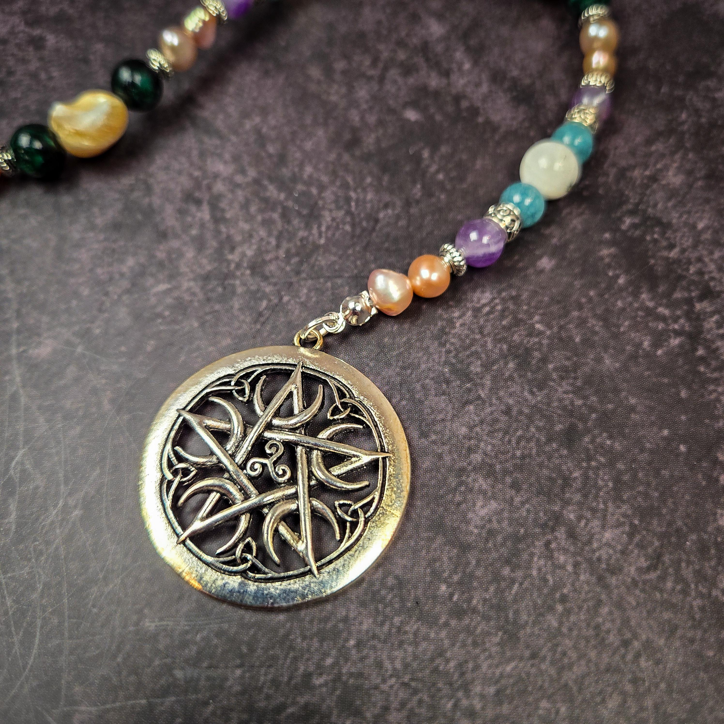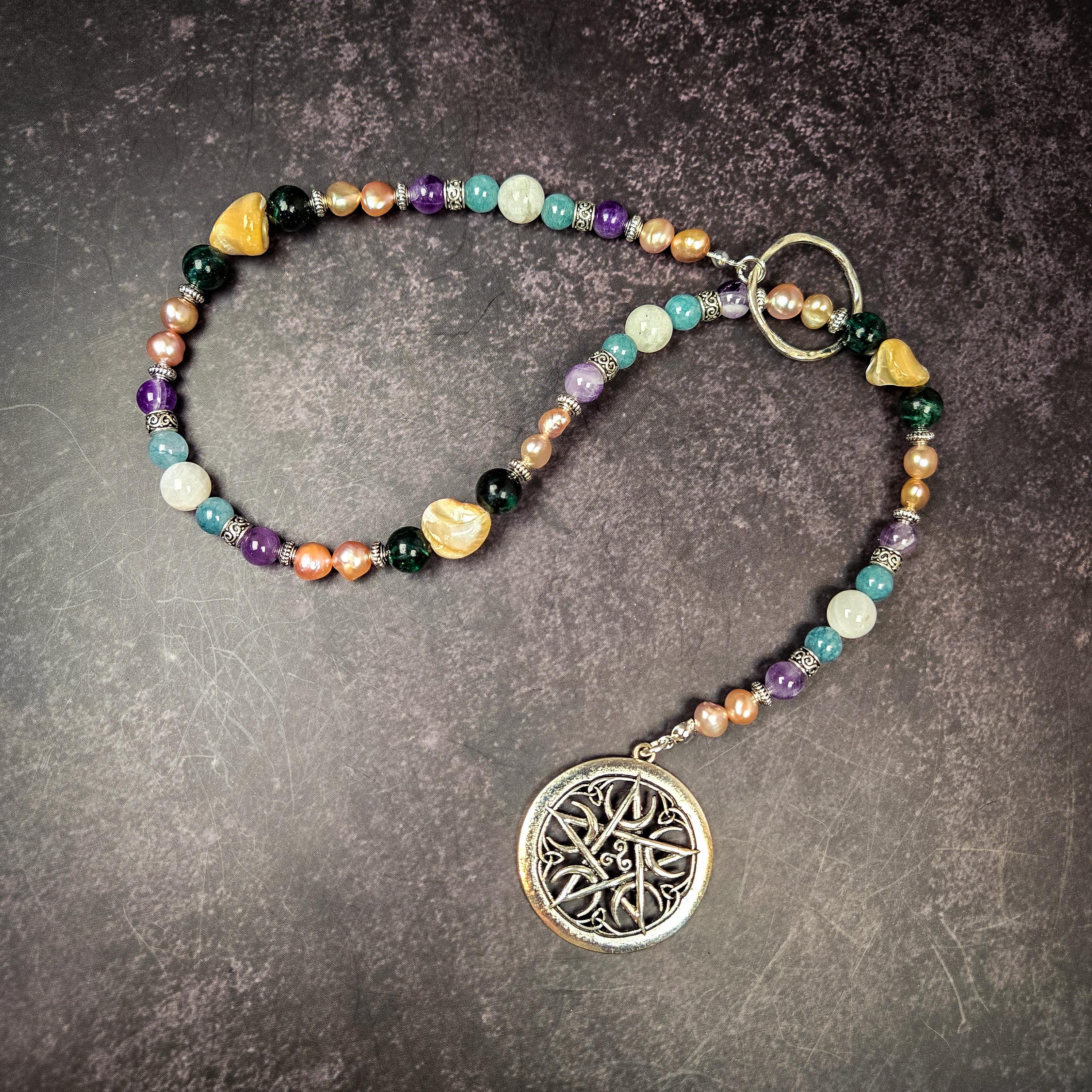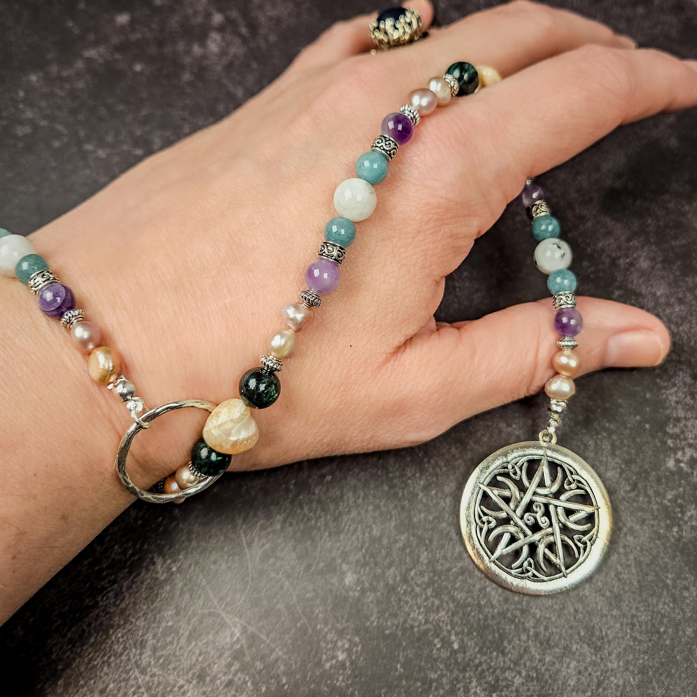 Adorned with an intricate pentacle focal point, this wrist rosary is designed to move with you, acting as a portable altar for those who work with water spirits, sea magic, or emotional healing. Use it to ground yourself in the present moment or to amplify your connection to the subconscious.