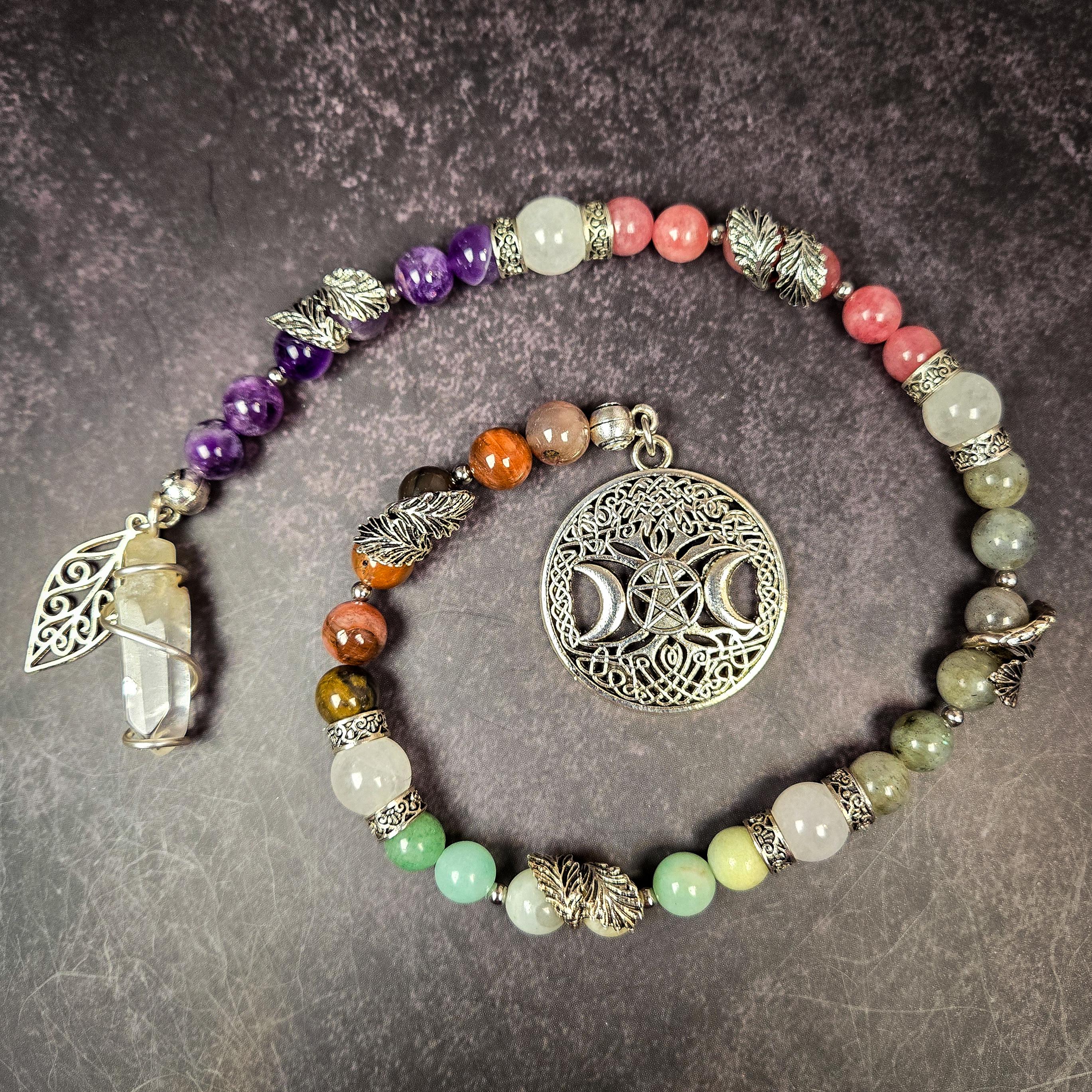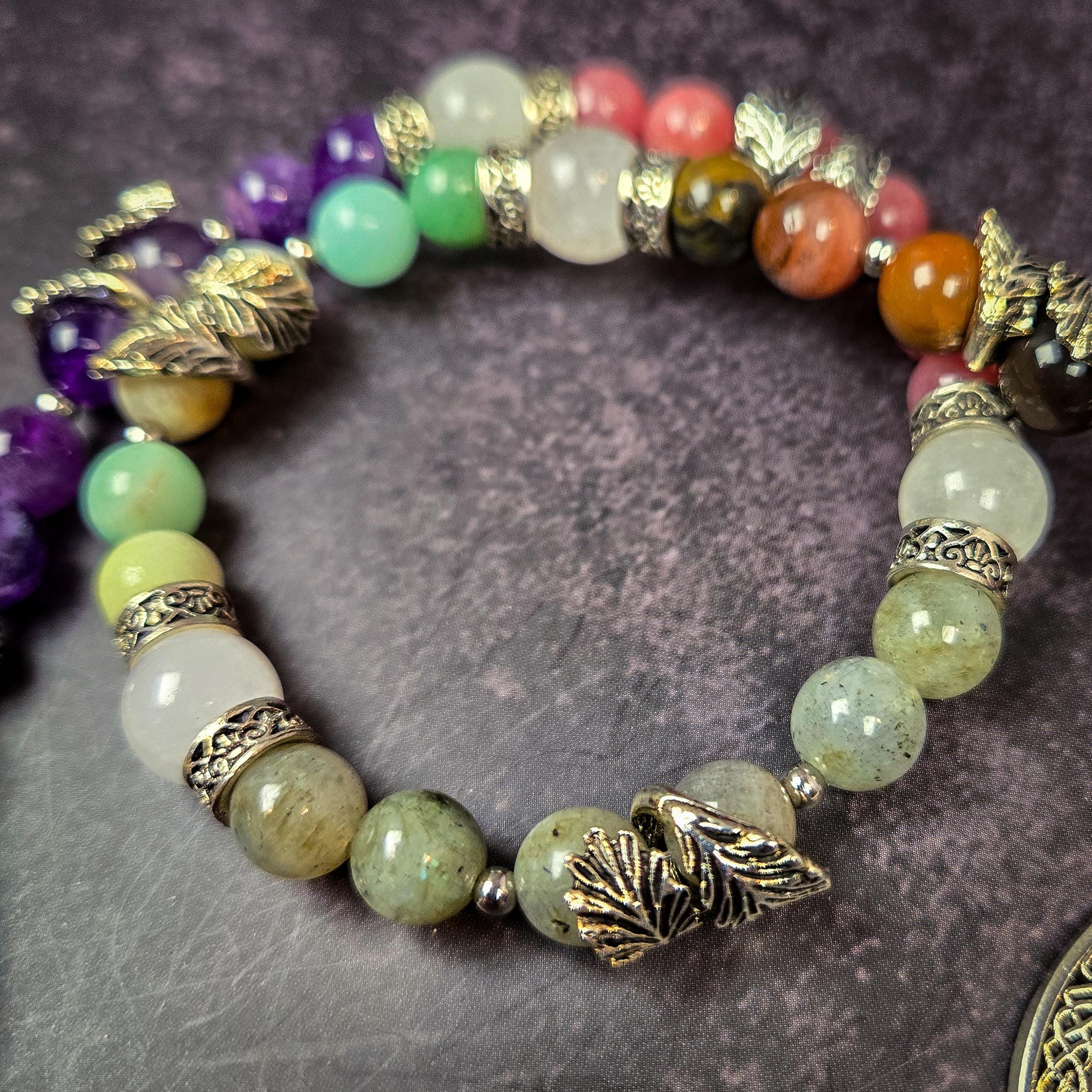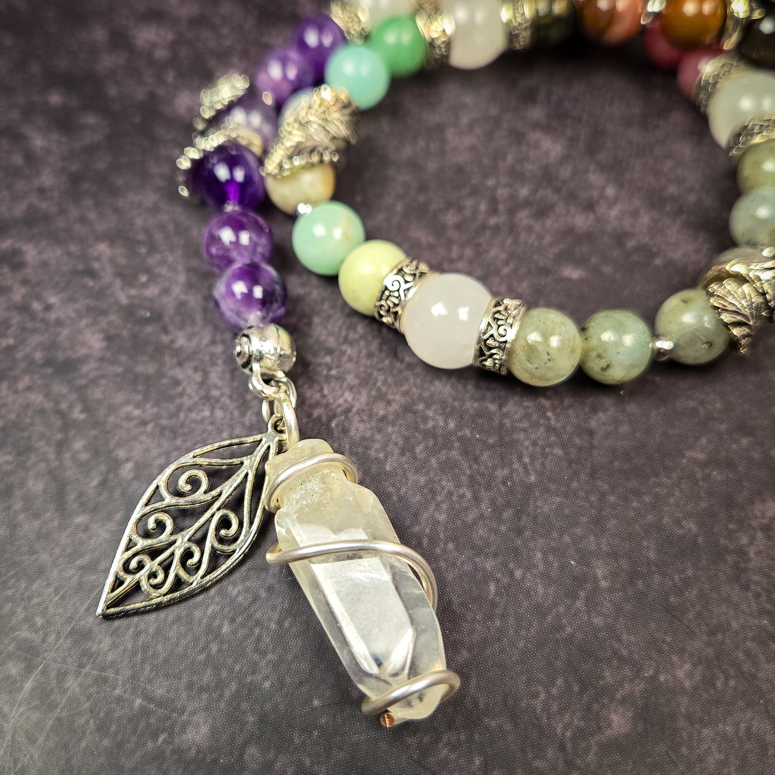 Introducing our Five Element Prayer Beads handcrafted with Amethyst, Sunstone, Labradorite, Amazonite, and Petrified Wood beads. This unique creation serves as a profound tool for balancing and connecting with the fundamental forces that shape our universe.