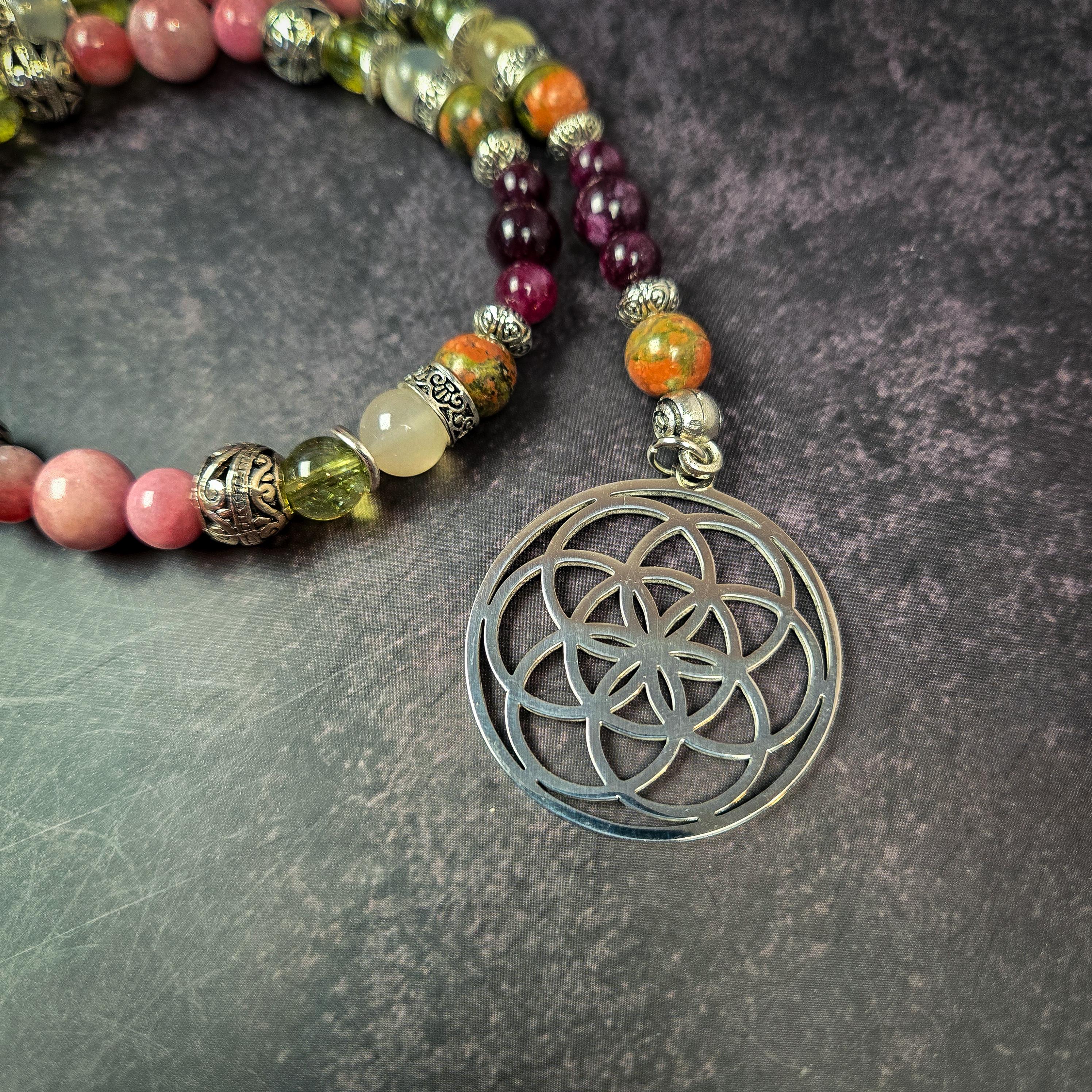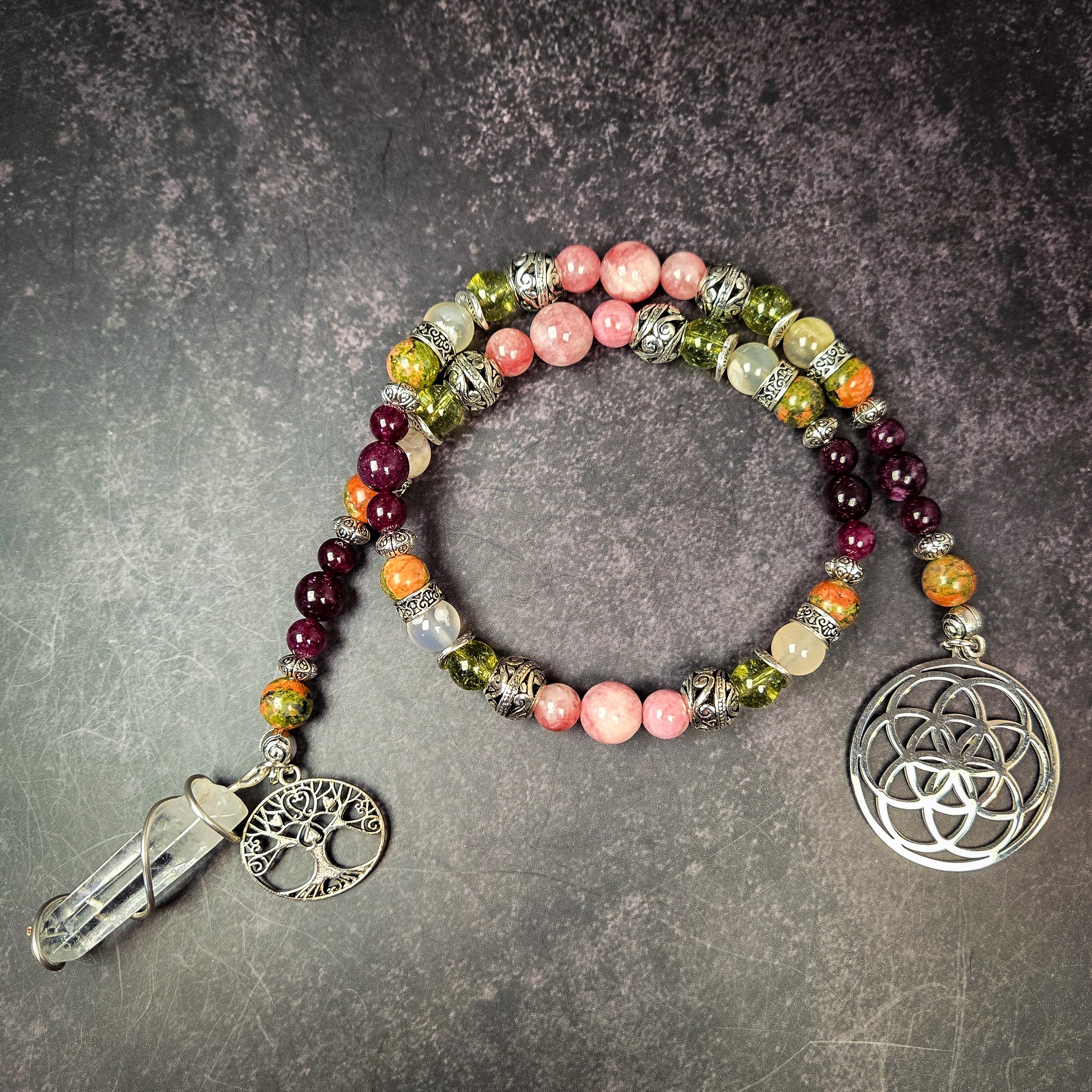 Step into the duality of light and shadow with these handcrafted prayer beads dedicated to Persephone, the Greek goddess of spring and queen of the underworld. Made with garnet, peridot, flower agate, unakite, and sunstone, this set reflects Persephone’s unique balance of renewal and mystery, making it an ideal companion for meditation, rituals, or offerings to her.