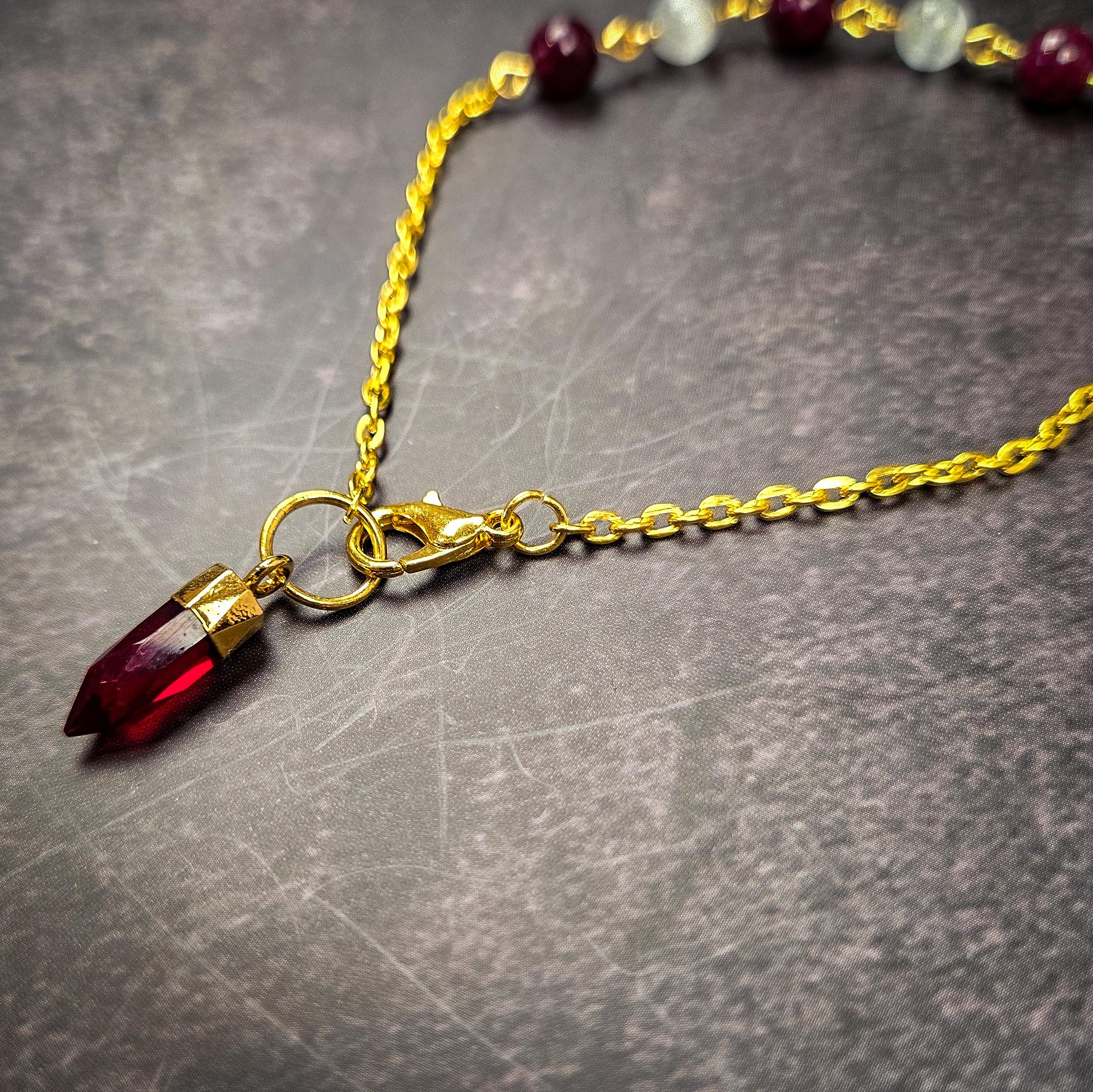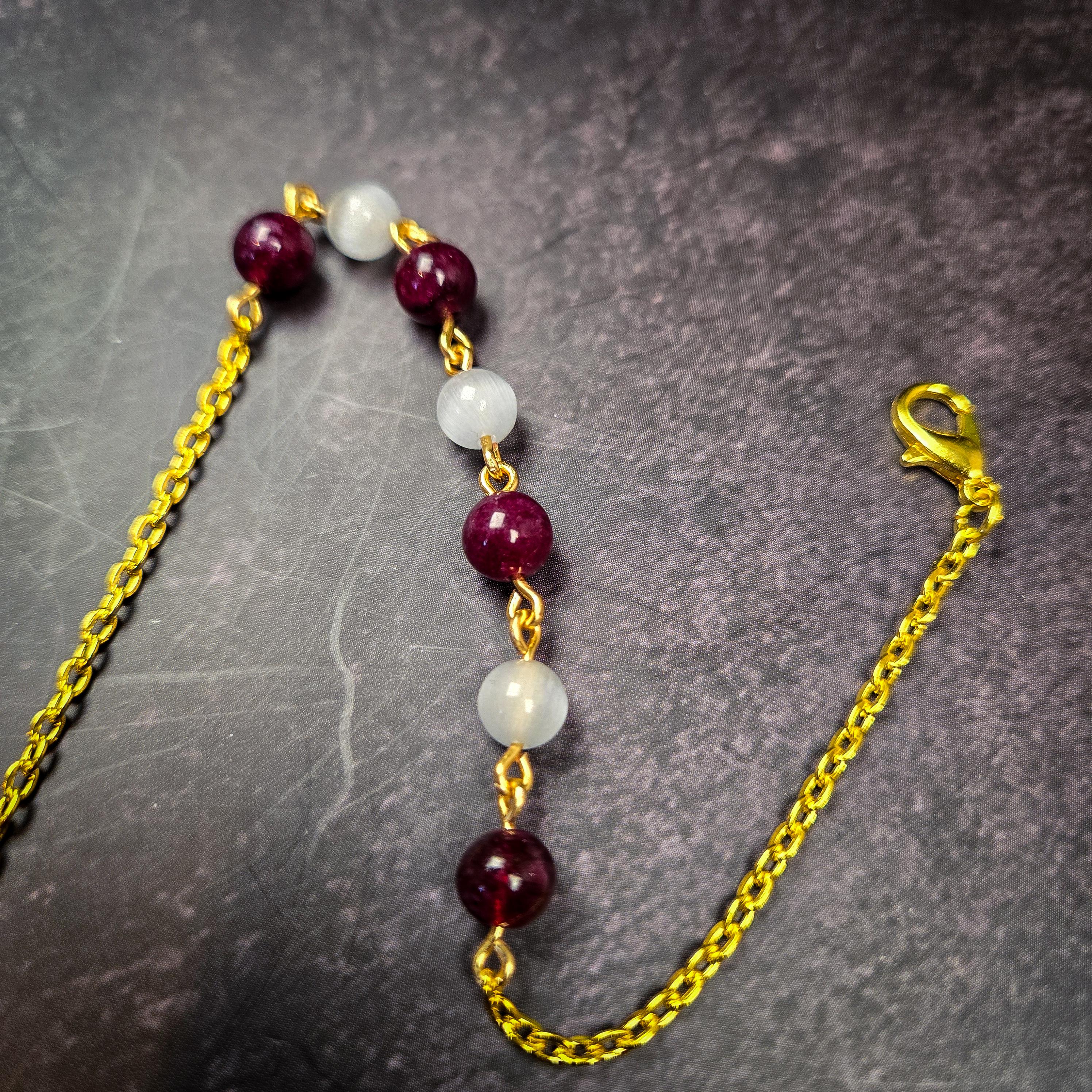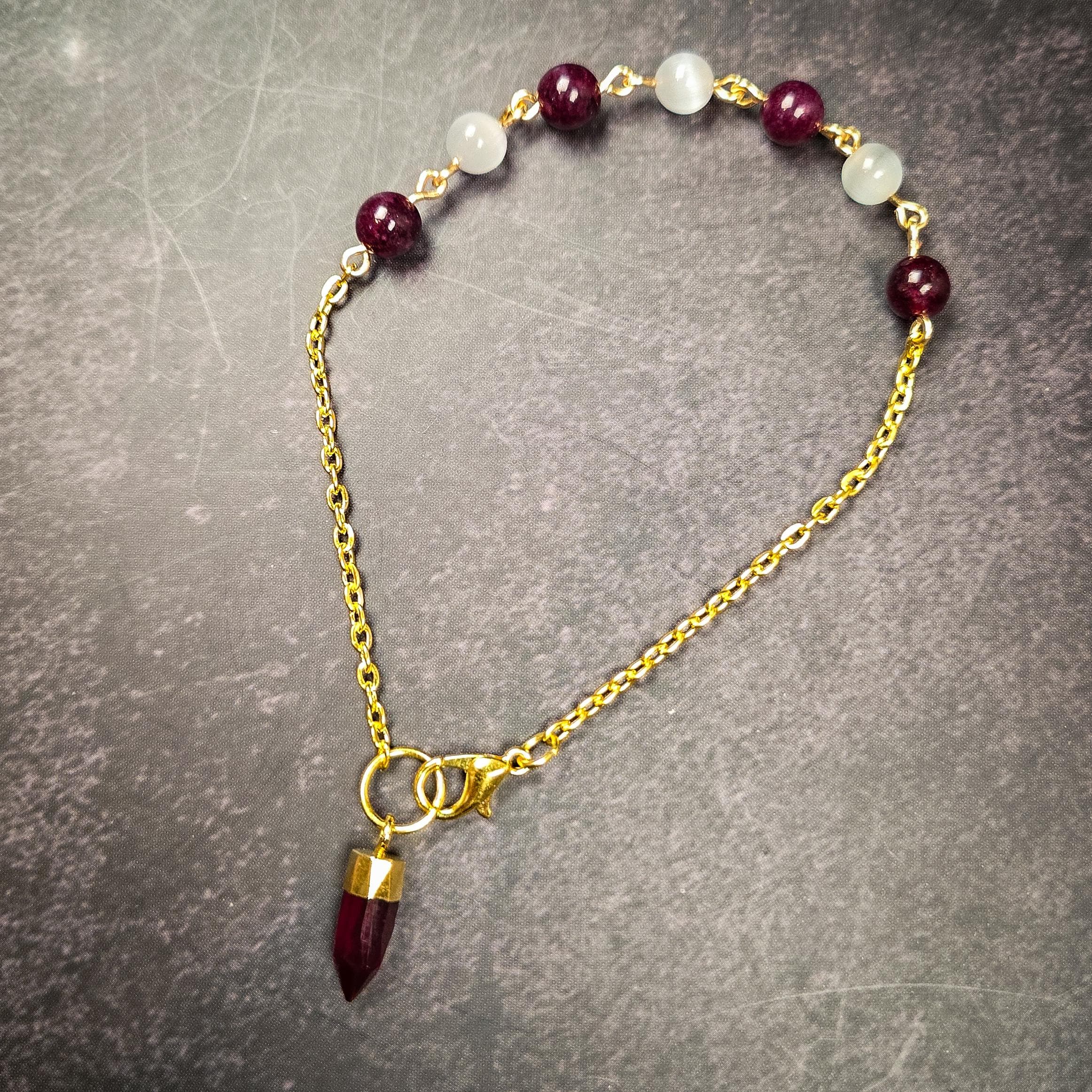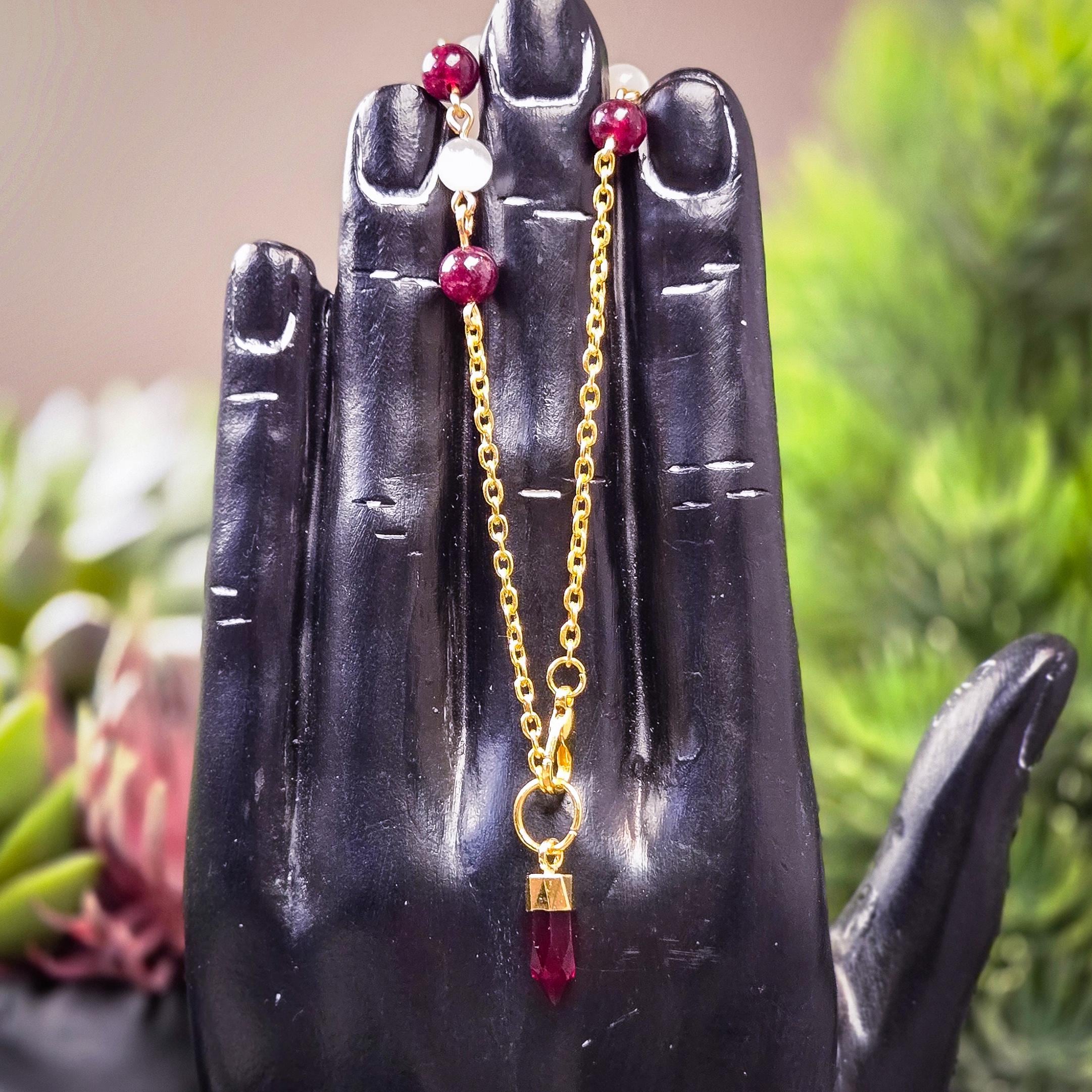 Invite balance, clarity, and empowered intention into your practice with this handcrafted garnet and selenite pendulum bracelet. Featuring a deep red garnet pendulum point, accented with garnet and selenite beads on a gold-tone chain, this piece is designed to be both beautiful and energetically purposeful.