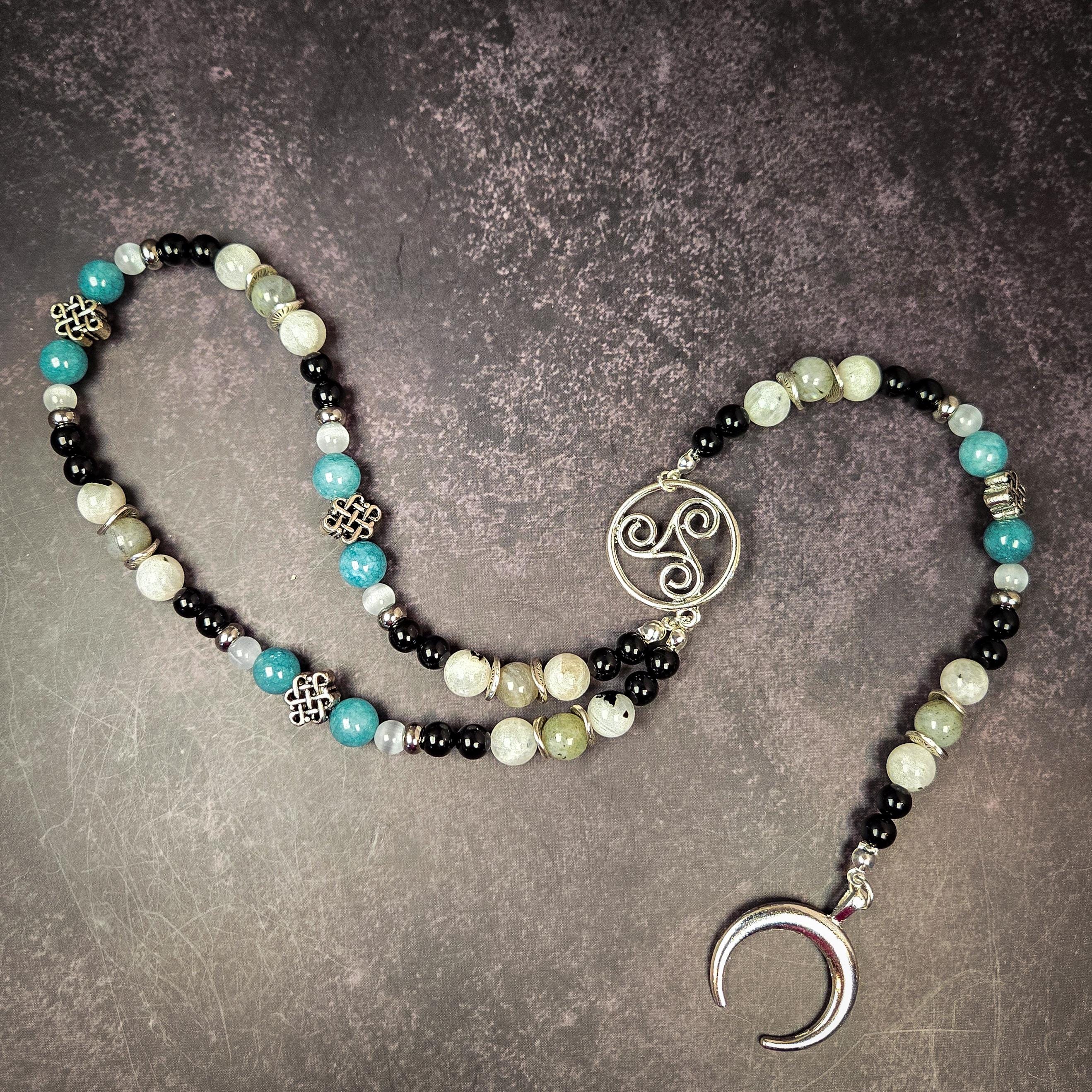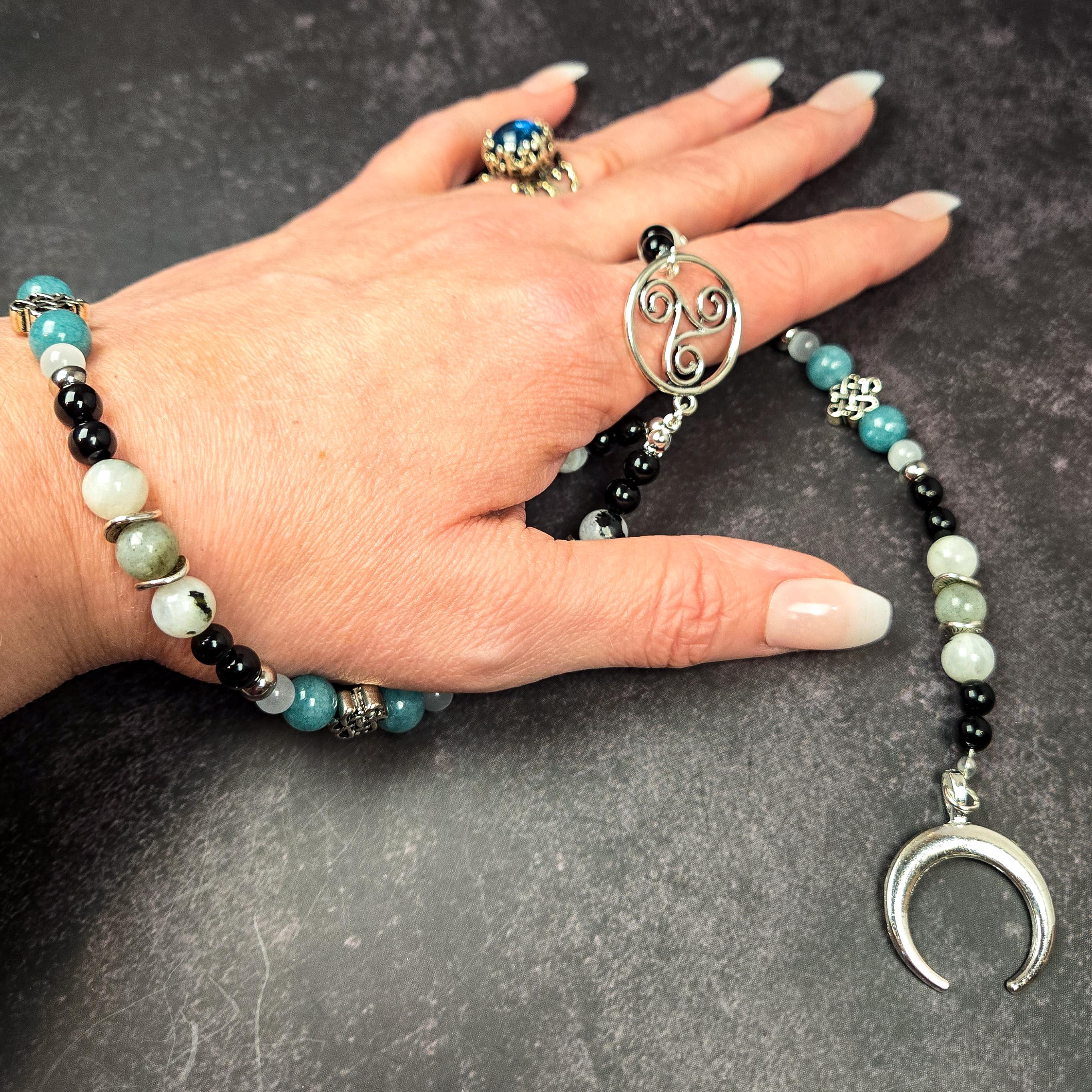 Honor Arianrhod, the Welsh goddess of the moon, stars, and the weaving of fate, with this handcrafted wrist rosary. Associated with the Silver Wheel and the celestial cycles, Arianrhod embodies destiny, intuition, sovereignty, and the mysteries of the night sky.