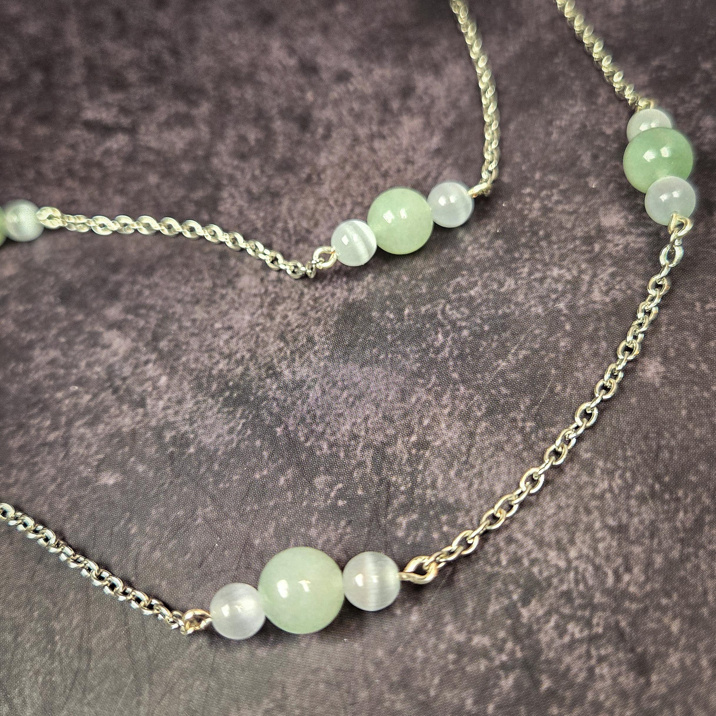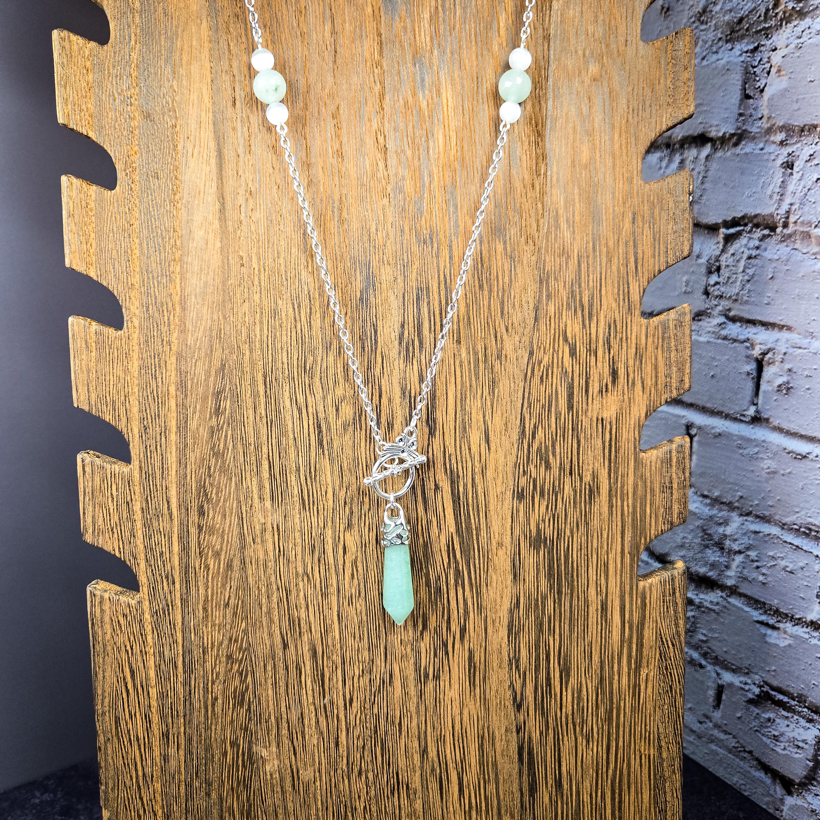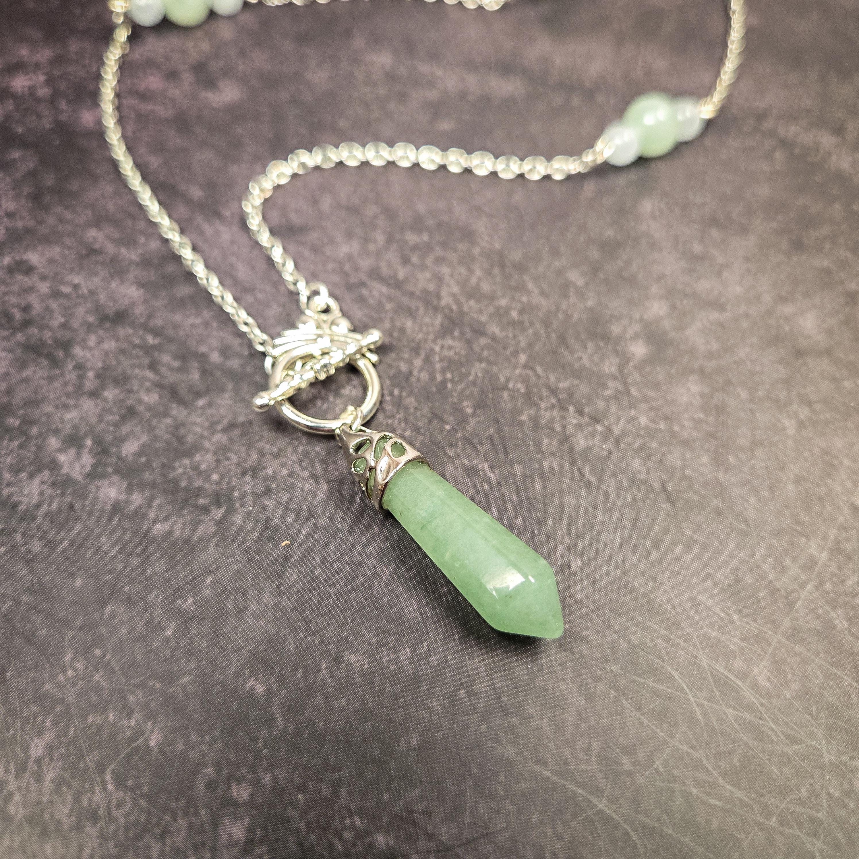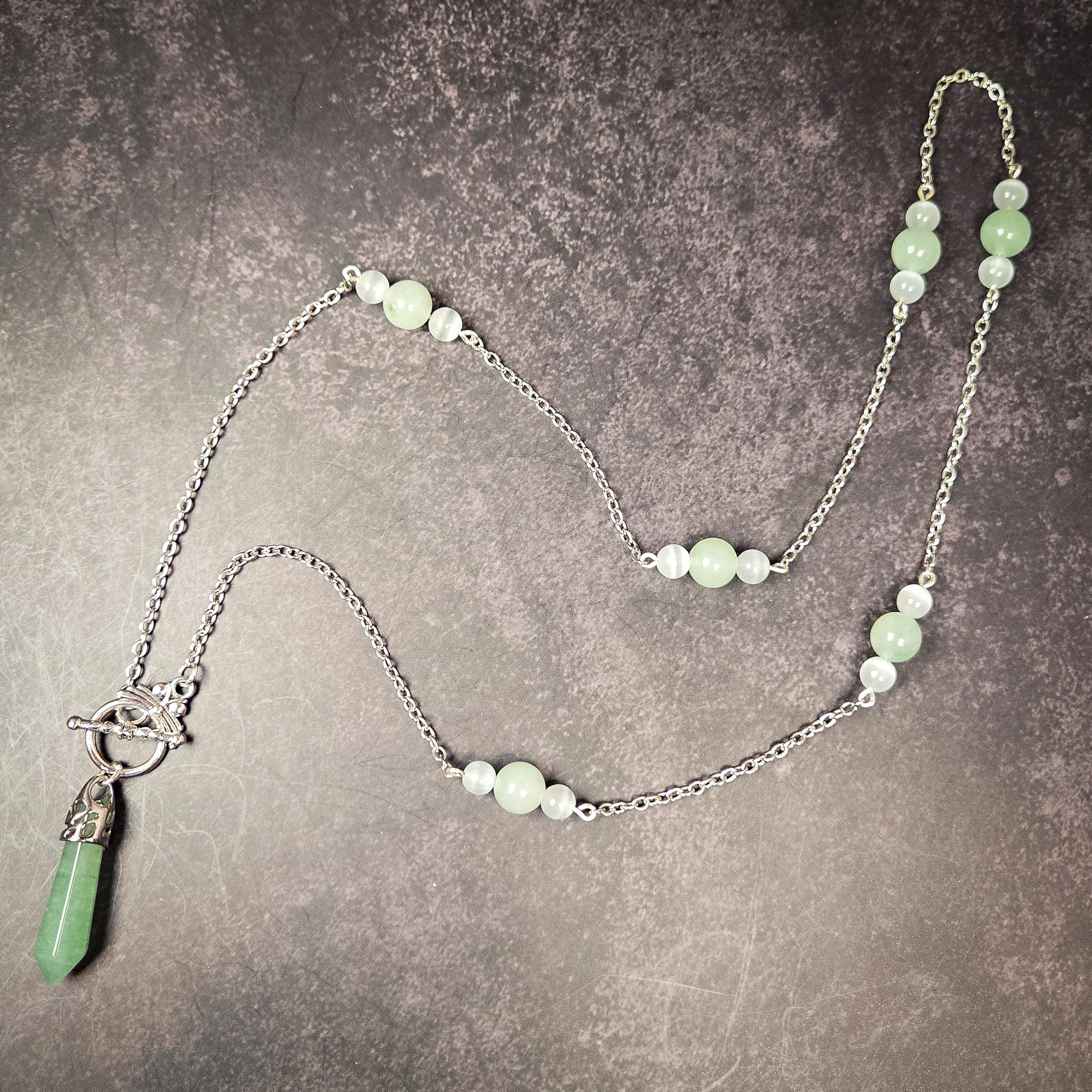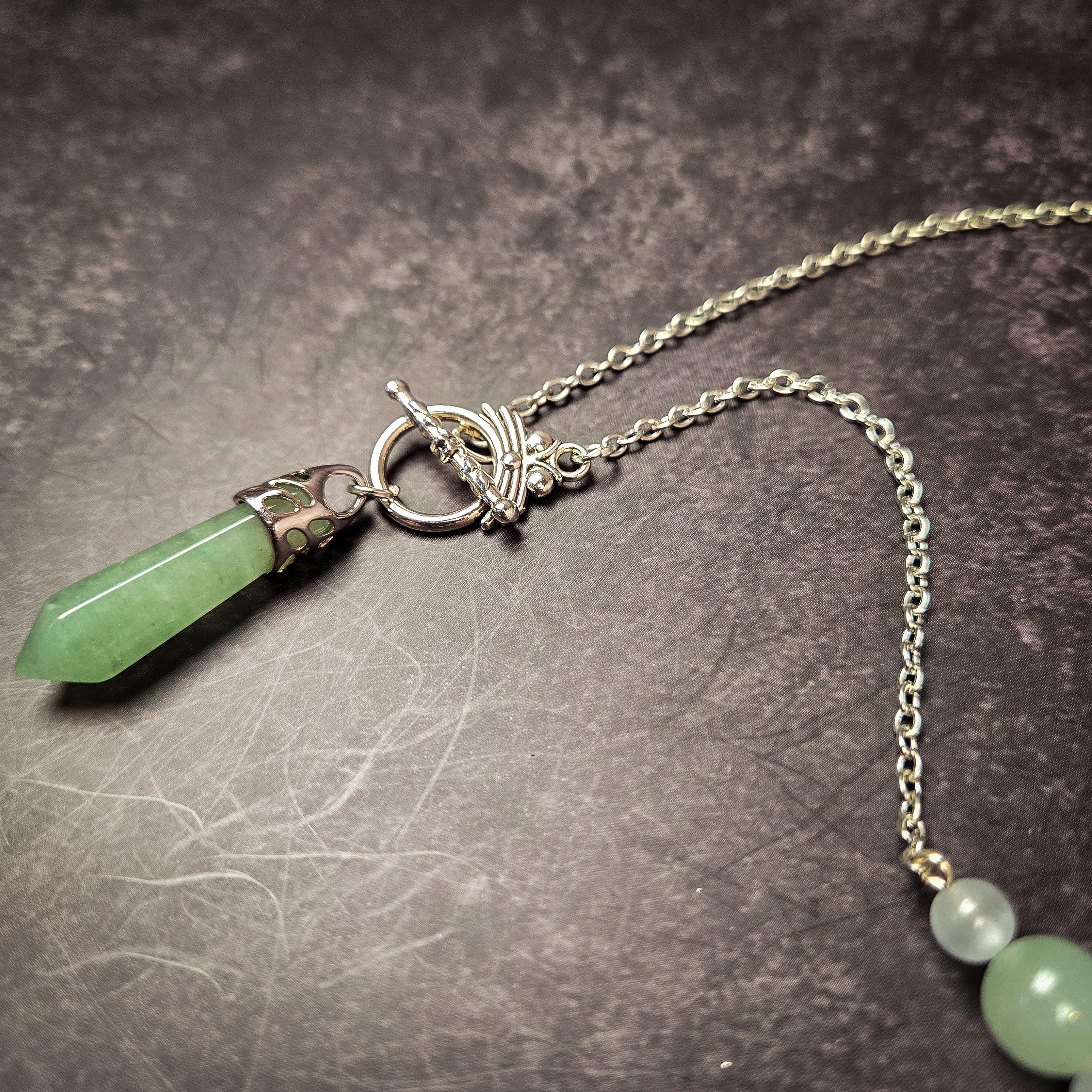 This pendulum necklace features a polished green aventurine pendulum point, accented with green aventurine and selenite beads, and suspended from a silver-tone chain. Both beautiful and functional, this piece can be worn as jewelry or used as a divination tool whenever guidance is needed.