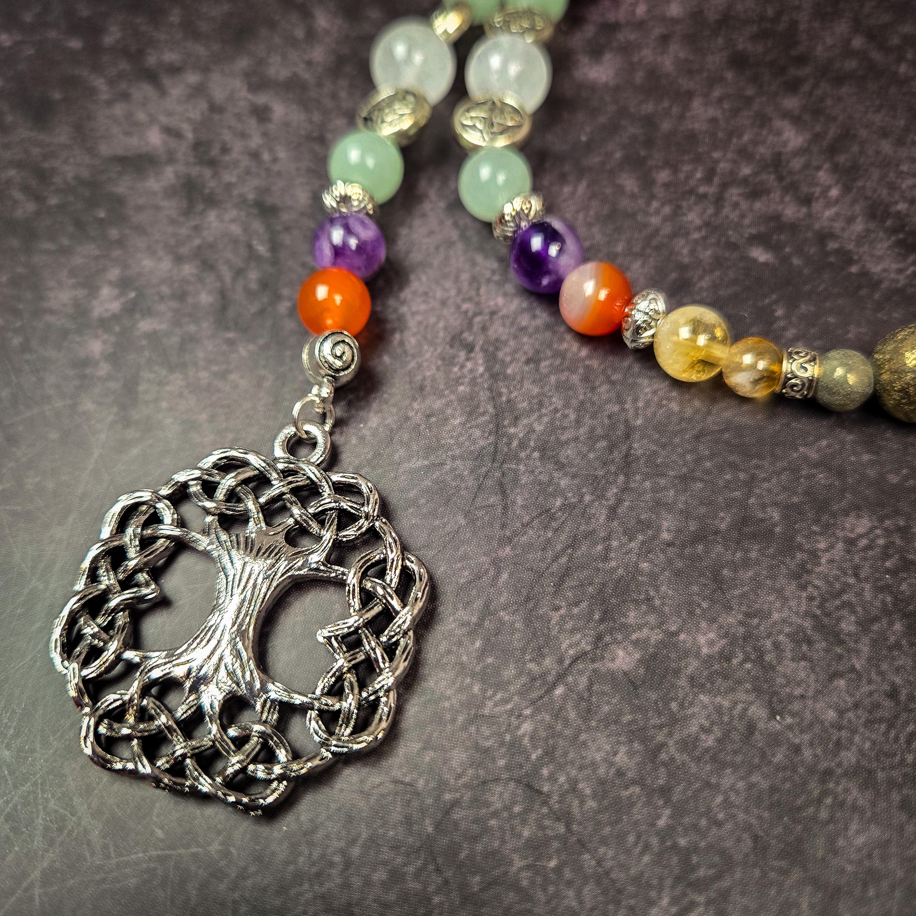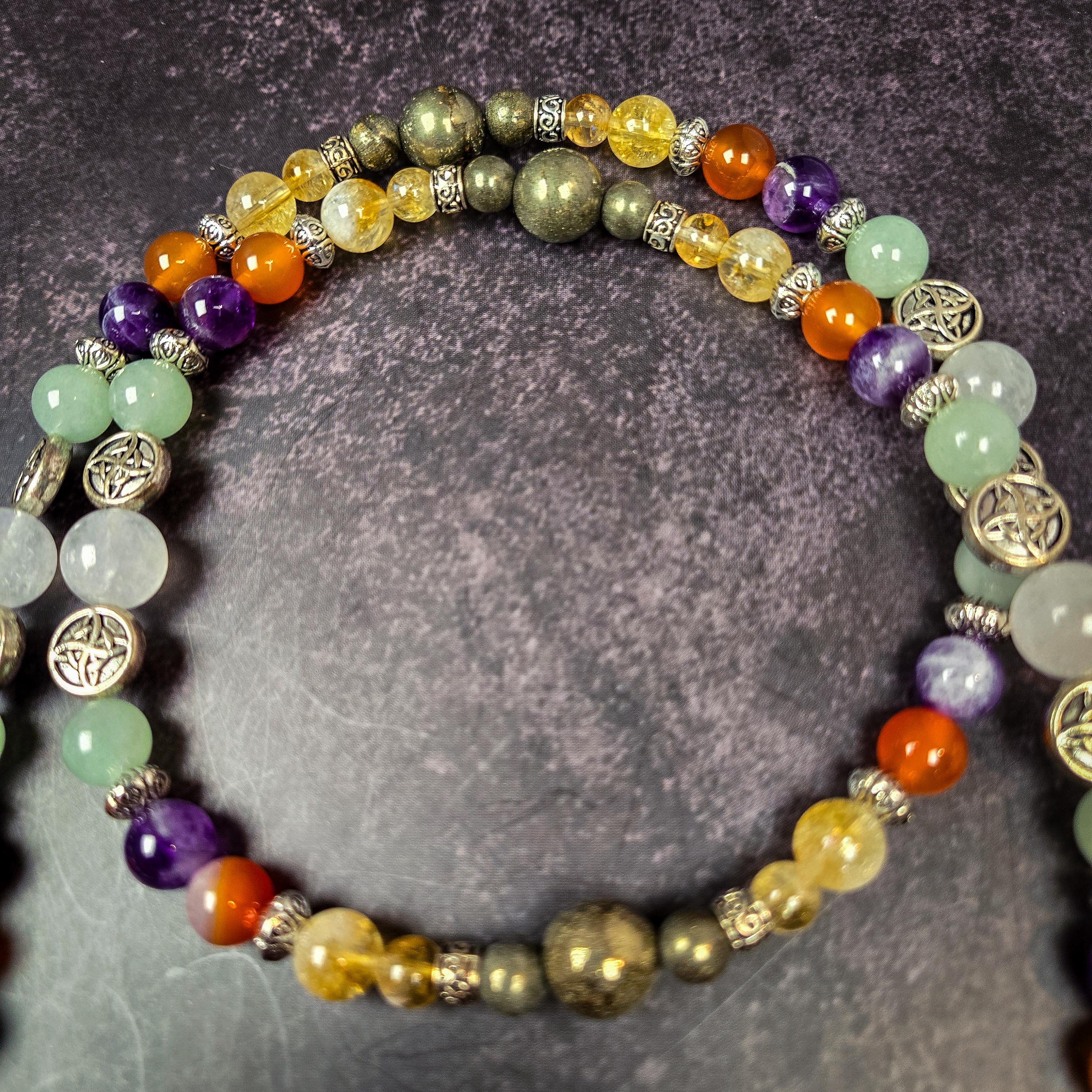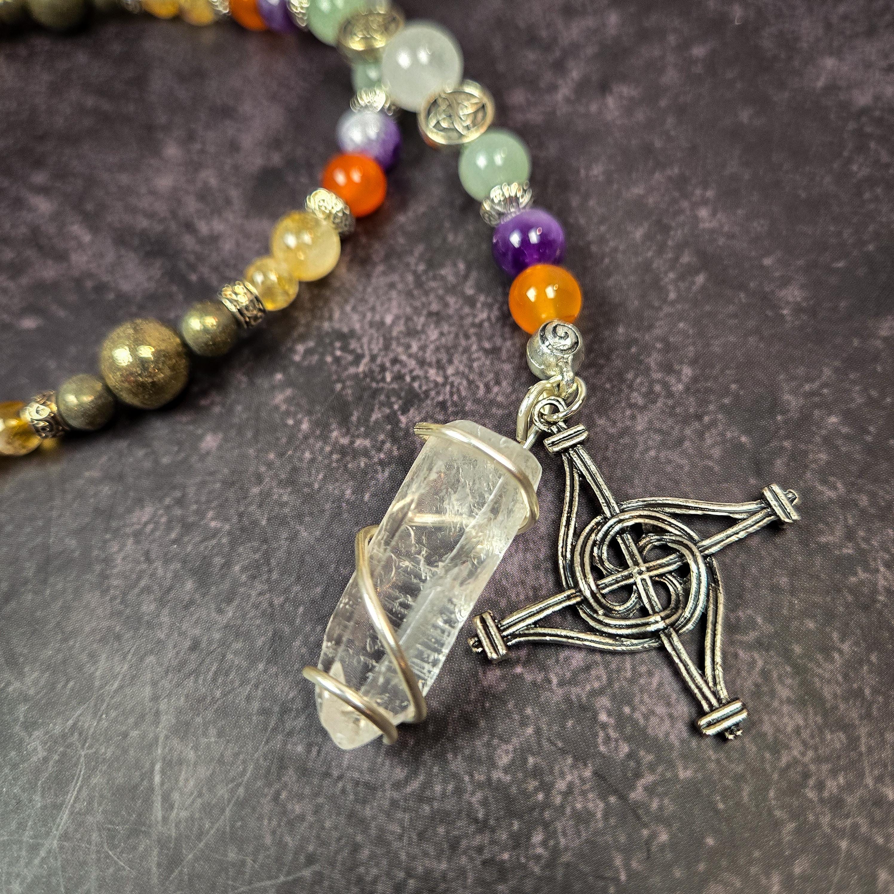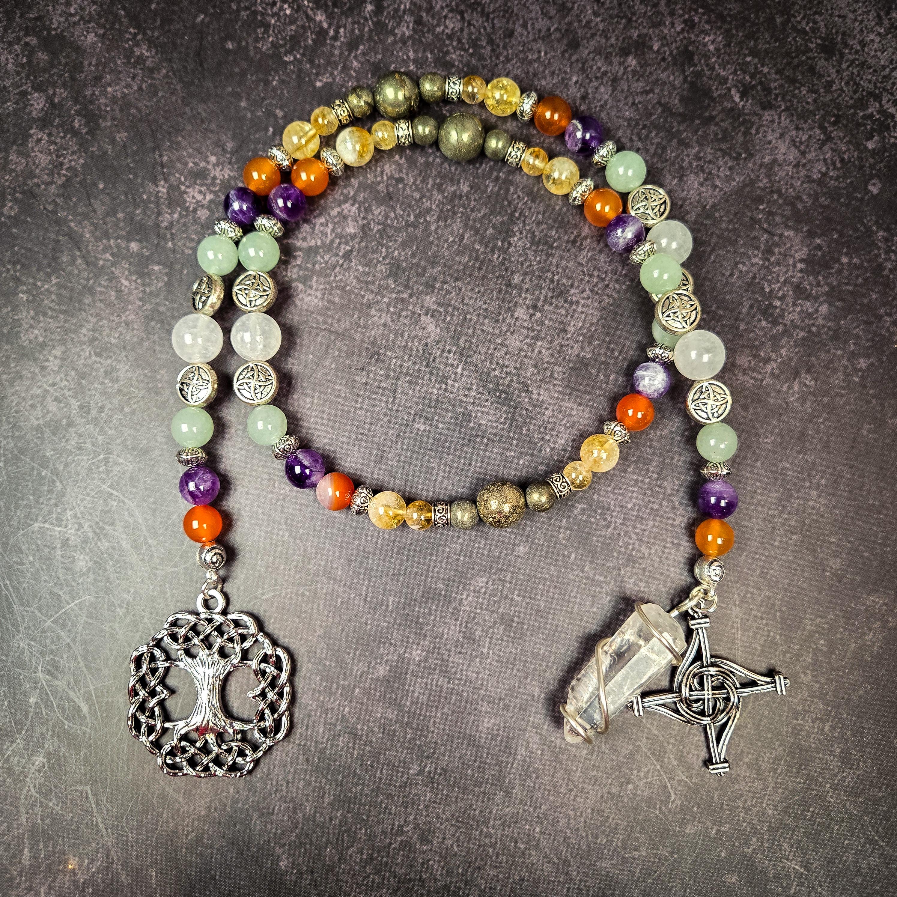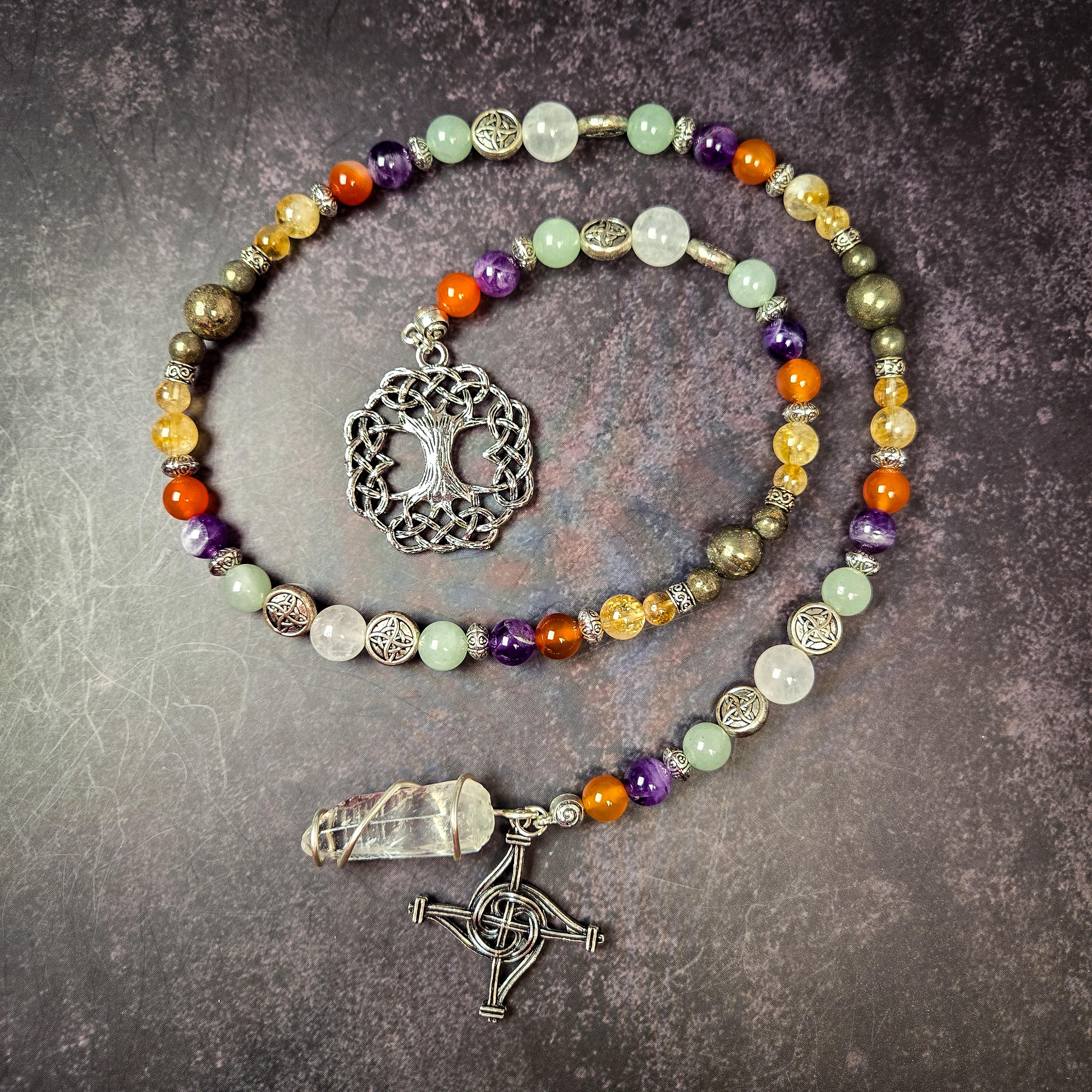 These handcrafted prayer beads honor the Celtic goddess Brigid, a symbol of healing, creativity, and inspiration. Made with a vibrant combination of carnelian, citrine, green aventurine, and clear quartz, this set is a powerful tool for connecting with Brigid's fiery energy and nurturing light.