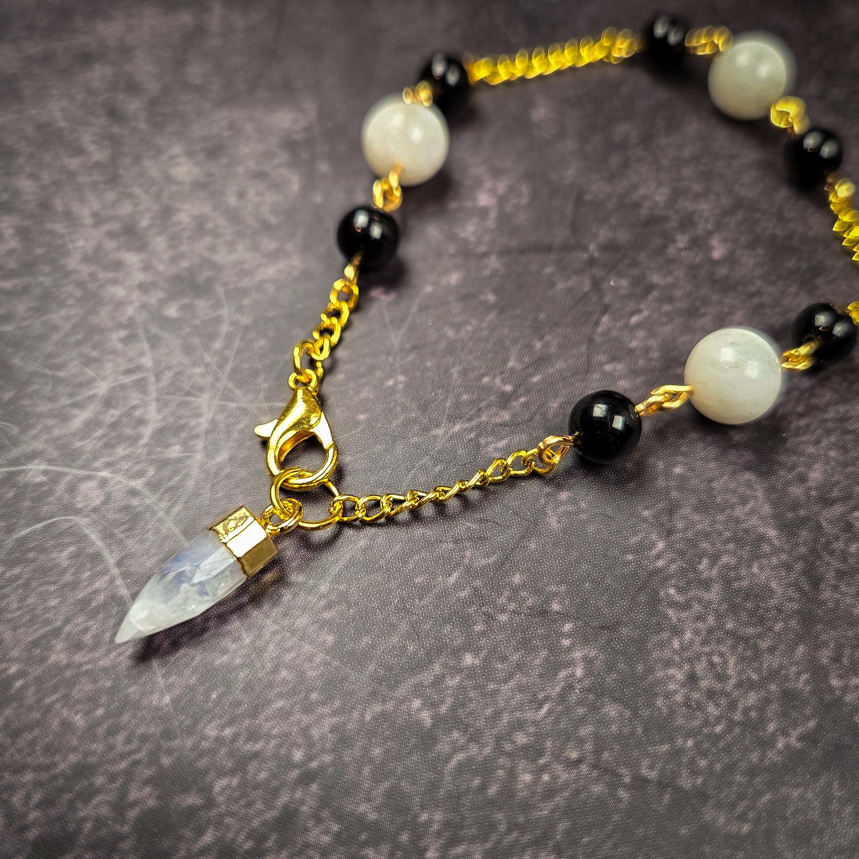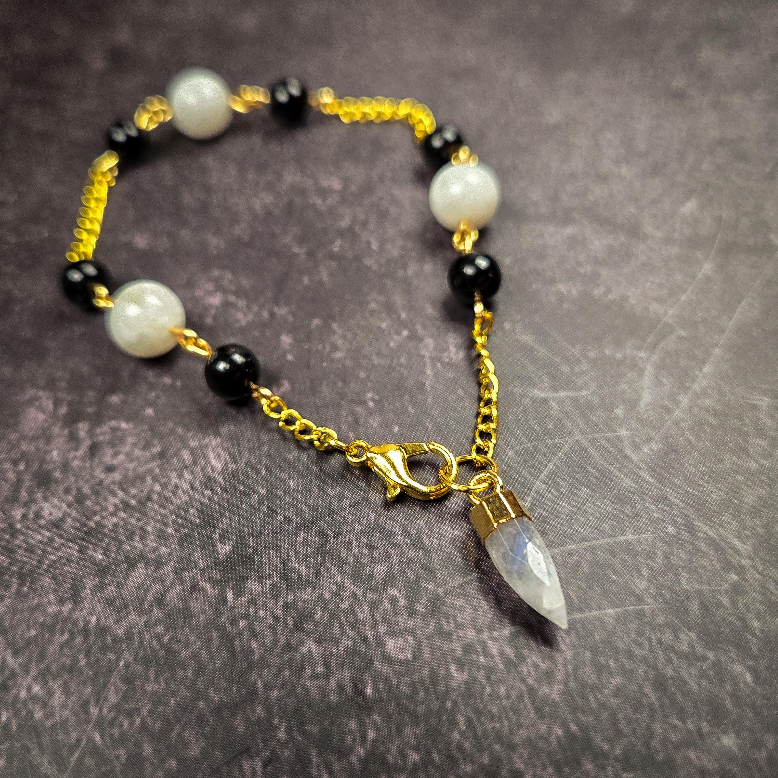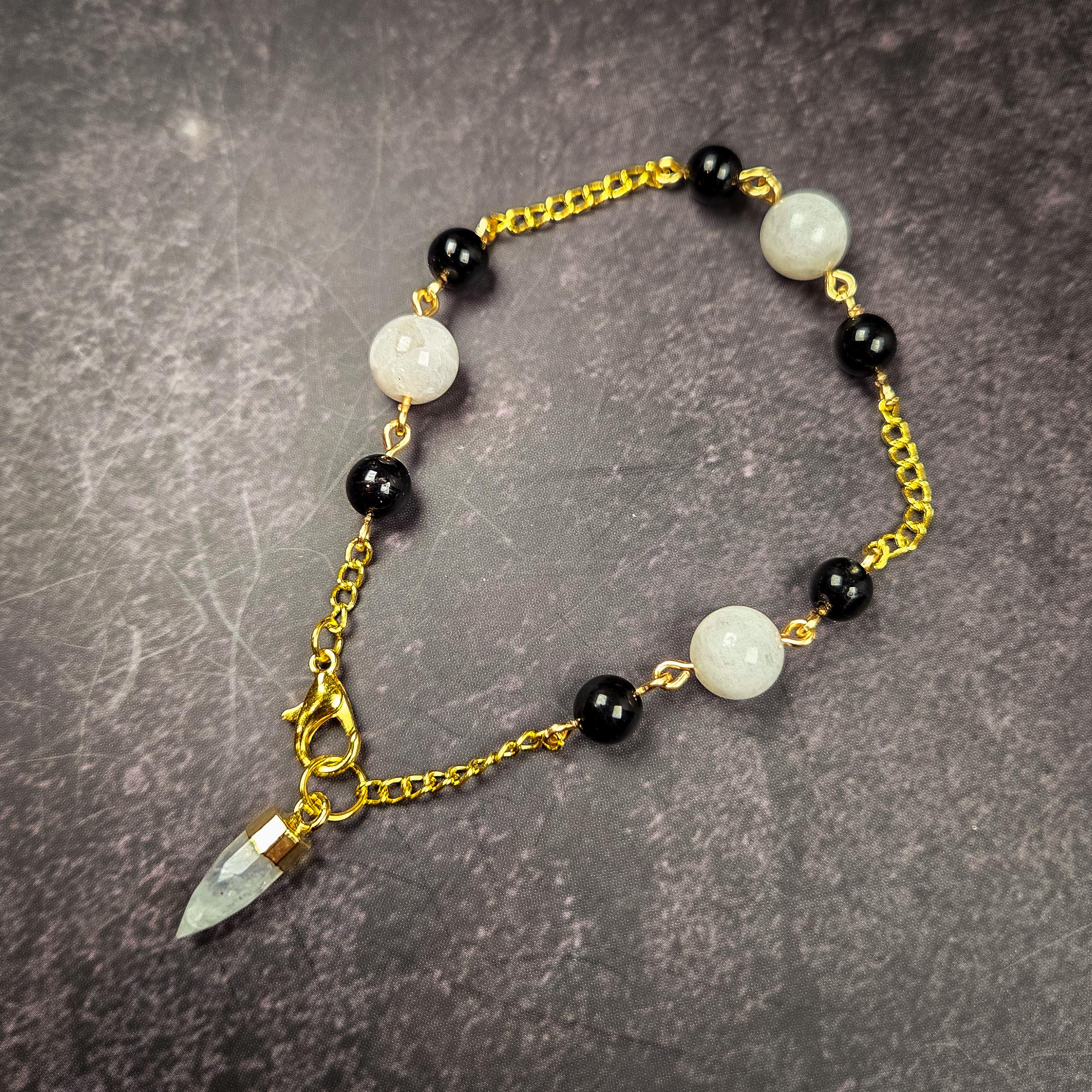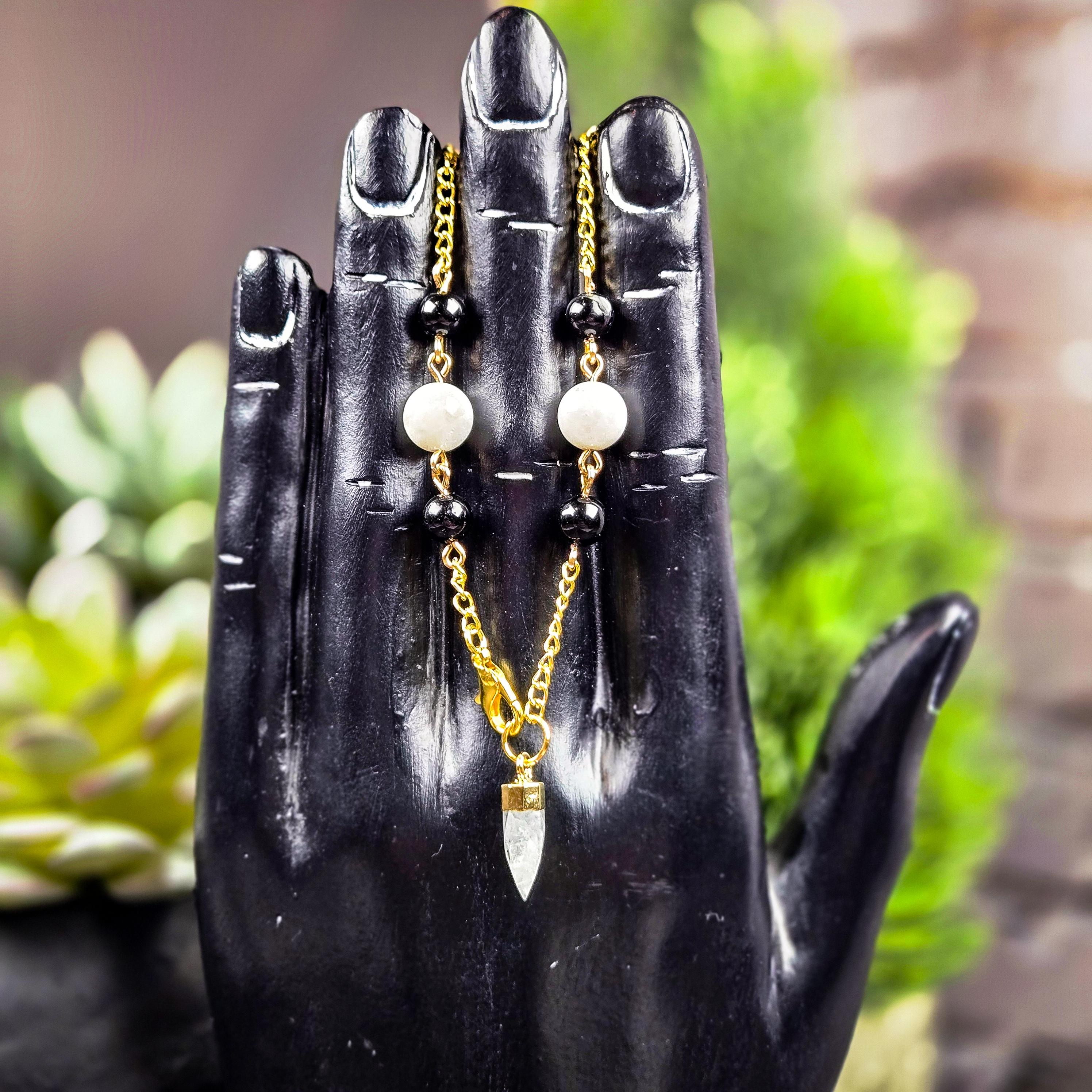 This Moonstone & Black Tourmaline Pendulum Bracelet is a balance of intuition and protection, light and shadow. Featuring a moonstone pendulum point accented with moonstone and black tourmaline beads on a gold-tone chain, this wearable divination tool is both elegant and energetically grounded.