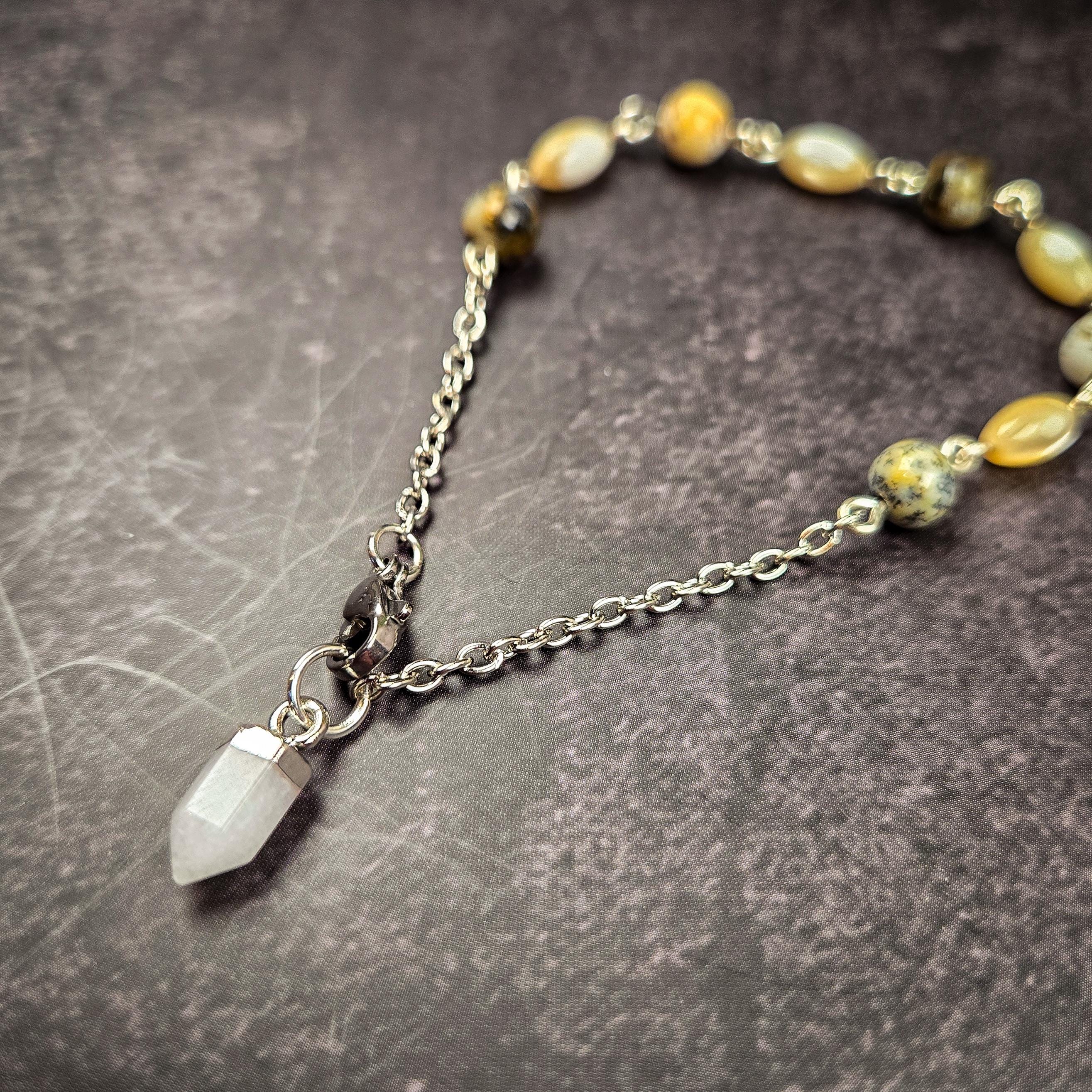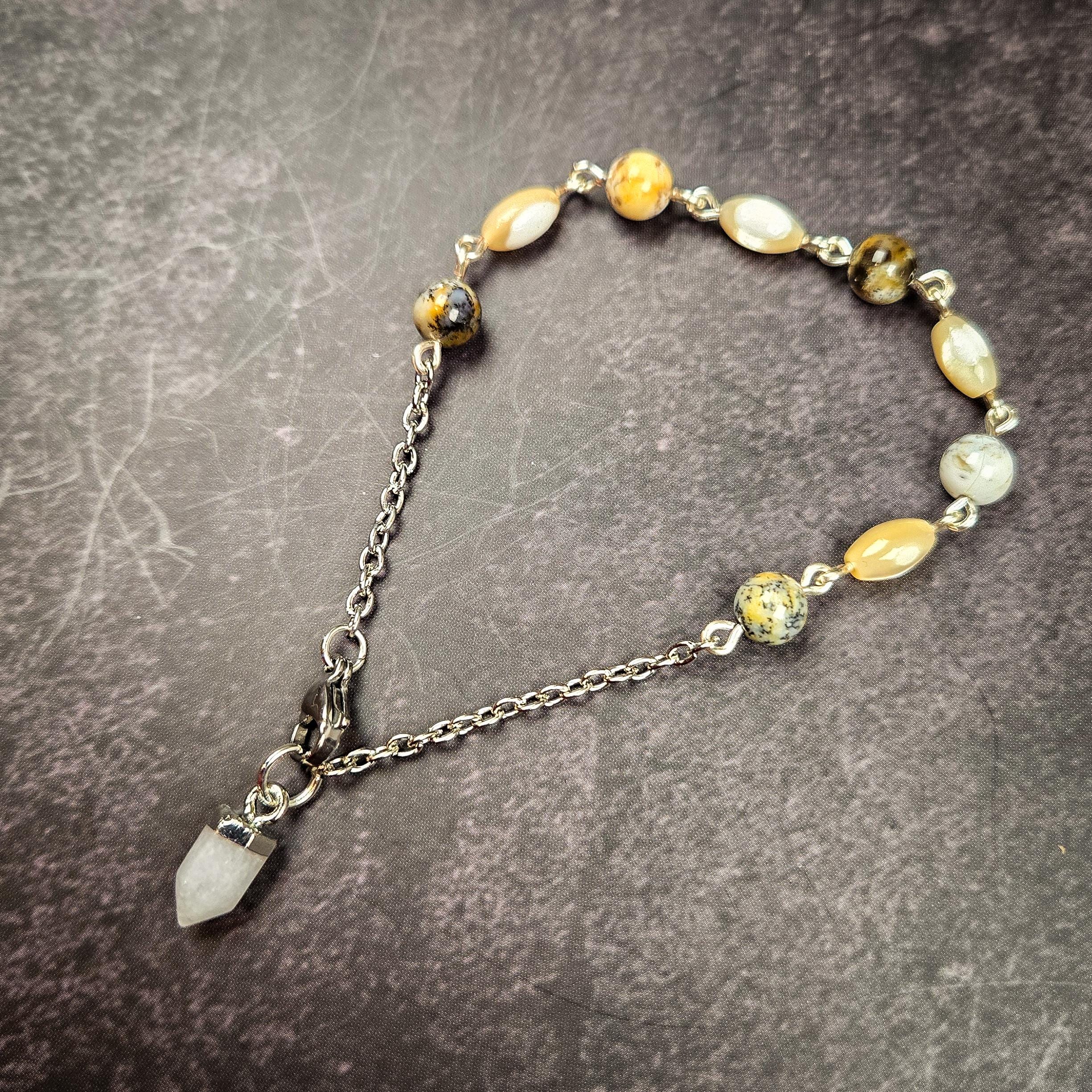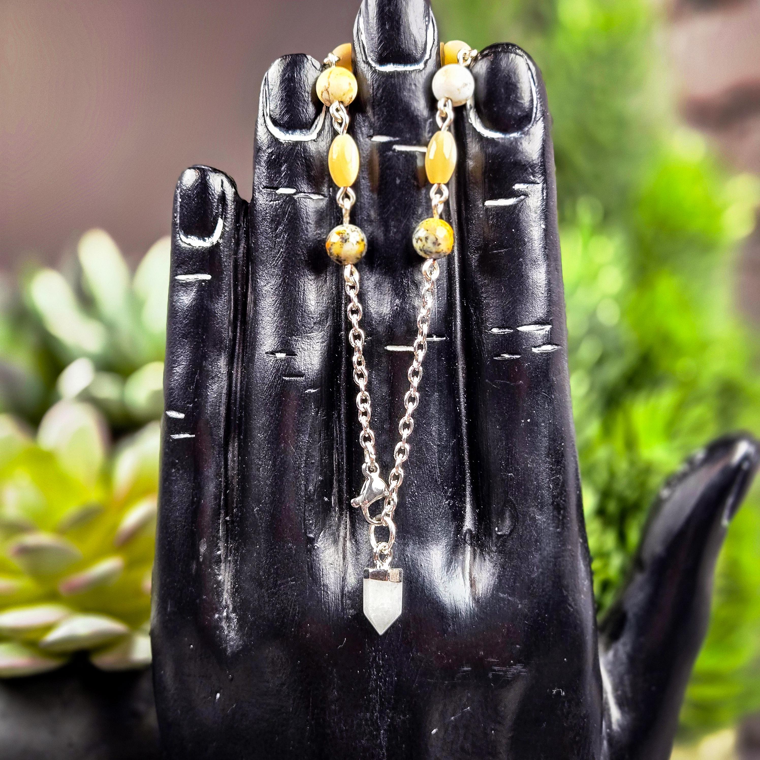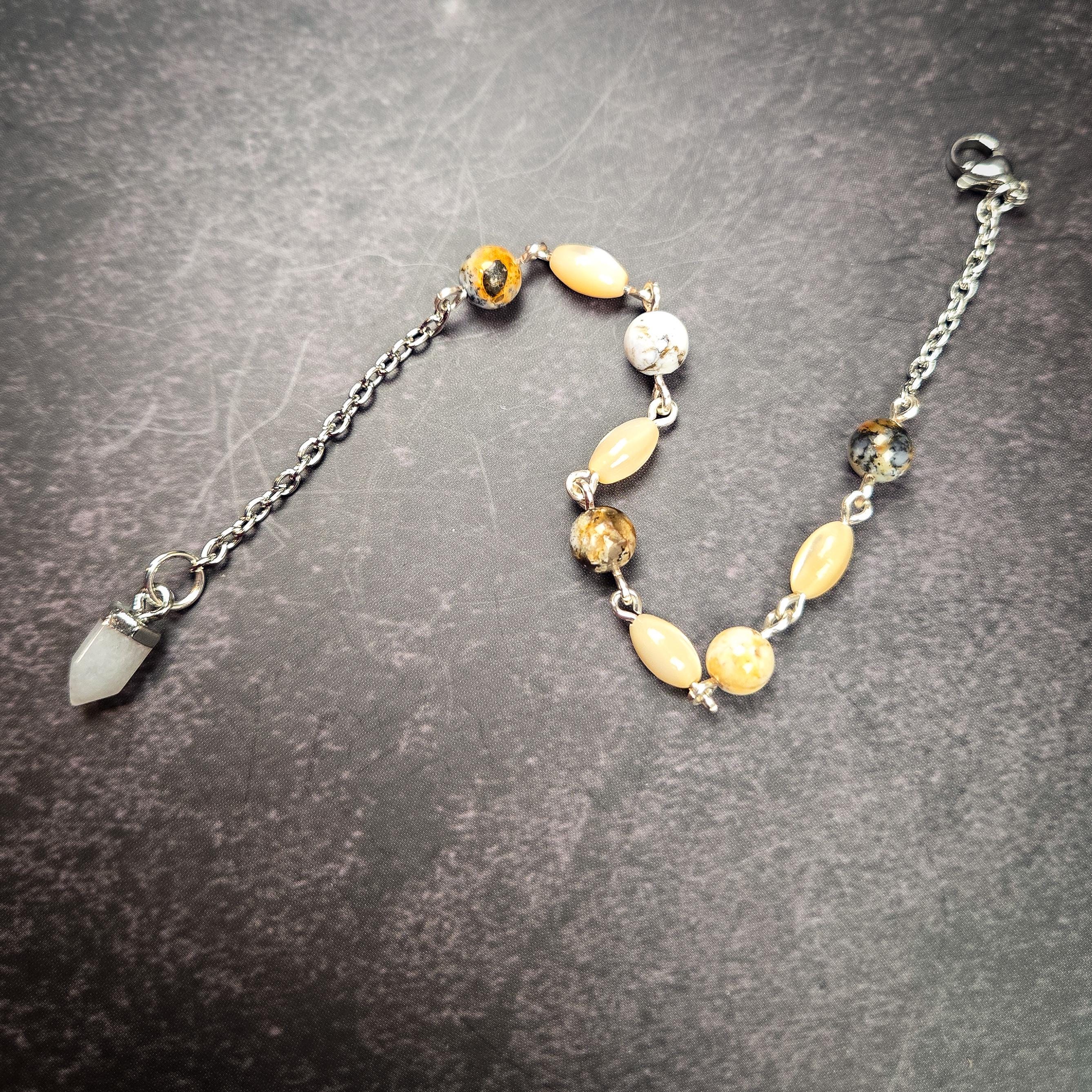 This White Quartz Pendulum Bracelet is a radiant blend of clarity, intuition, and subtle iridescent depth. Featuring a white quartz pendulum point accented with black opal and mother-of-pearl shell beads on a silver-tone chain, this wearable divination tool carries both light and mystery.
