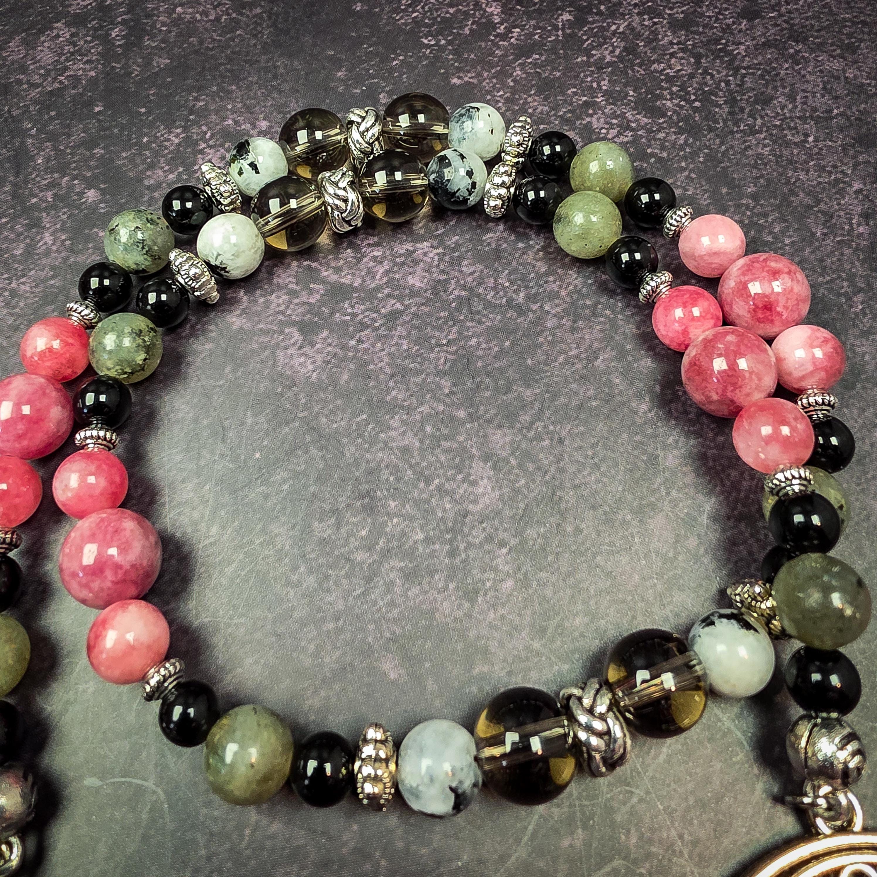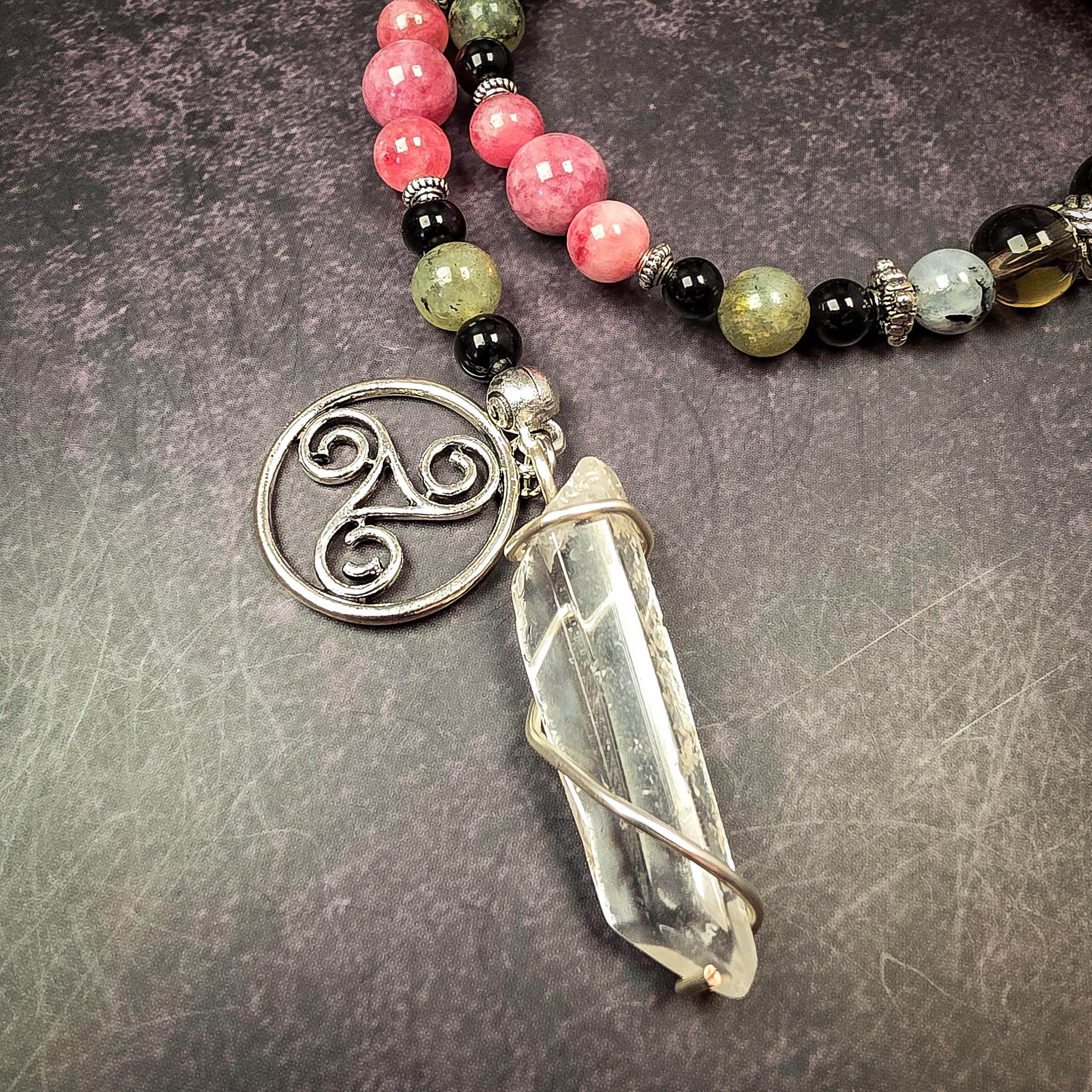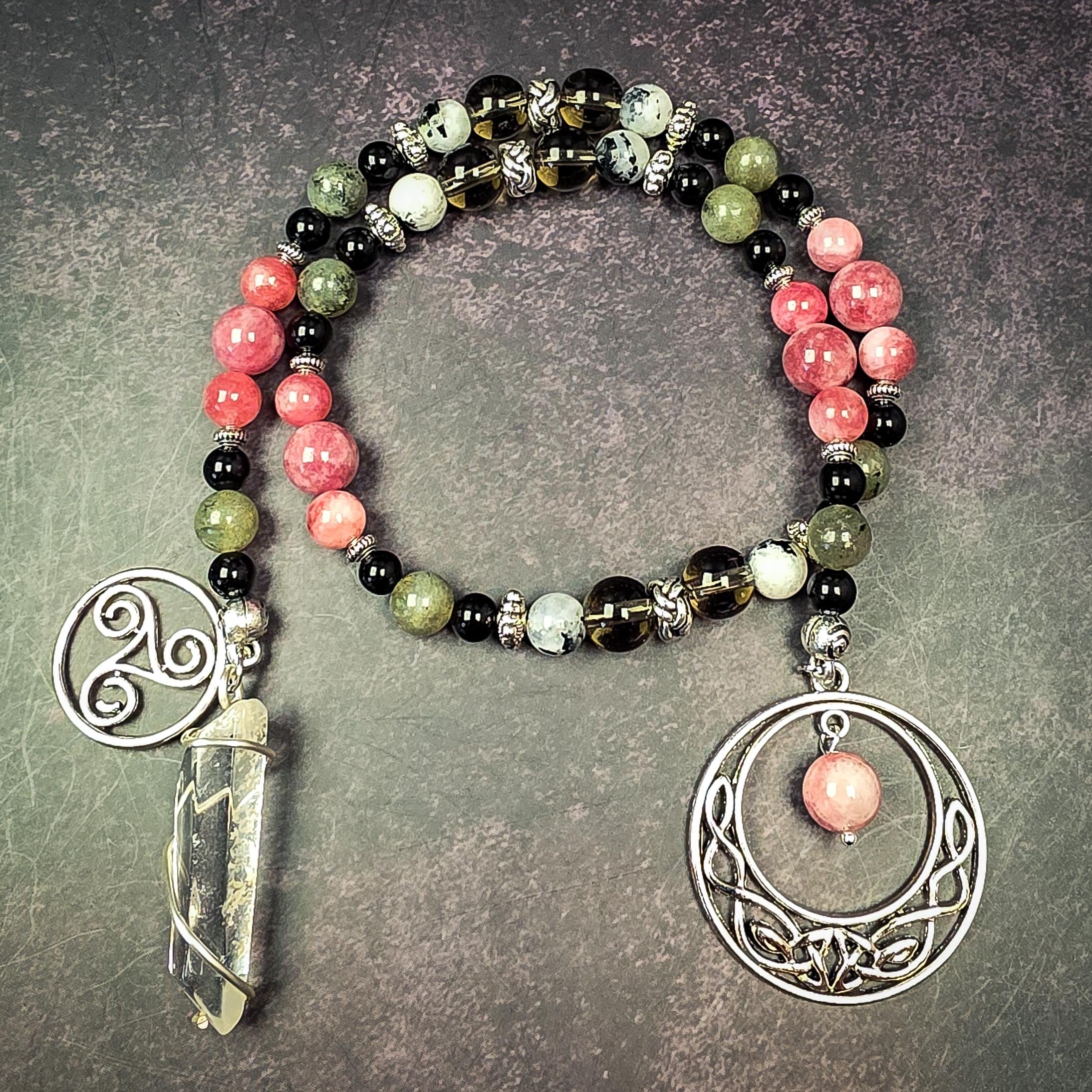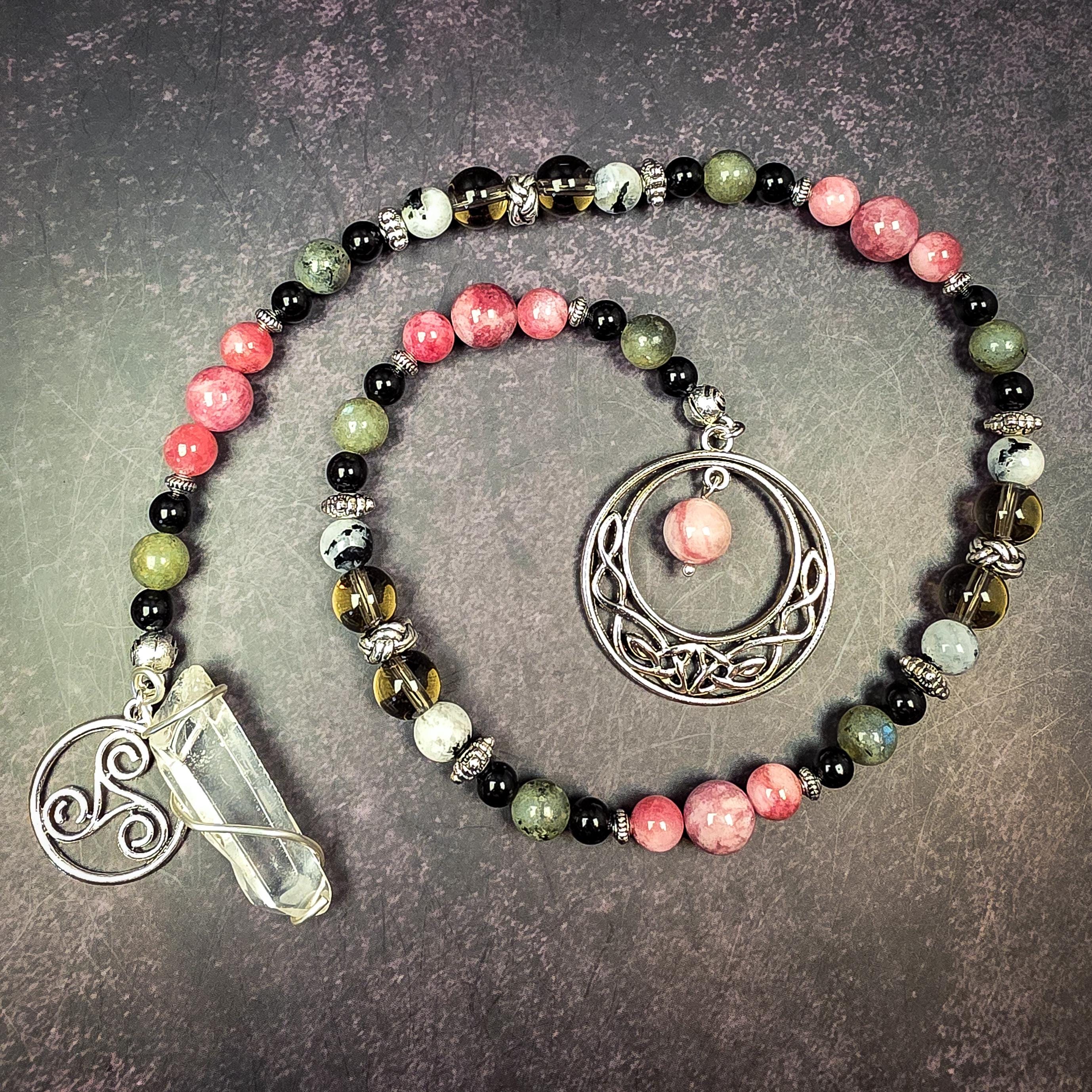 These prayer beads were created in honor of Cerridwen, the Celtic goddess of transformation, wisdom, and inspiration. Keeper of the sacred cauldron, she presides over the cycles of death and rebirth, creativity, and divine knowledge. This set embodies her alchemy—the dance between light and shadow, intuition and intellect, mystery and revelation.