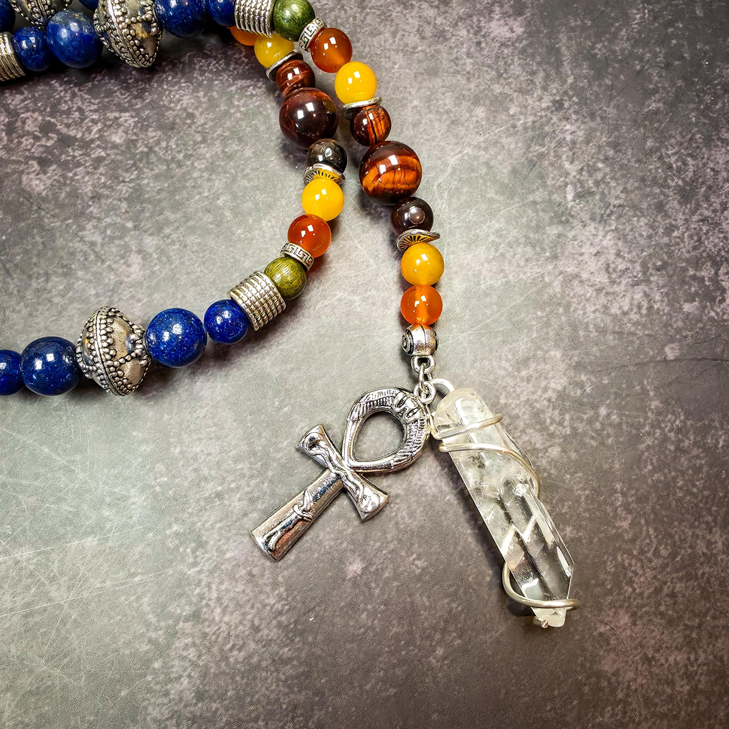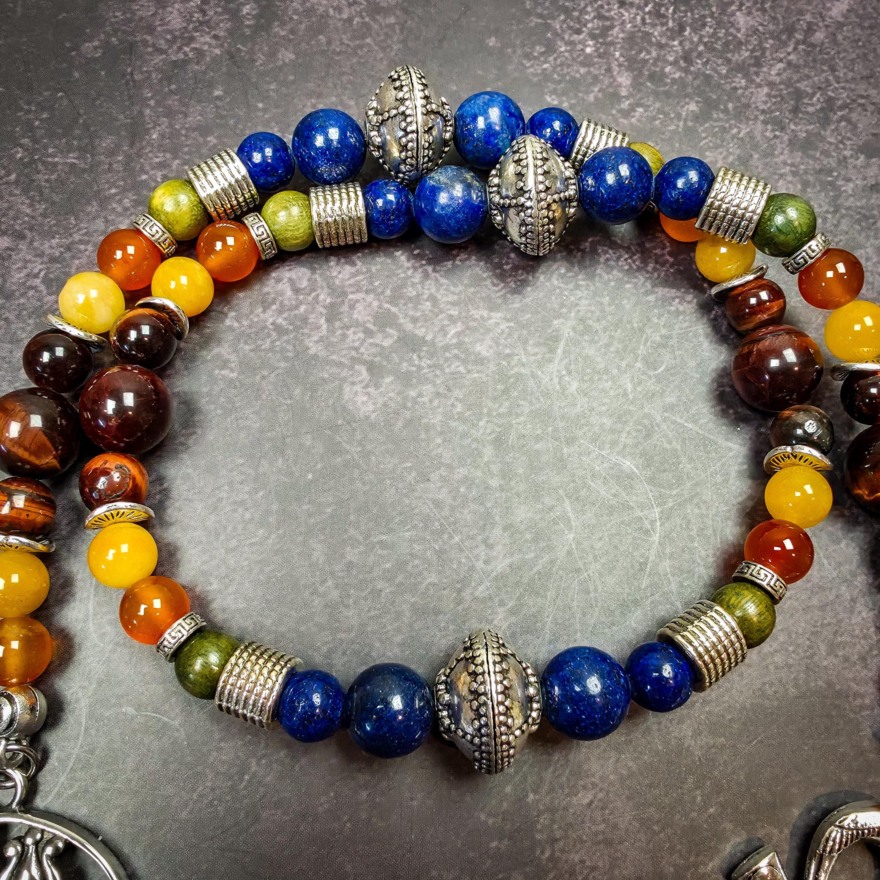 This strand features lapis lazuli, citrine, red tiger’s eye, yellow topaz, and green sandalwood, each chosen for qualities that align with his energy.