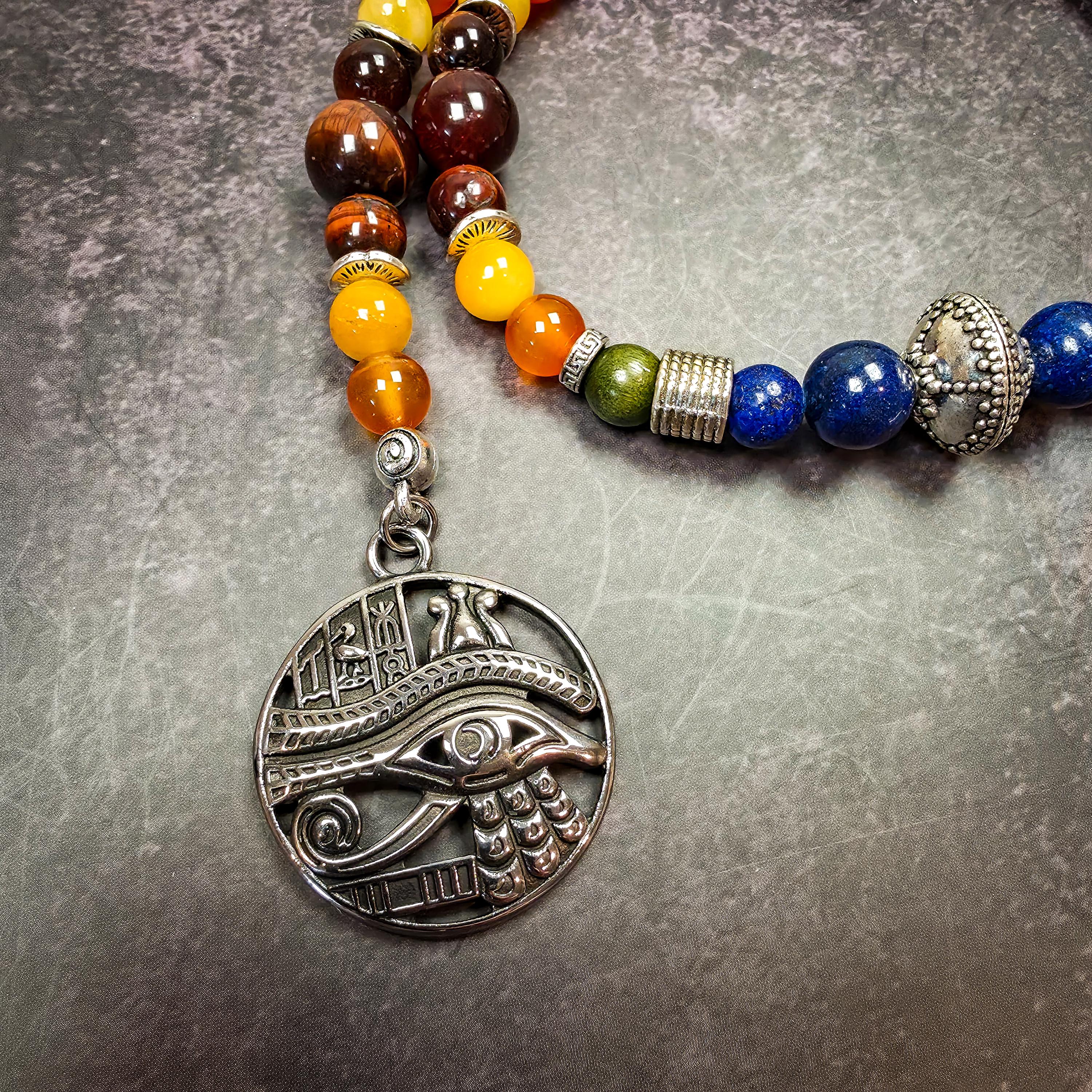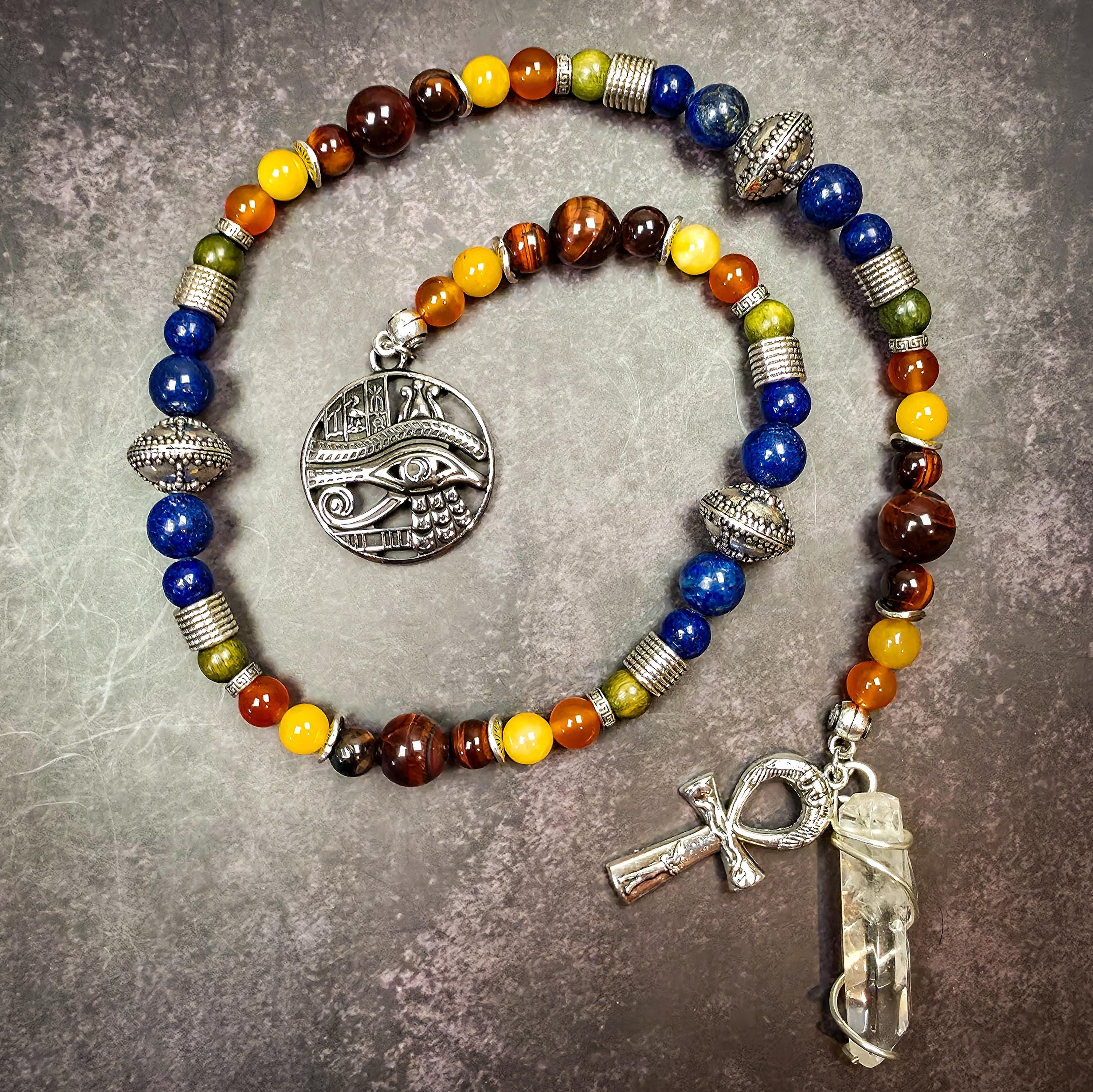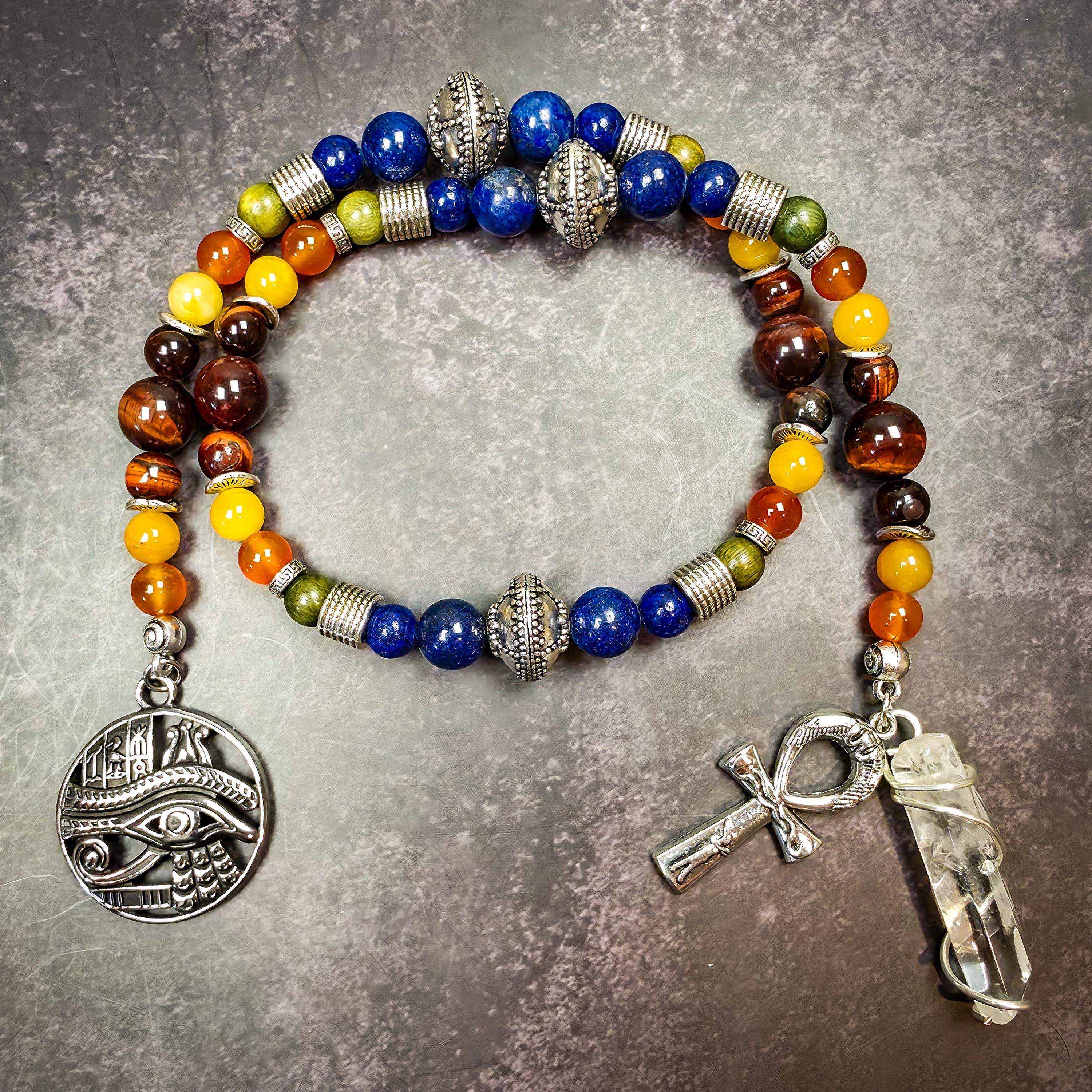 Created in honor of Ra, these devotional prayer beads are designed to reflect solar power, divine authority, illumination, and life-giving force. In ancient Egyptian tradition, Ra embodies creation, vitality, sovereignty, and the eternal cycle of renewal, making him a powerful figure for prayer, meditation, ritual, or altar devotion.