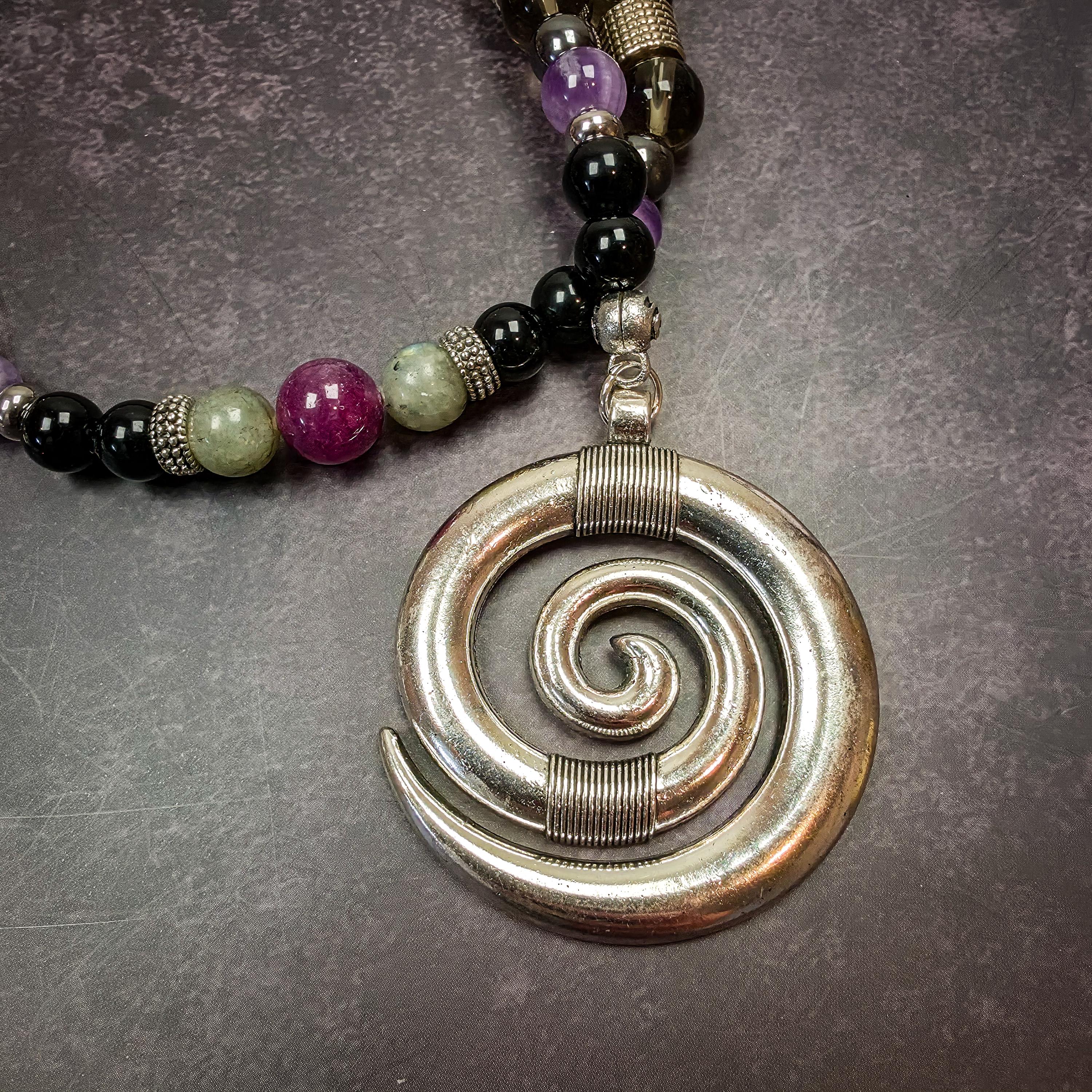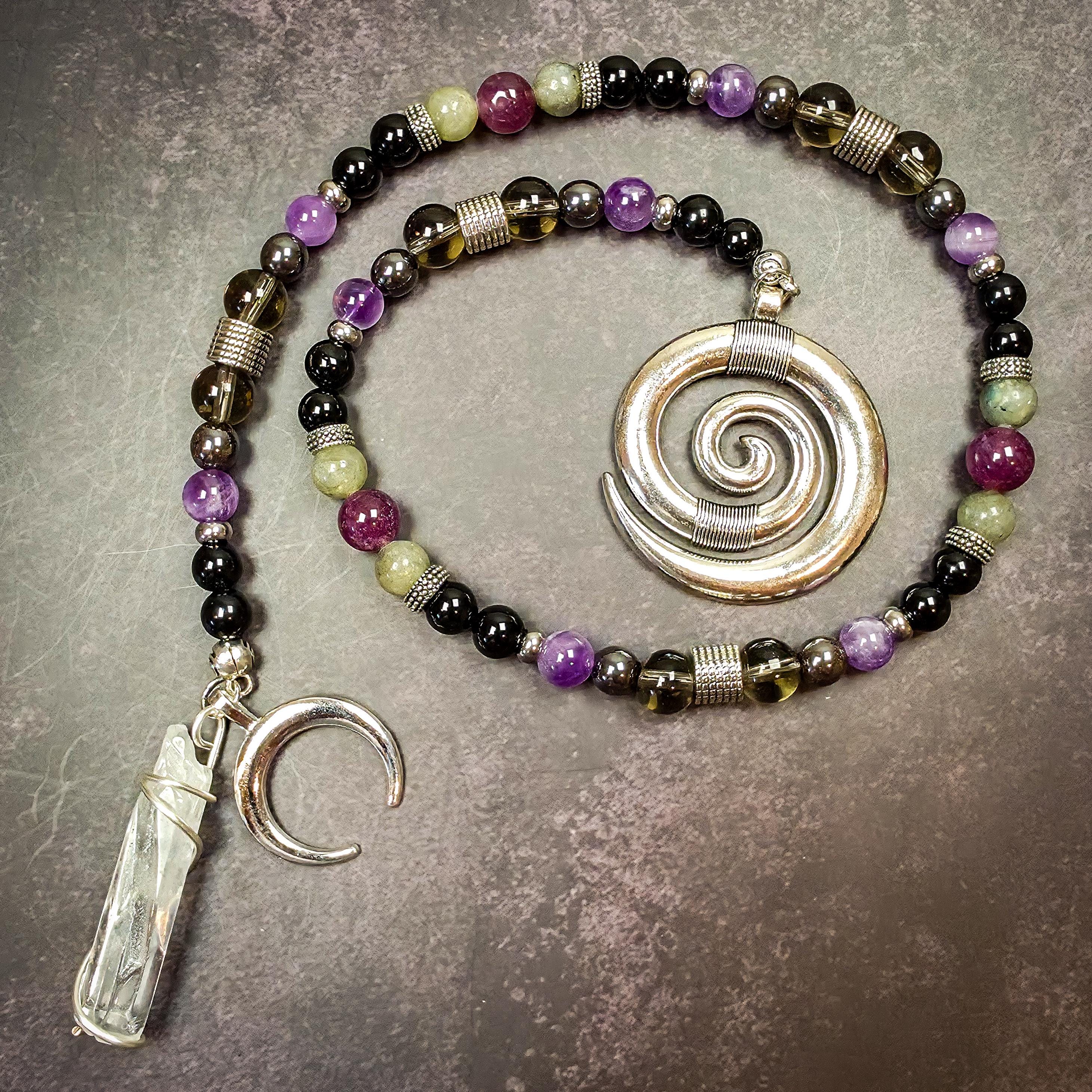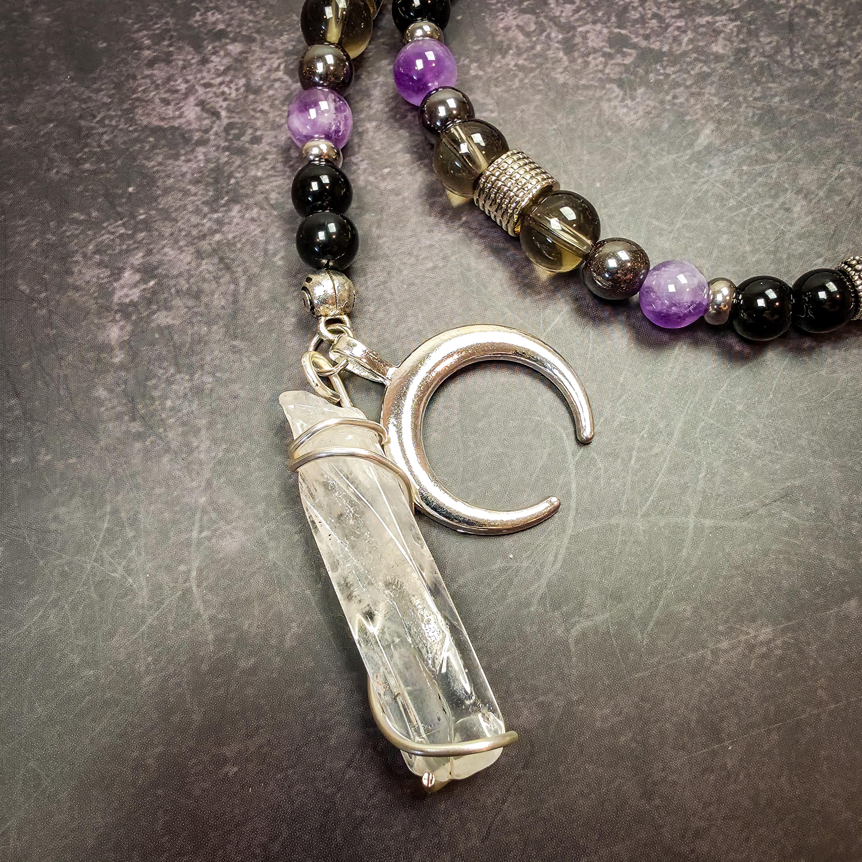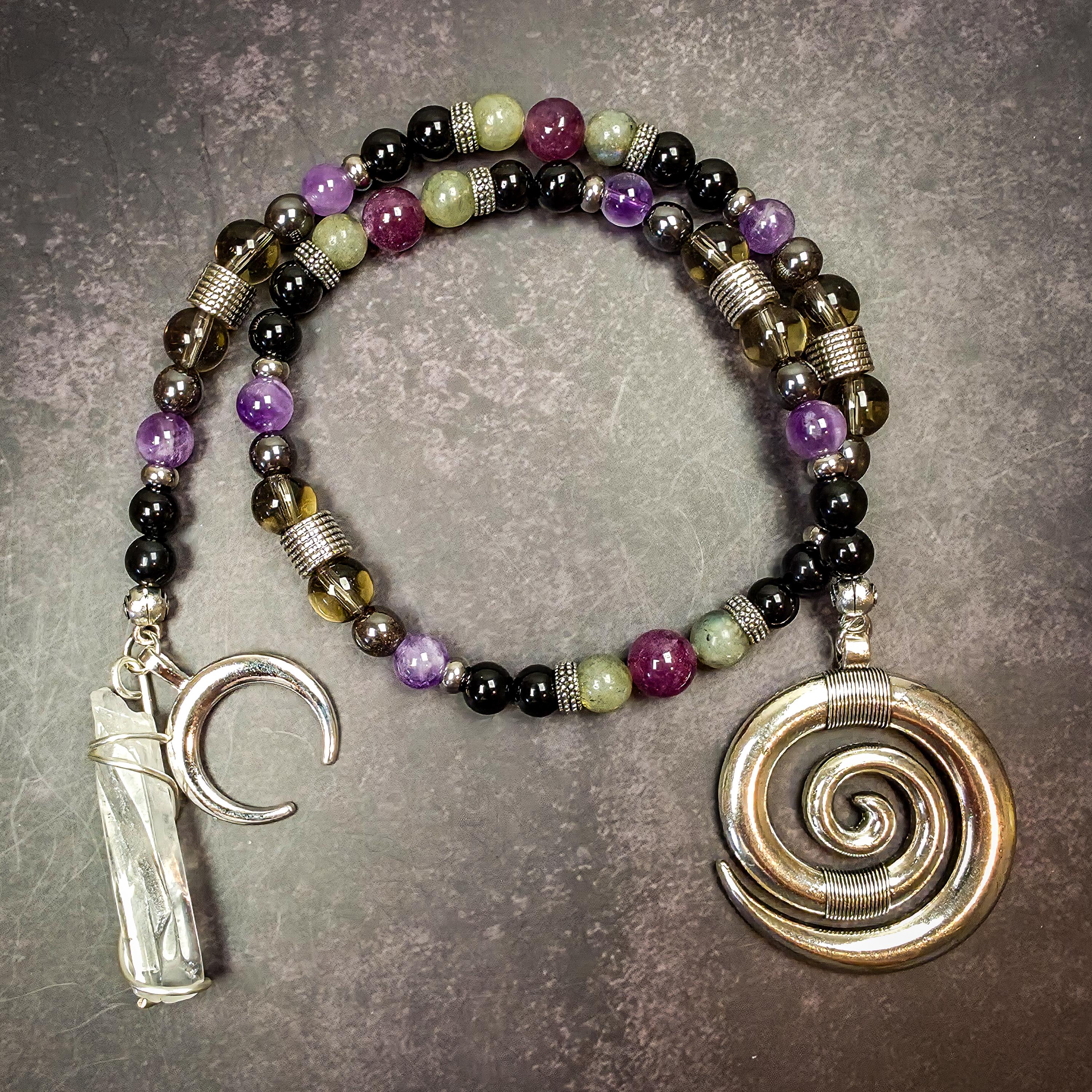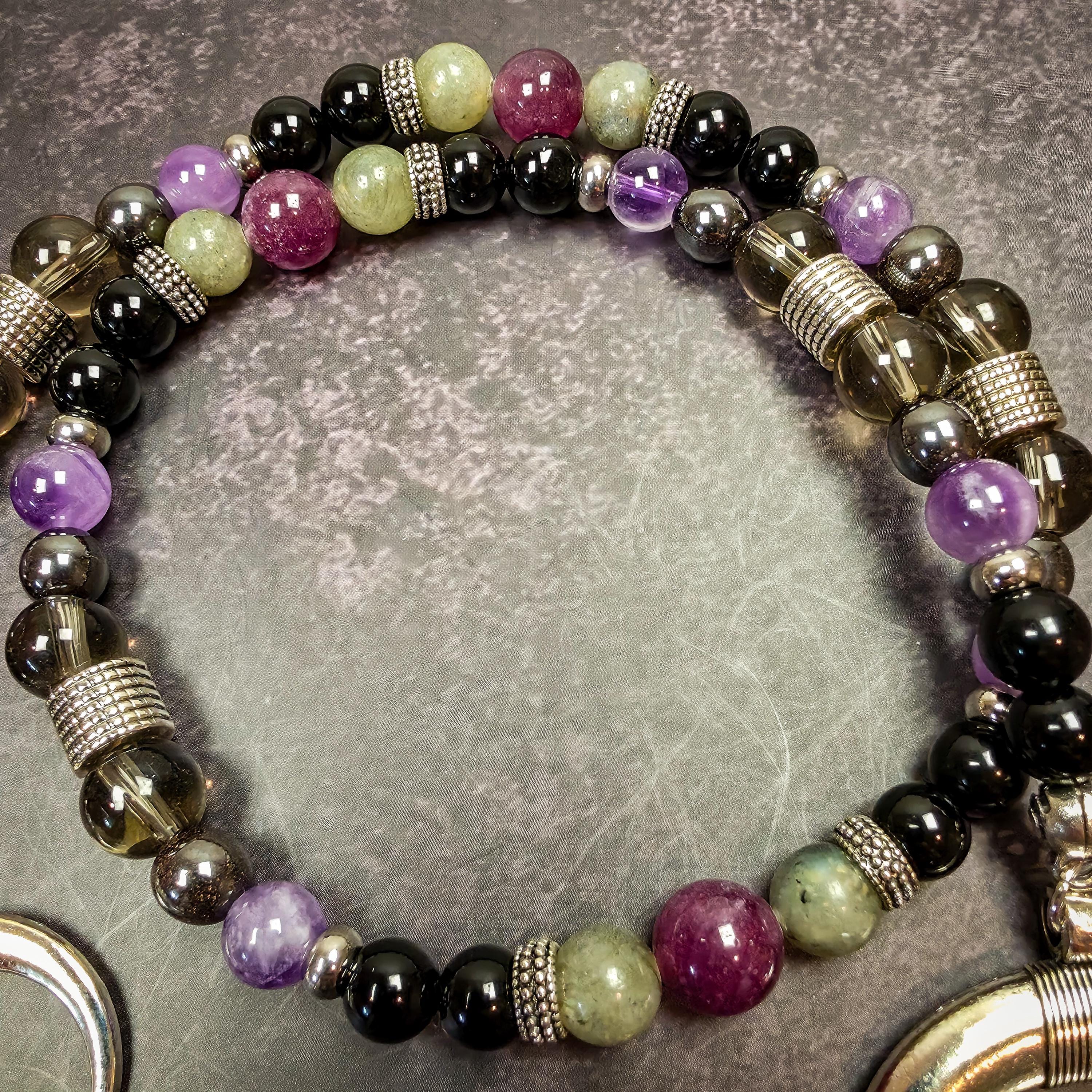 This strand features lepidolite, labradorite, obsidian, amethyst, hematite, and smoky quartz, each selected for qualities that align with his energy.
